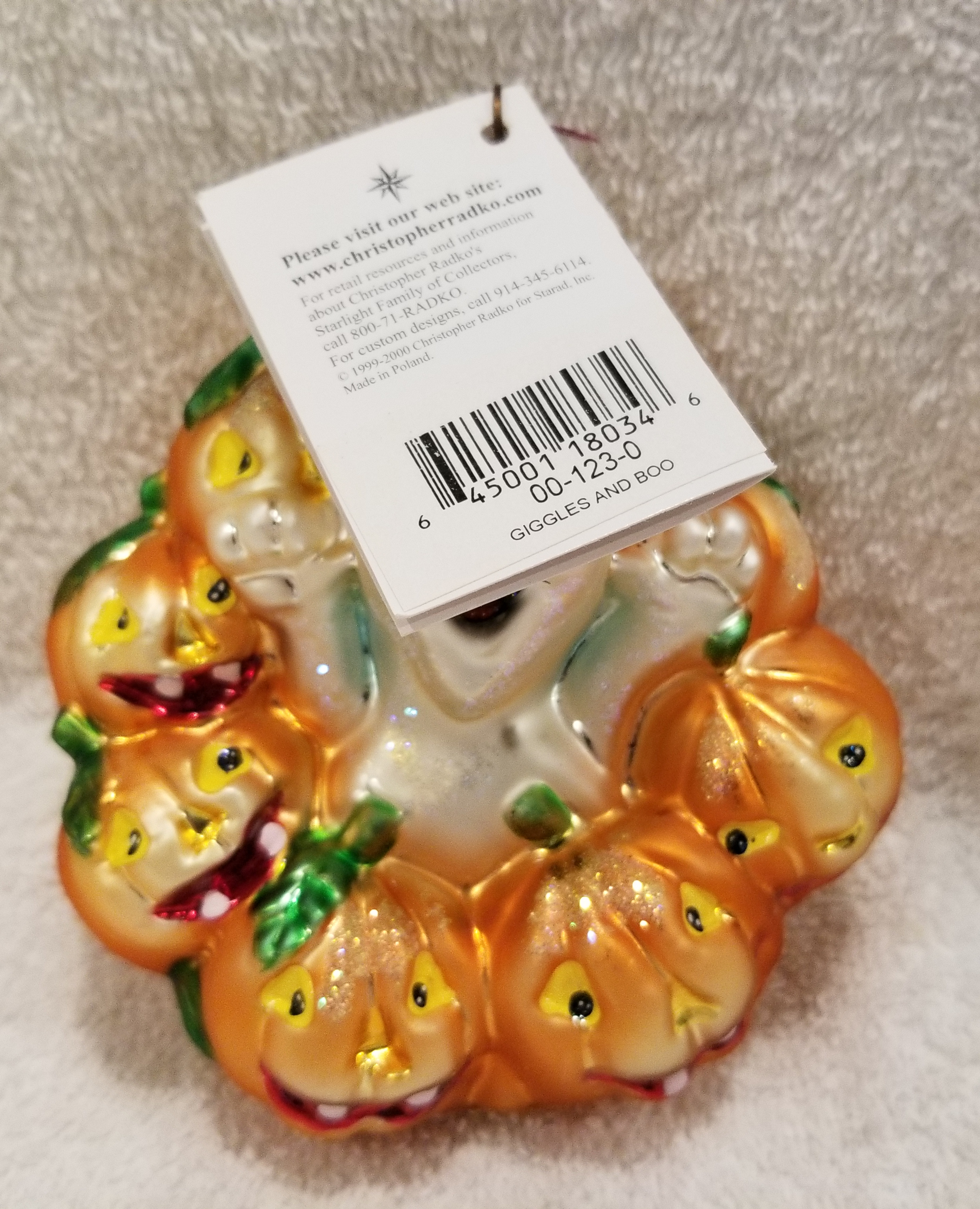 | This week I'm listing Halloween ornaments I just received! This one is Giggles and Boo, Radko number 00-123-0. This is a larger version of the gem I will also be listing. This is the 4" version, the gem is the 3" version. I am including a picture of both for size reference. They are otherwise identical to my eyes. The original metal charm and paper tag are still attached. I'm asking $40 plus shipping via Pirate Ship however you prefer. |