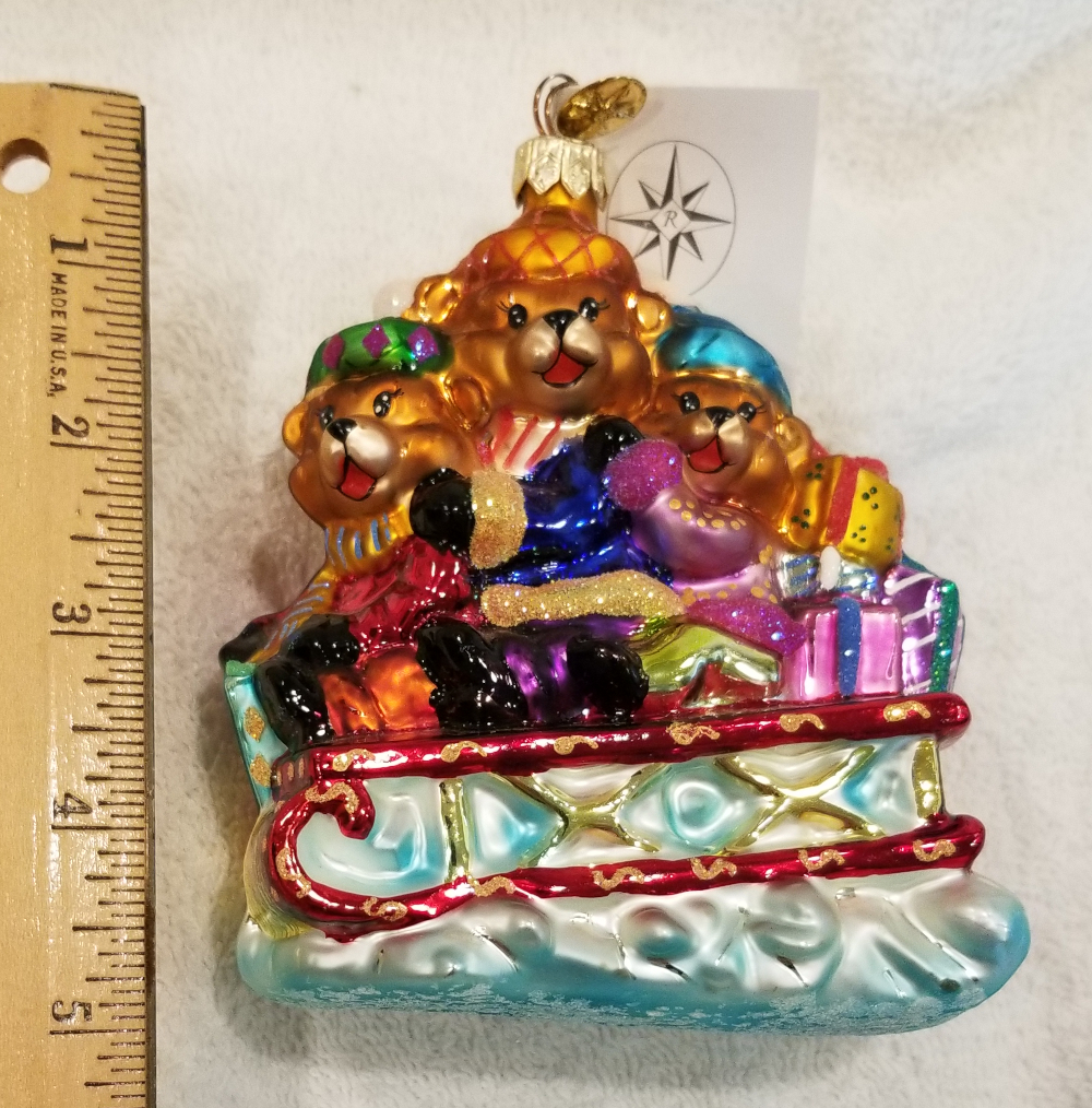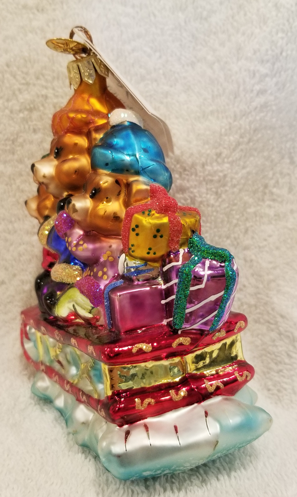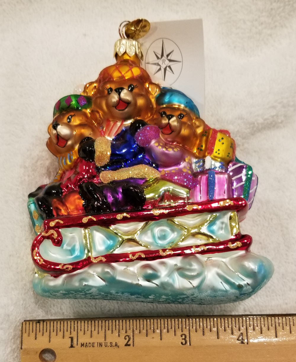 | Today I'm listing another cute bear ornament. This is Sledding Teddies, Radko number 00-217-0. This one features three smiling teddy bears riding a red and gold sled surrounded by a huge pile of pretty presents. The original metal charm and the paper tag are included. I'm asking $30 plus shipping via Pirate Ship. |