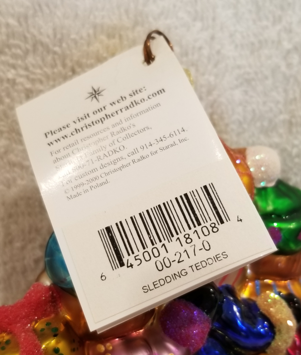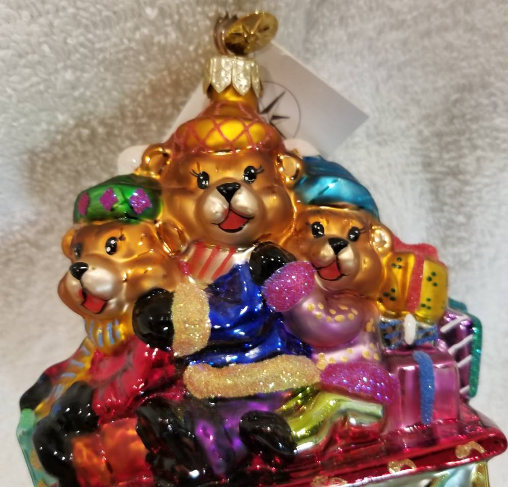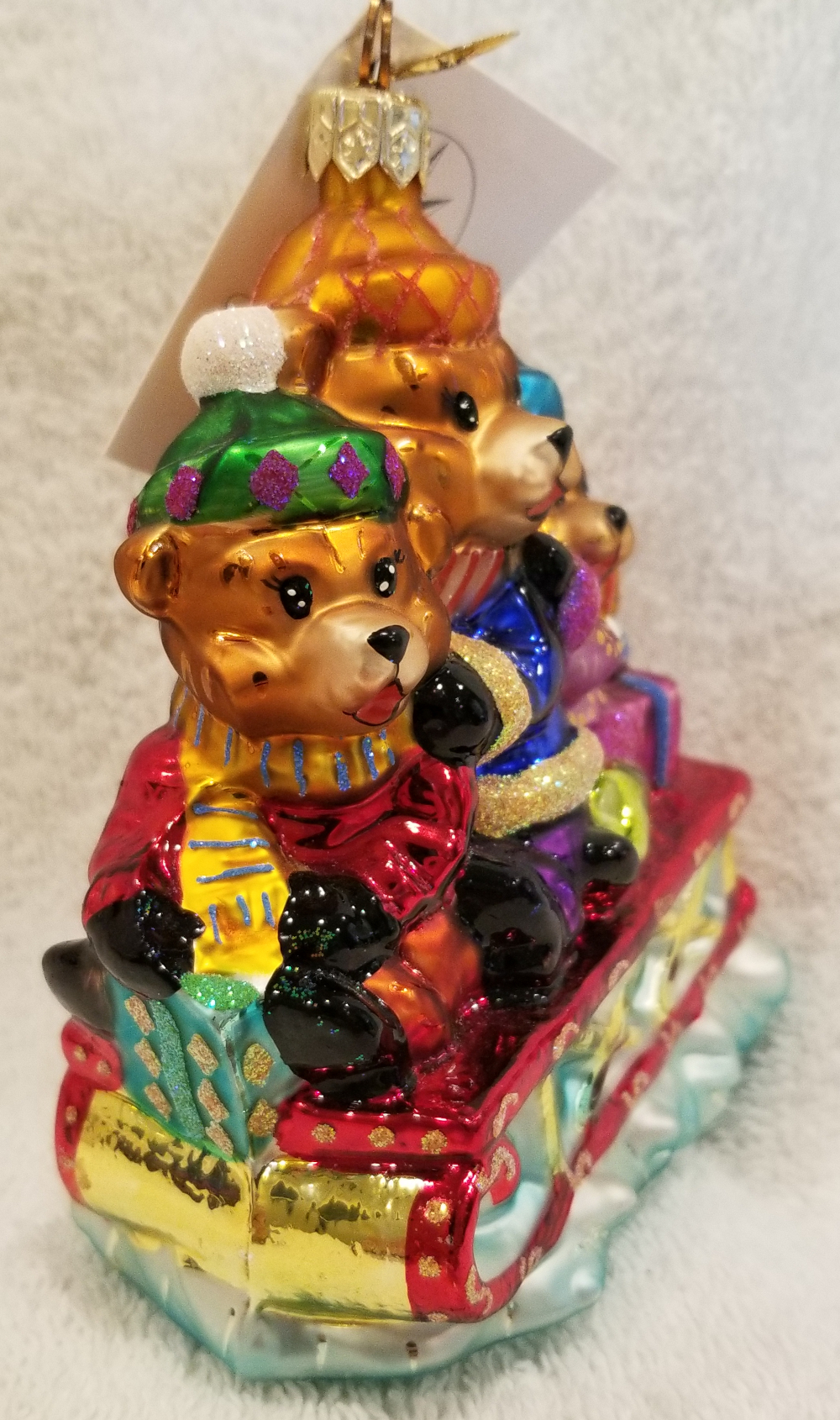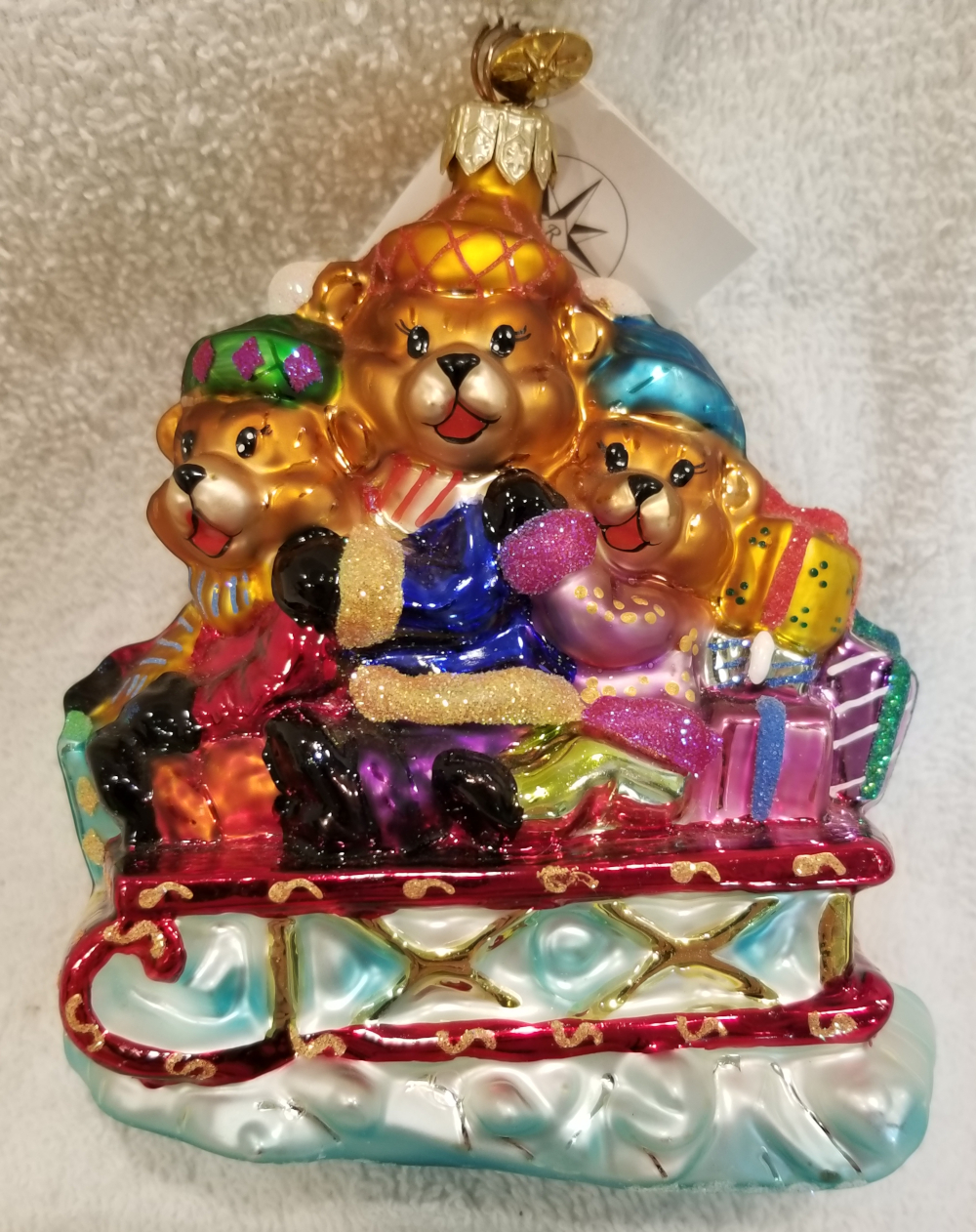 | Today I'm listing another cute bear ornament. This is Sledding Teddies, Radko number 00-217-0. This one features three smiling teddy bears riding a red and gold sled surrounded by a huge pile of pretty presents. The original metal charm and the paper tag are included. I'm asking $30 plus shipping via Pirate Ship. |