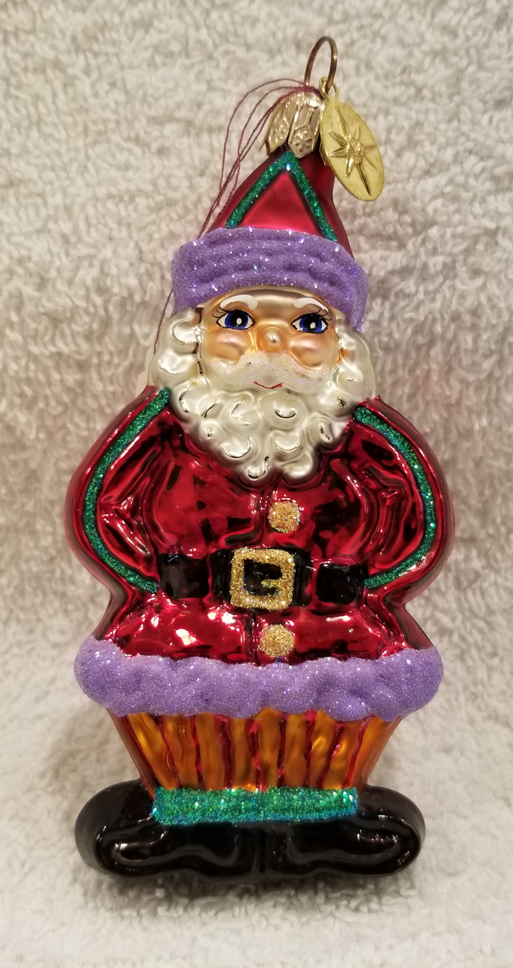 | Today I'm listing a Santa-shaped gingerbread cookie ornament. This is Ginger Snap Santa, Radko number 00-492-0. This is Santa standing with his arms behind his back with uniquely purple frosted robes. The original metal charm is still attached and the paper tag is included. I'm asking $30 plus shipping via Pirate Ship. |