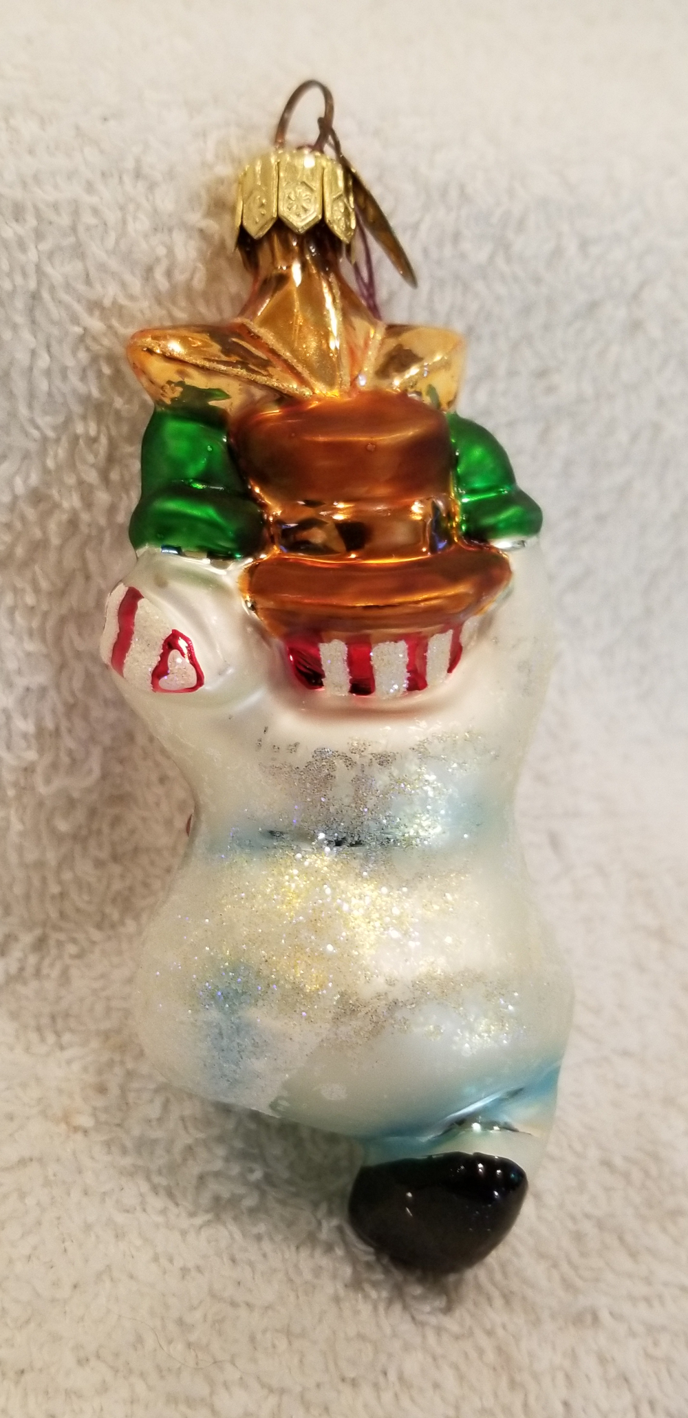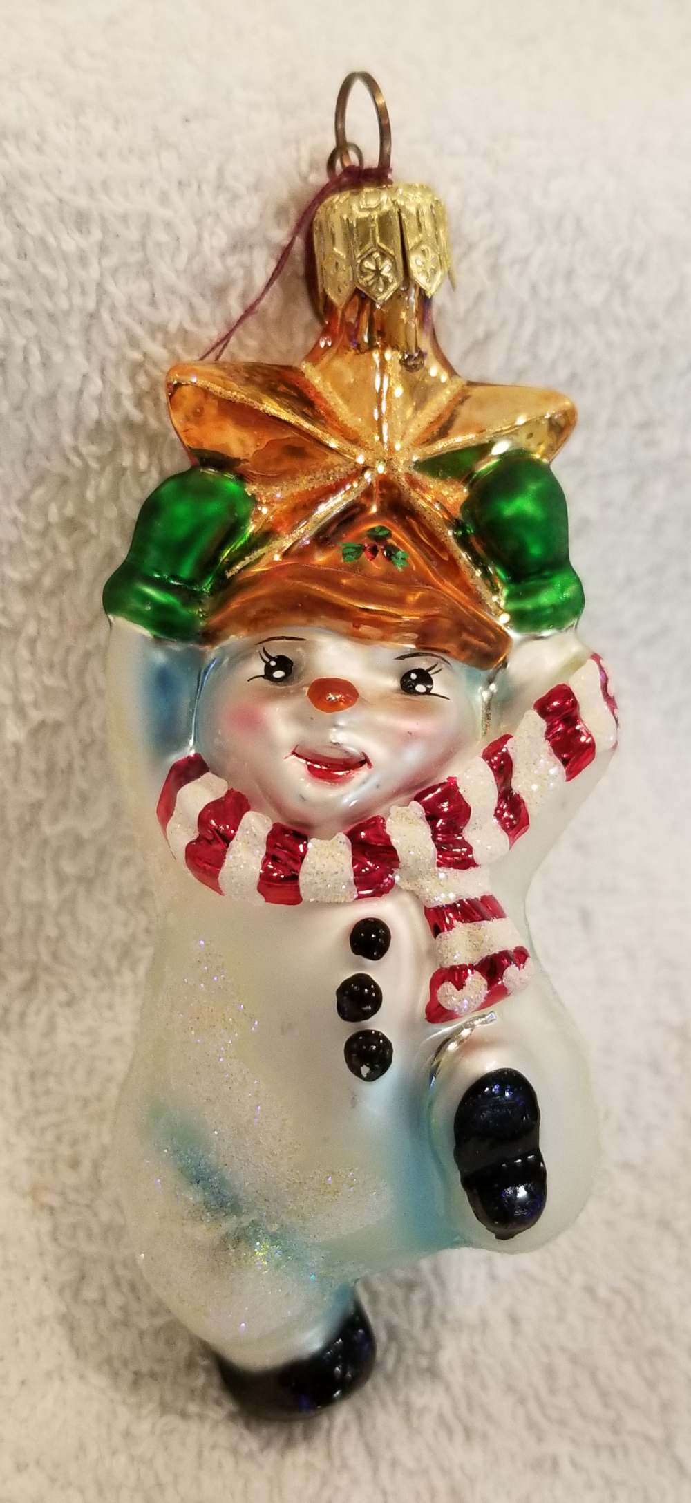 | Today I'm listing a really cute snowman. This is Swing on a Star, Radko number 00-504-0. This is a snowman that is hanging from a big gold star. And he seems to be kicking his legs! The original metal charm is still attached. I'm asking only $25 plus shipping via Pirate Ship. |