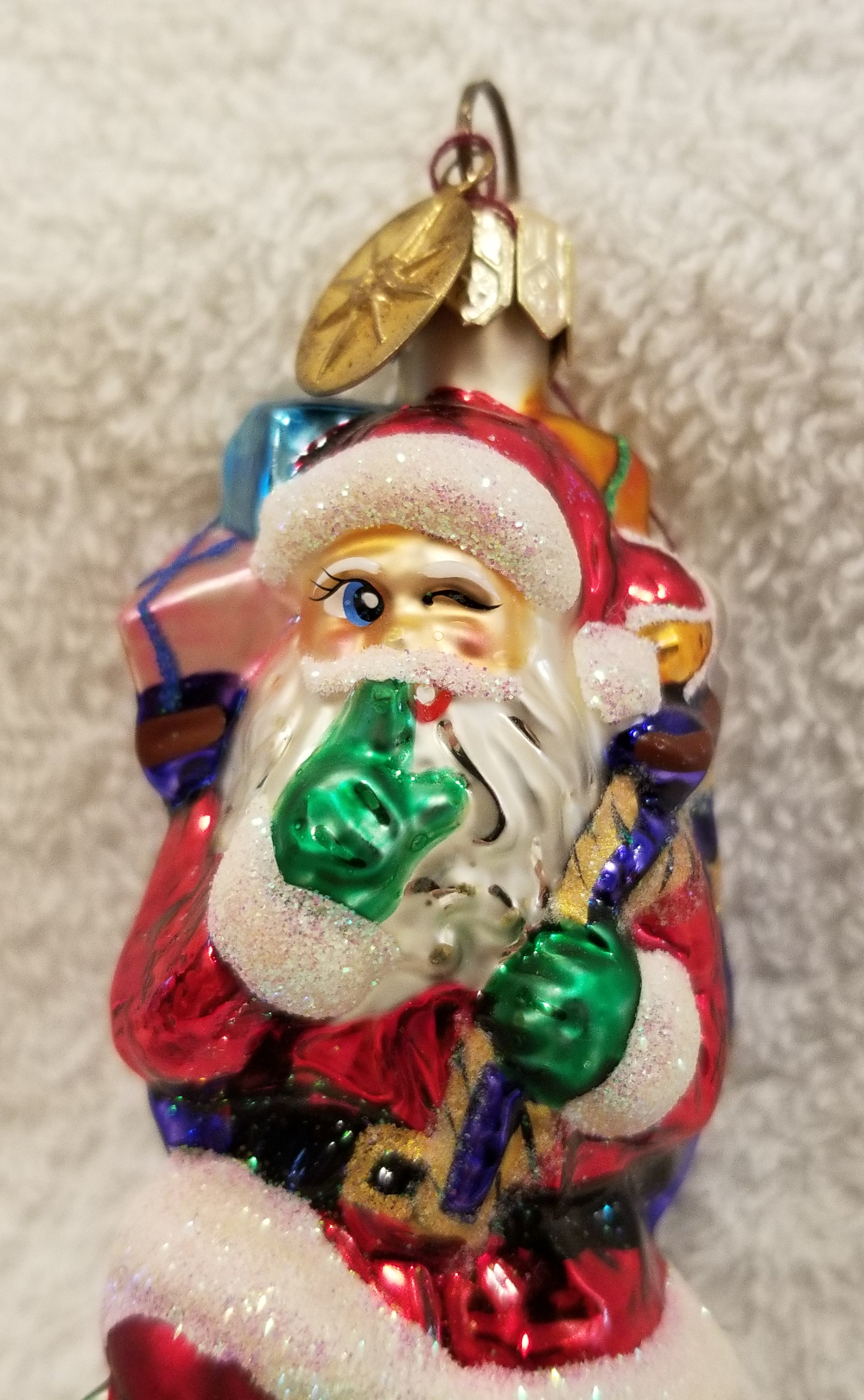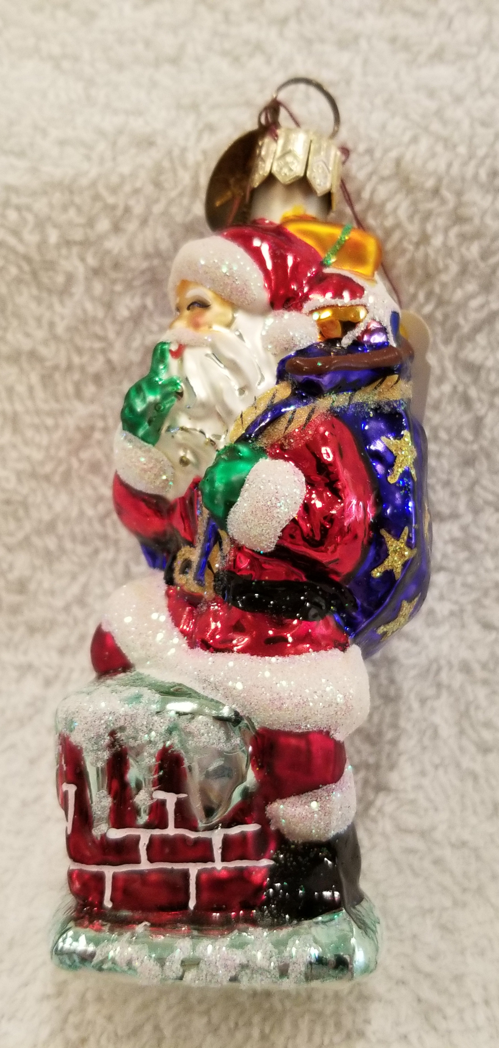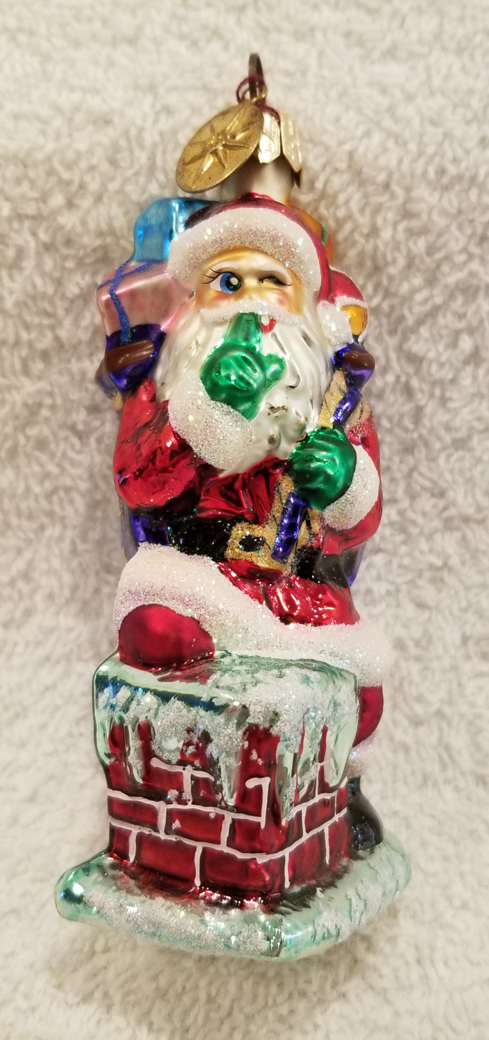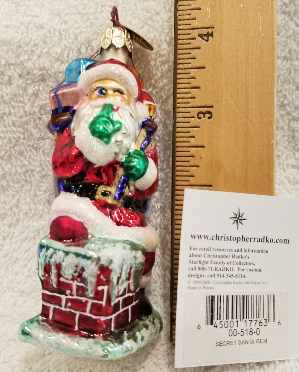 | I'm listing Secret Santa, Radko number 00-518-0. This is Santa sneaking down a chimney with a bag full of gifts. Really cute! The original metal charm is still attached and the paper tag is included. I'm asking only $25 plus shipping via Pirate Ship. |