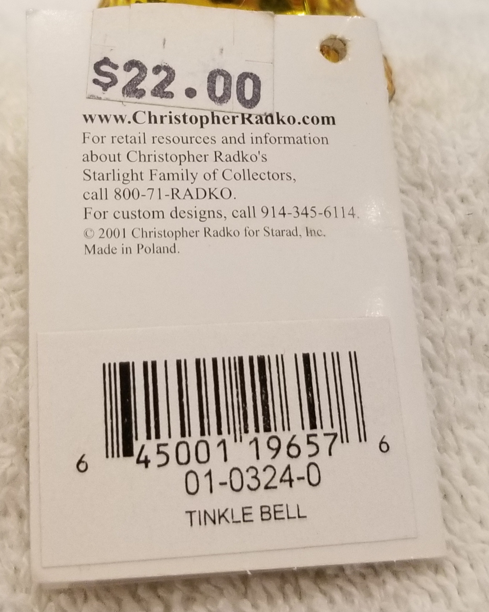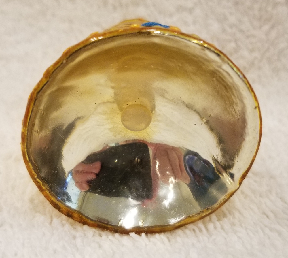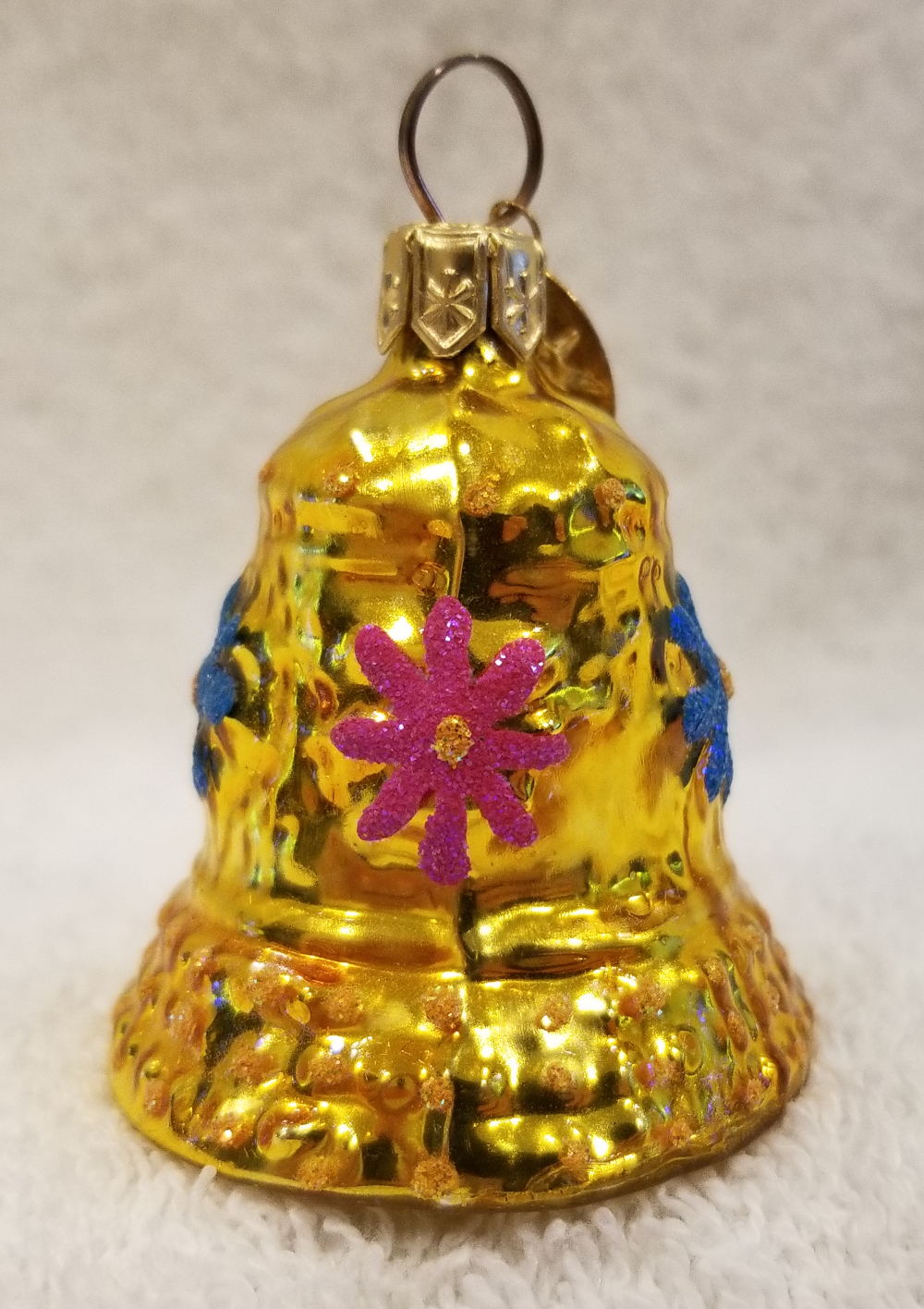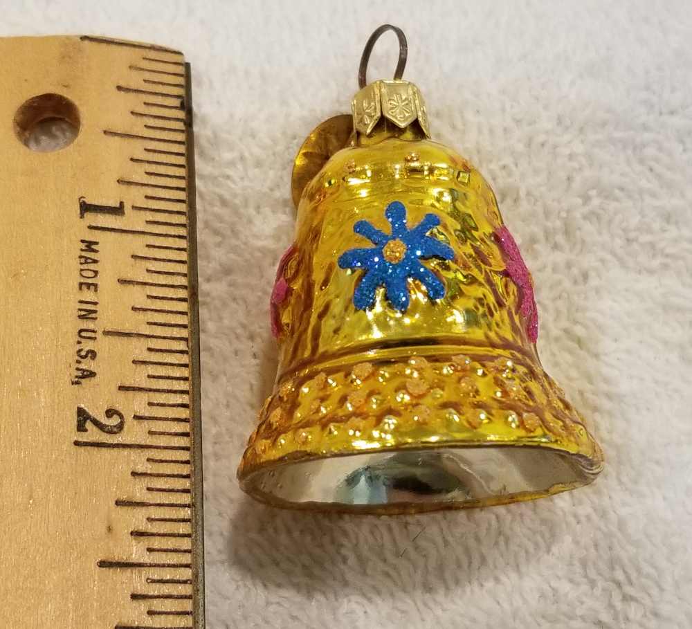 | Today I'm listing a cute gem-size bell. This is Tinkle Bell , Radko number 01-0324-0. This is a yellow bell with red and blue flowers along the outside. The original metal charm is attached and the paper tag is included. I'm asking $25 plus shipping via Pirate Ship. |