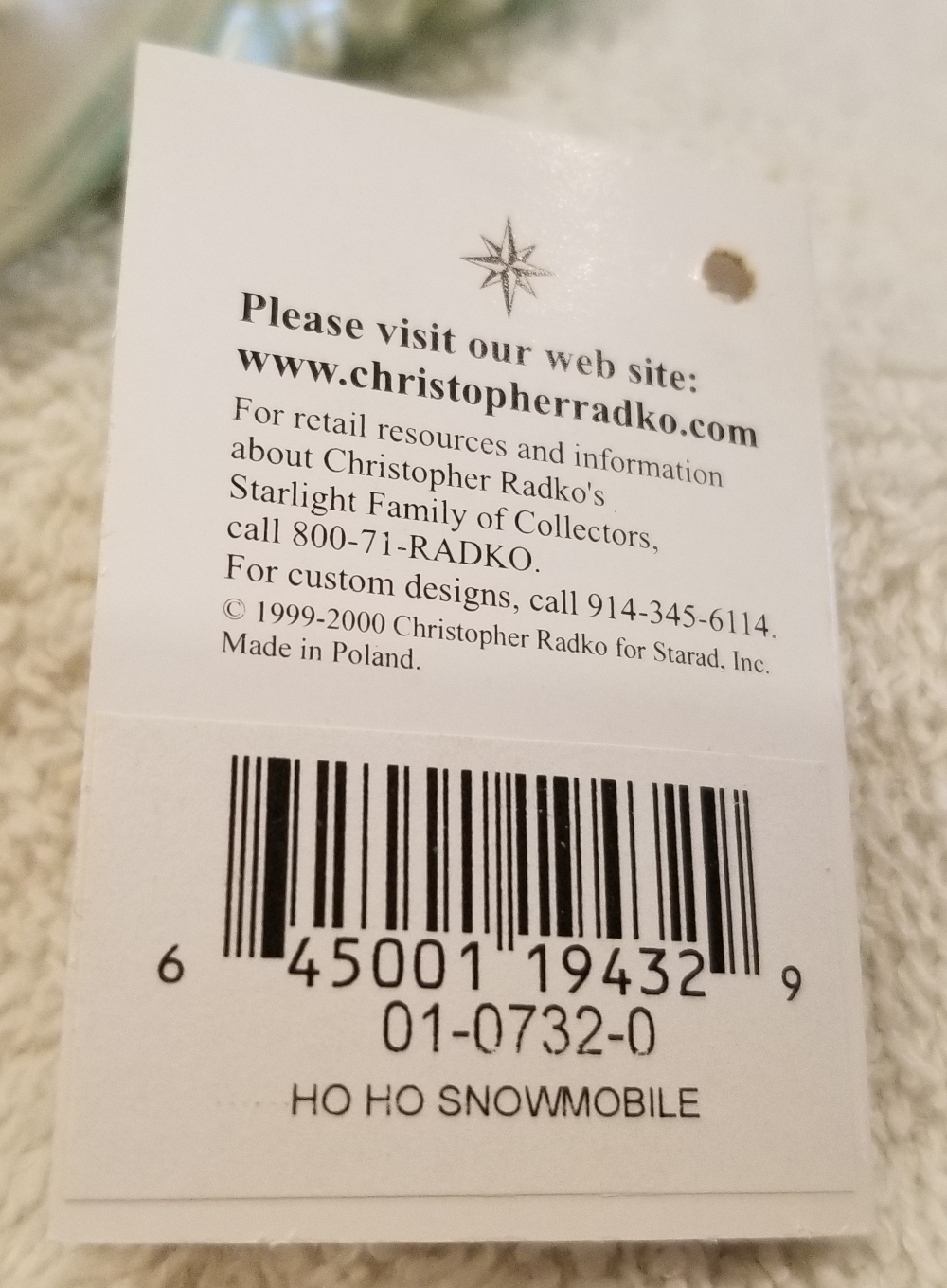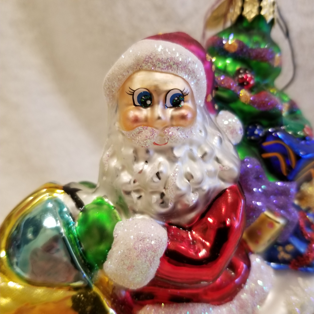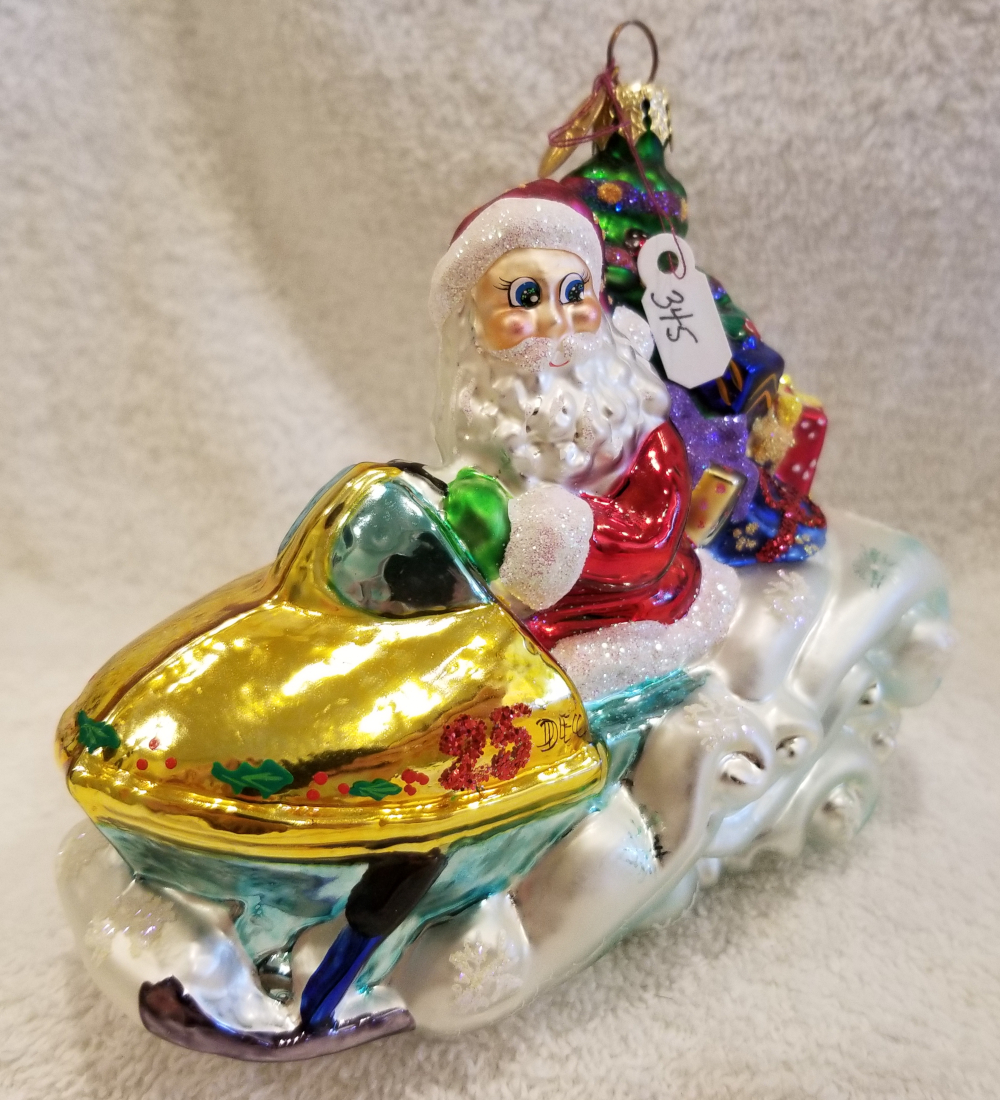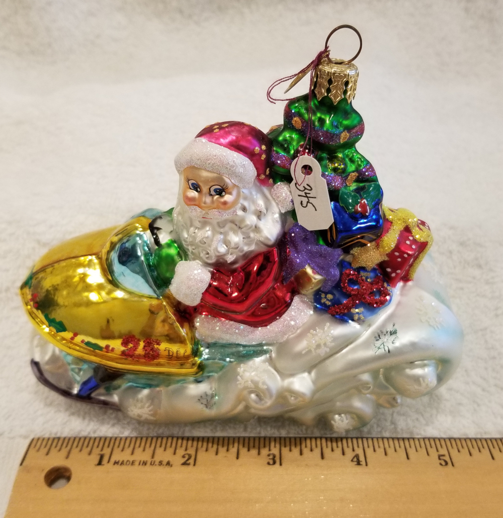 | This one is really cute! Especially with all the snow in the Northern US we're getting! This is Ho Ho Snowmobile, Radko number 01-0732-0. This is Santa on a snowmobile carrying a tree and lots of pretty gifts. He's riding on some fluffy white snow. The original metal charm is still attached and the paper tag is included. I'm asking $40 plus shipping via Pirate Ship. |