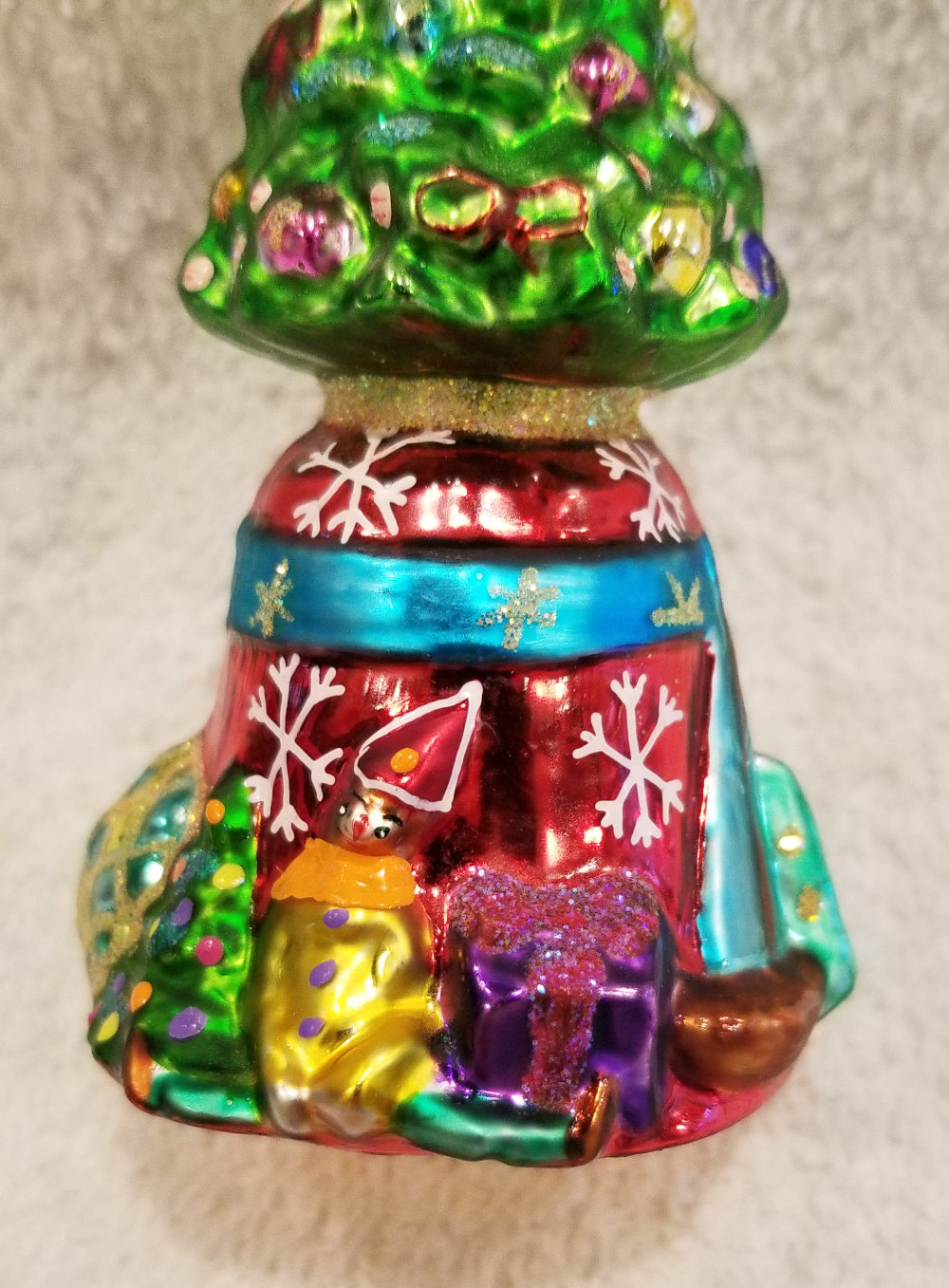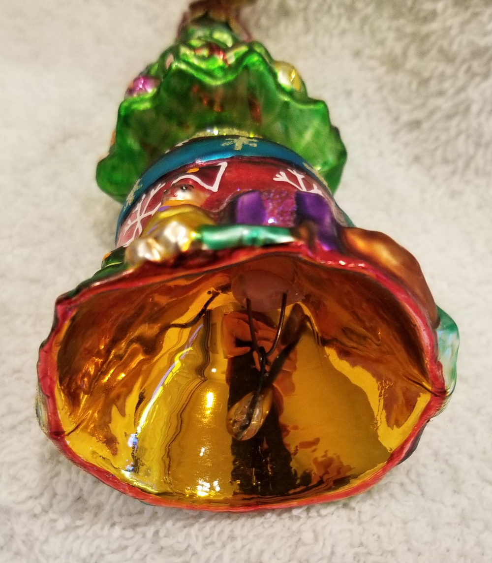 | Today I'm listing another beautiful bell. This is O'Tannenbell Jr, Radko number 01-0765-0. The bell of the ornament is the base of a Christmas tree covered in a red skirt and lots of beautiful gifts. The top is a big green Christmas tree with lots of ornaments. The original metal charm is still attached and the paper tag is included. I'm asking $30 plus shipping via Pirate Ship. |