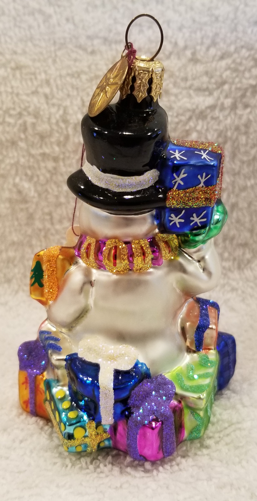 | Today I'm listing another cute snowman gem. This is Great Gifts Galore Gem, Radko number 01-0783-0. This snowman is carrying a couple of gifts and has even more around his feet. The original metal charm is still attached and the paper tag is included. I'm asking $30 plus shipping via Pirate Ship. |