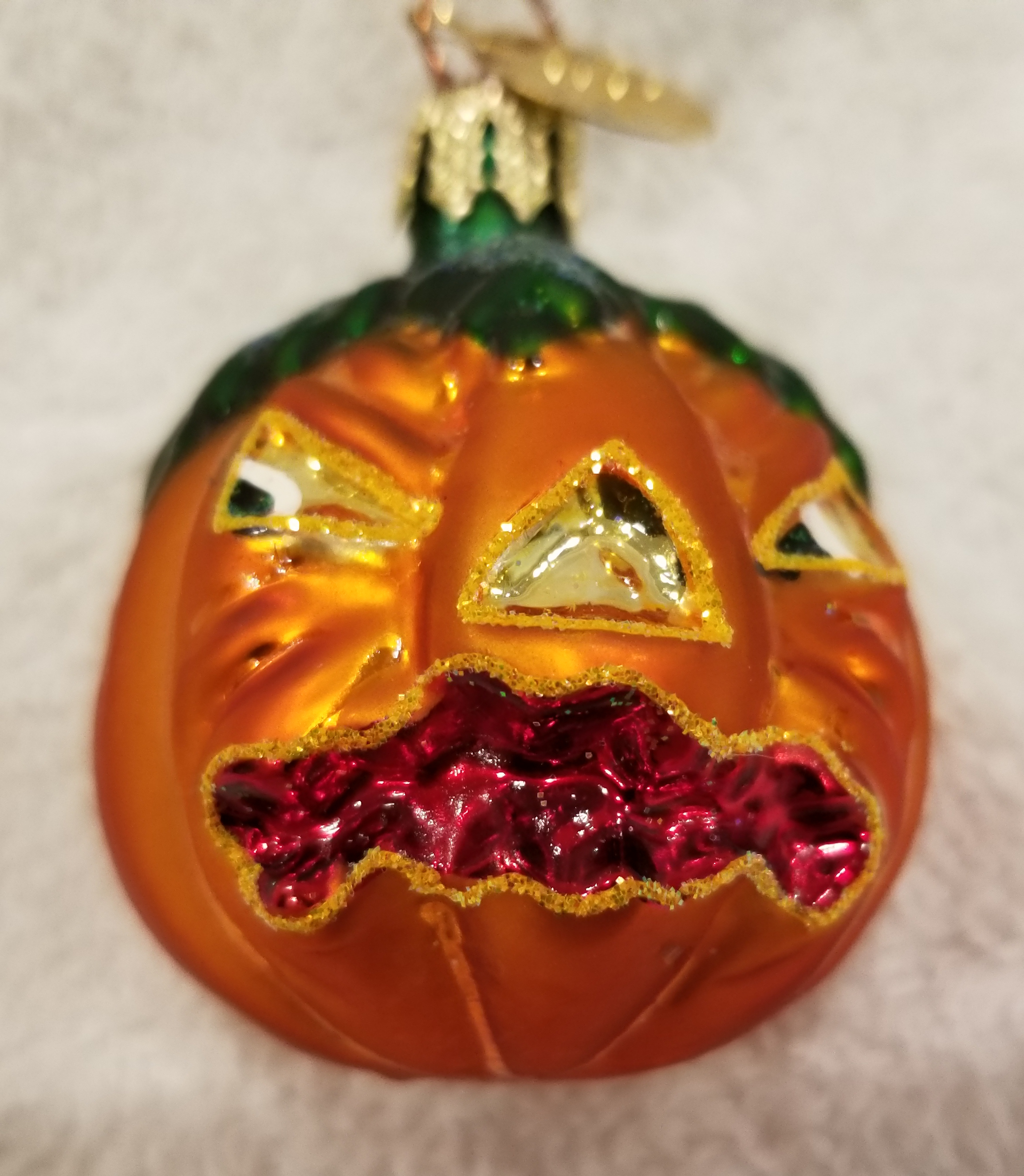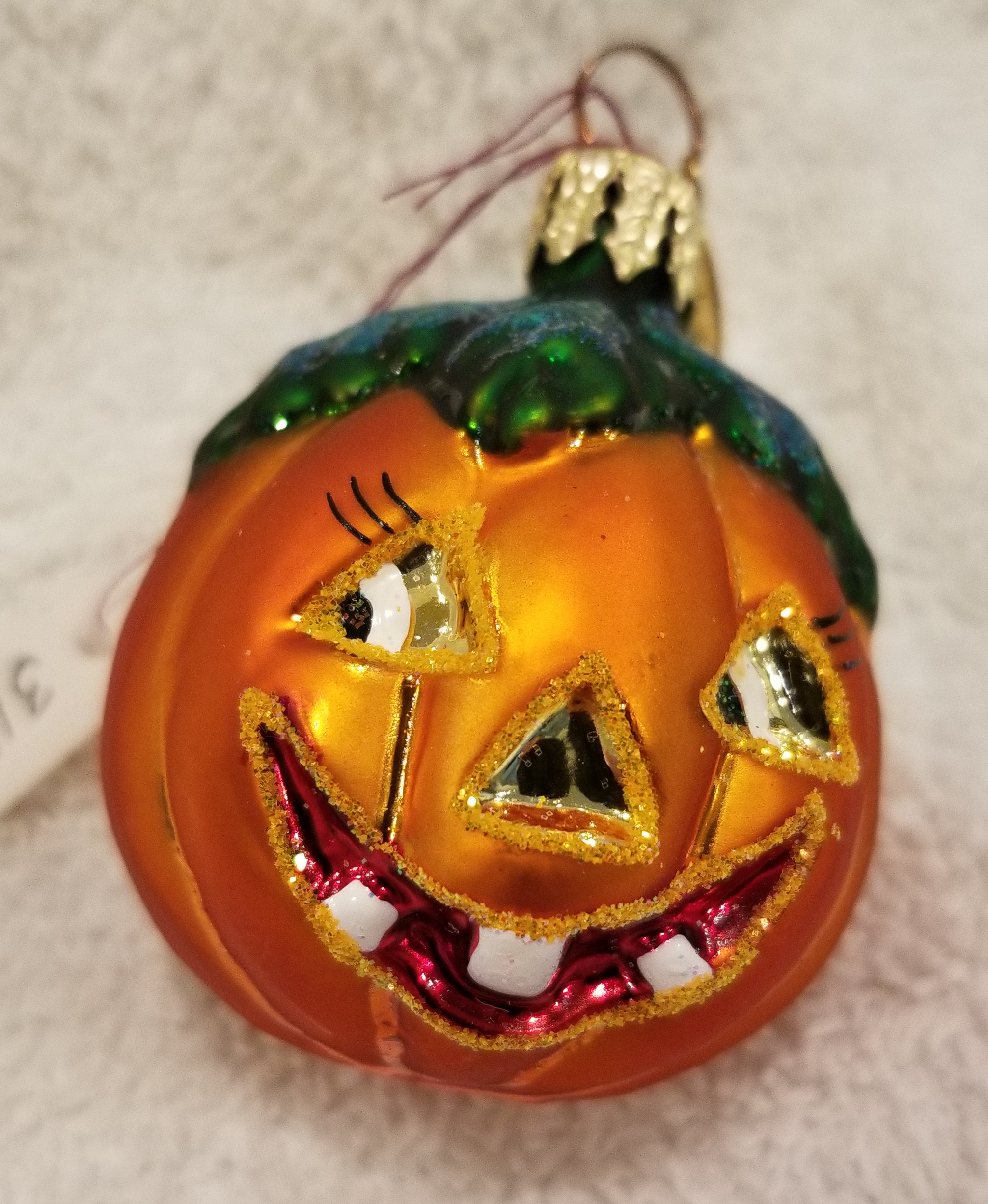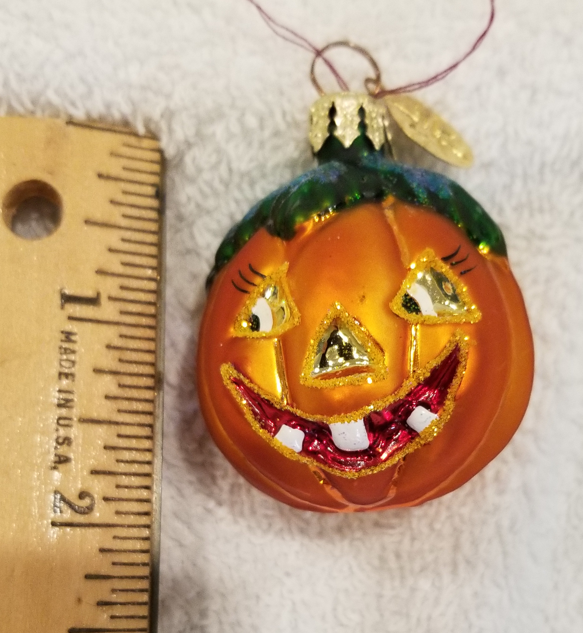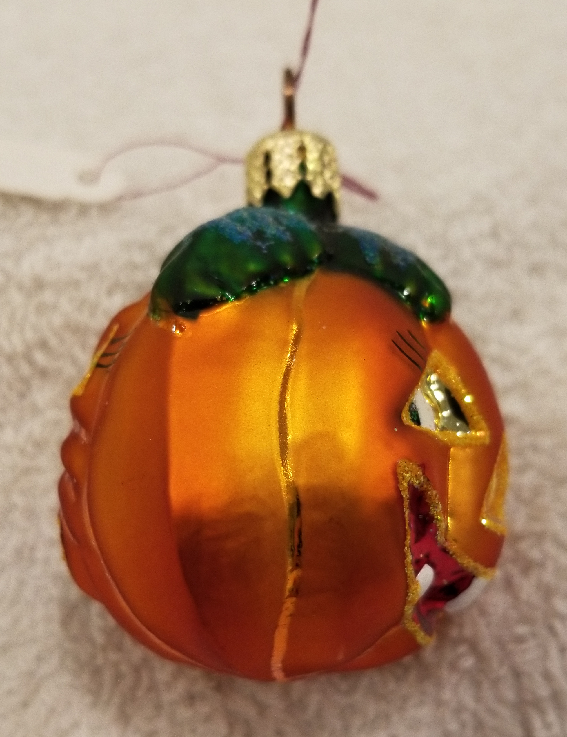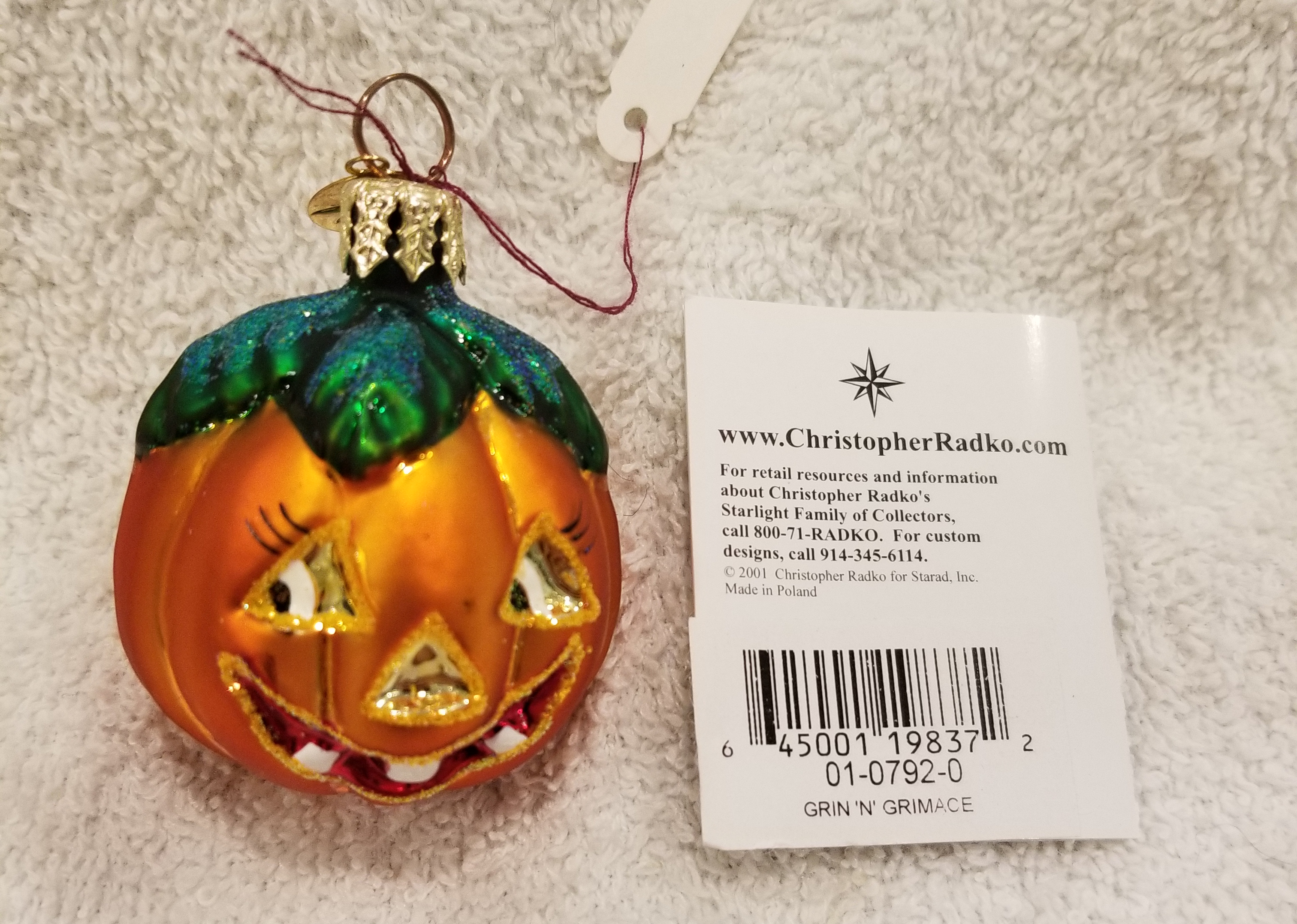 | This week I'm listing Halloween ornaments I just received! This one is Grin 'N' Grimace, Radko number 01-0792-0. This is a pumpkin with a smile on one side and a frown on the other. Really cute! I'm asking only $25 plus shipping via Pirate Ship however you prefer. Please ask if there are any questions and thanks for taking a look! |