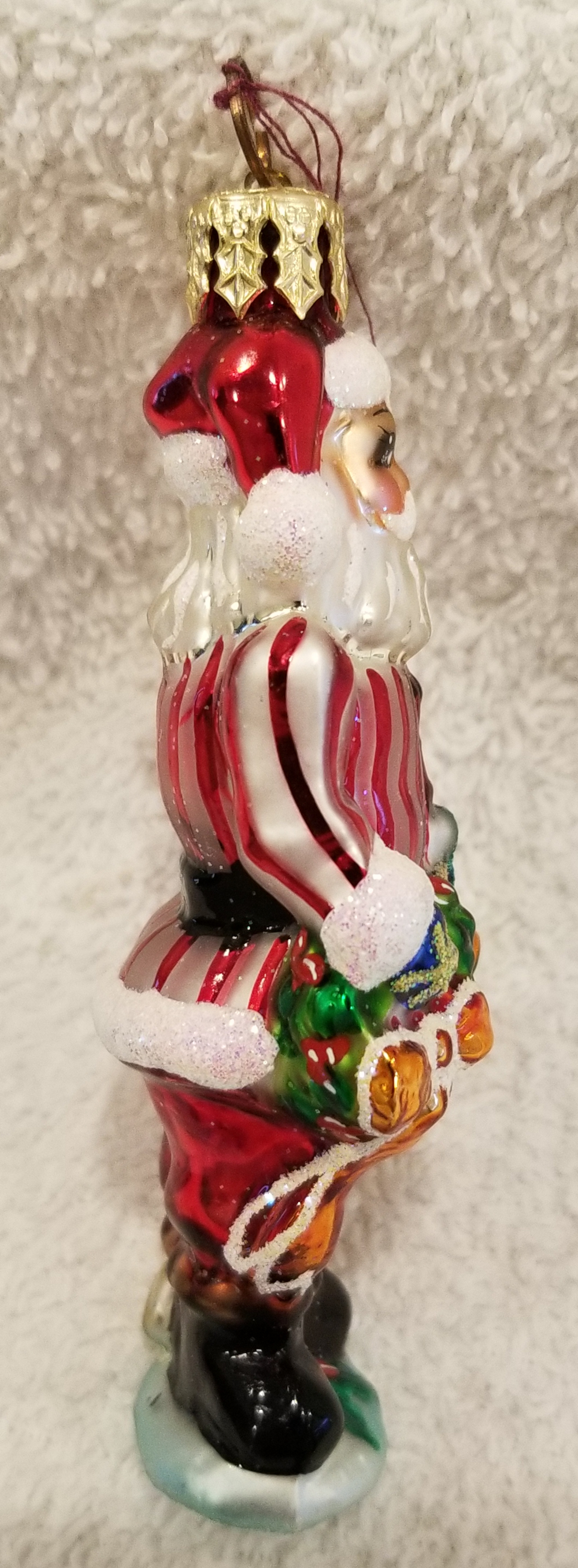 | I'm listing a unique Santa. This is Ring in the Holiday, Radko number 01-789-0. This is Santa dressed in a starlight style red and white striped top while carrying a bunch of beautiful presents. The original metal charm is still attached and the paper tag is included. I'm asking $35 plus shipping via Pirate Ship. |