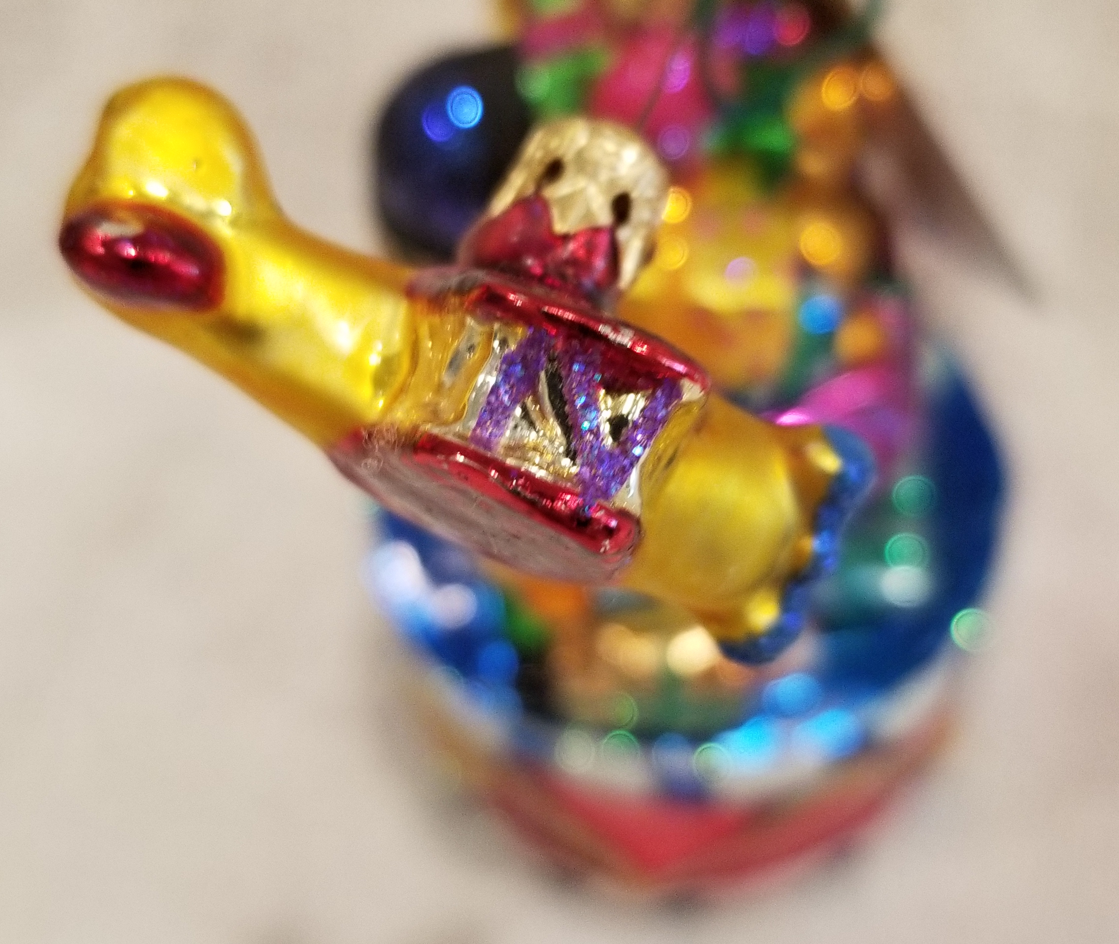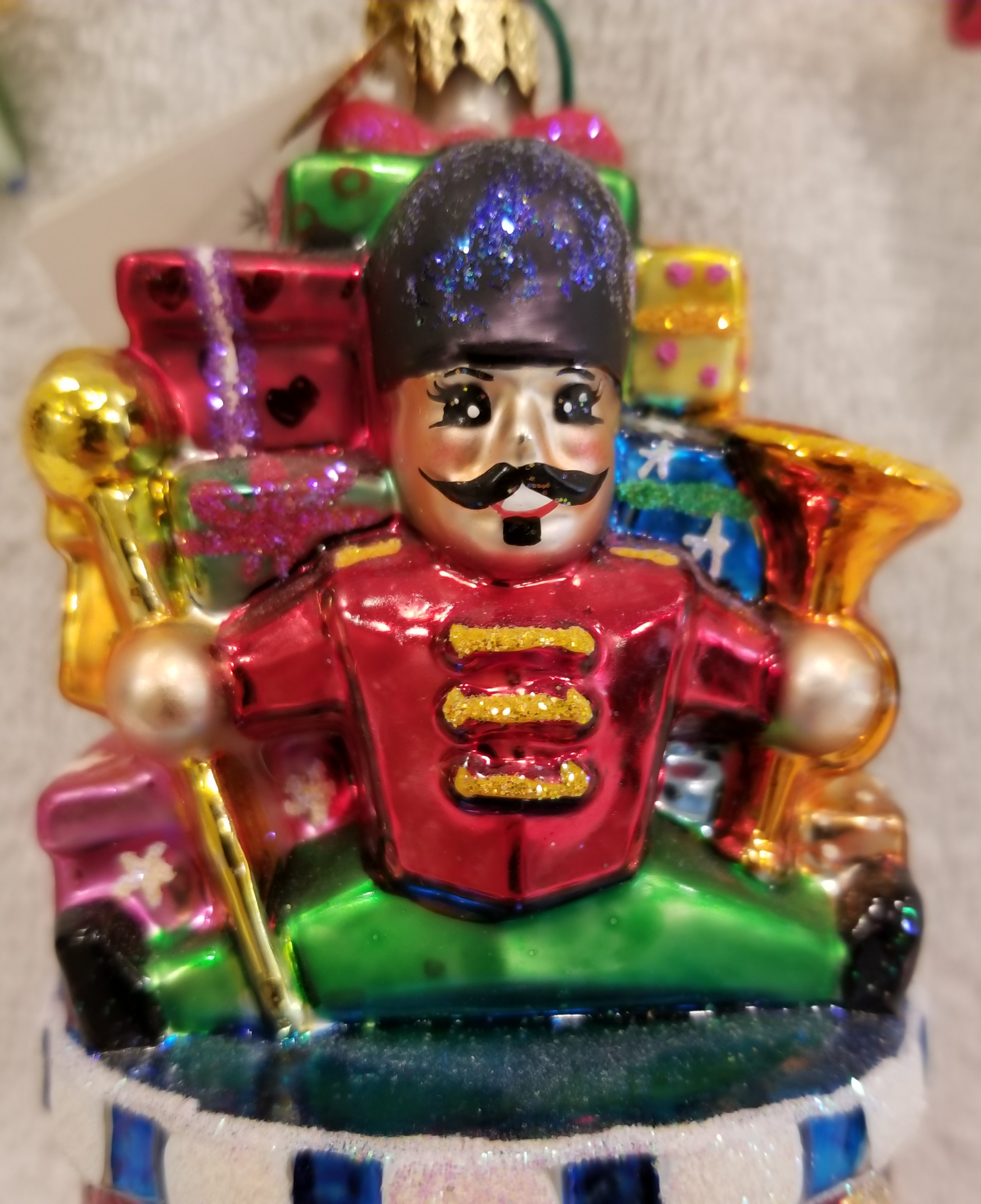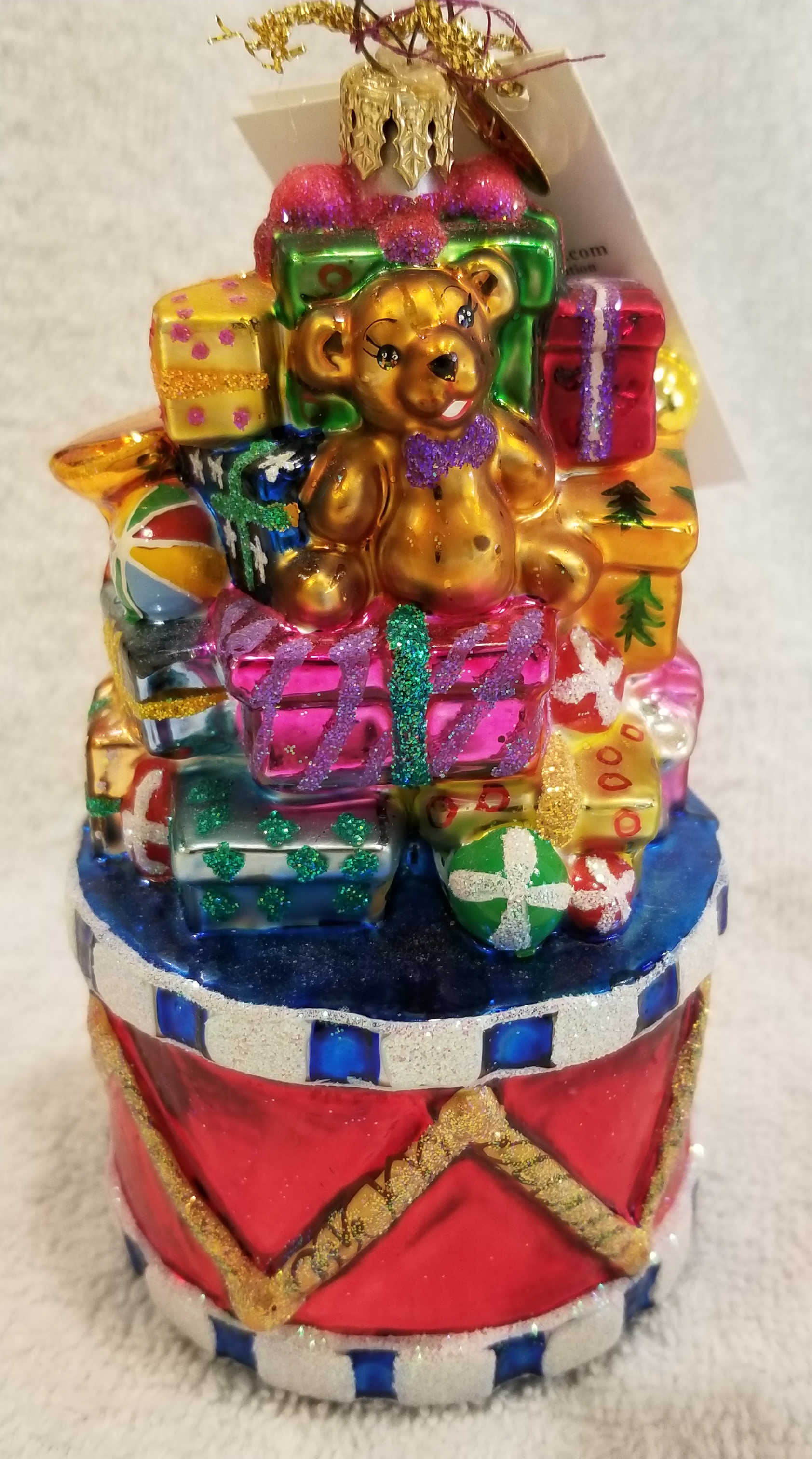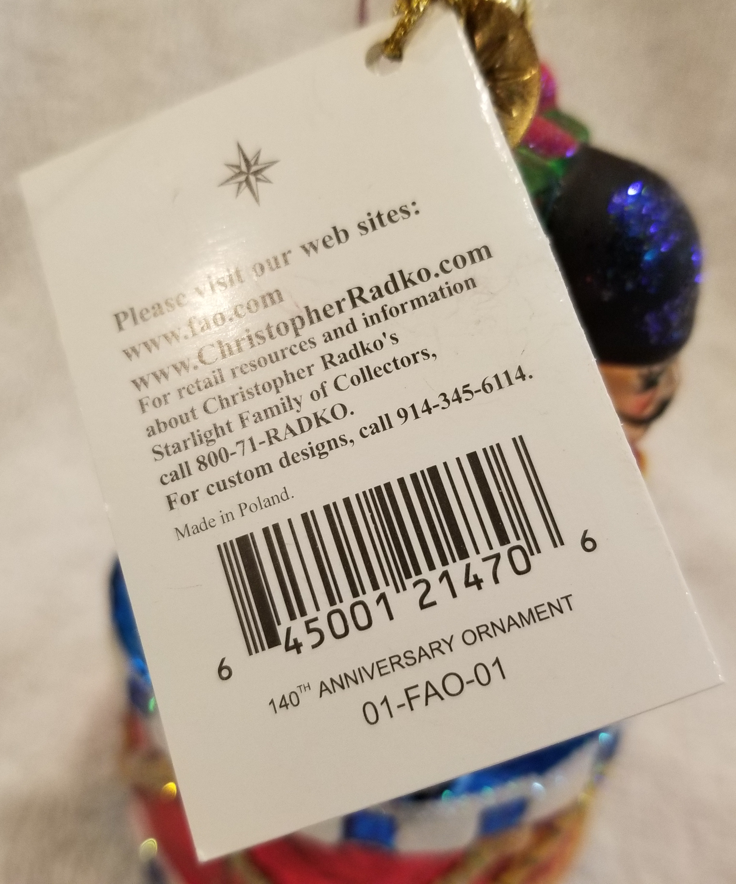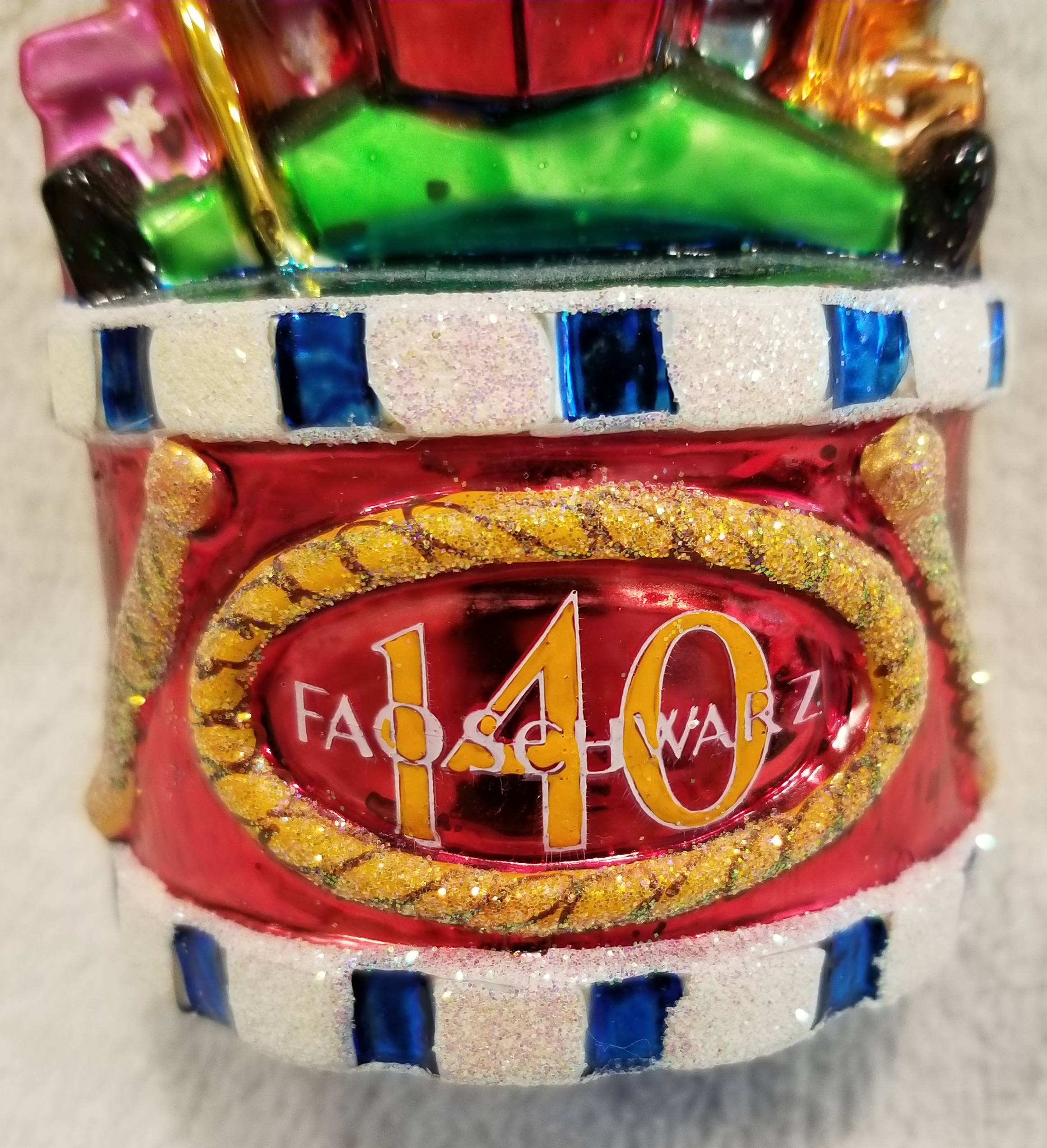 | I'm listing more FAO Schwarz exclusive ornaments. This is for a really special one! This is the 140th anniversary ornament. Radko number 01-FAO-01. The ornament features a nutcracker/soldier/bandmember sitting on a large drum. There are gifts stacked. Coming out of the presents is a rocket ship and airplane. Both are hanging on wire and bob around. The original metal charm and paper tag are attached. Be sure to take a look at all the great pics! I'm asking $50 plus shipping via Pirate Ship however you prefer. Please ask if there are any questions and thanks for taking a look! |