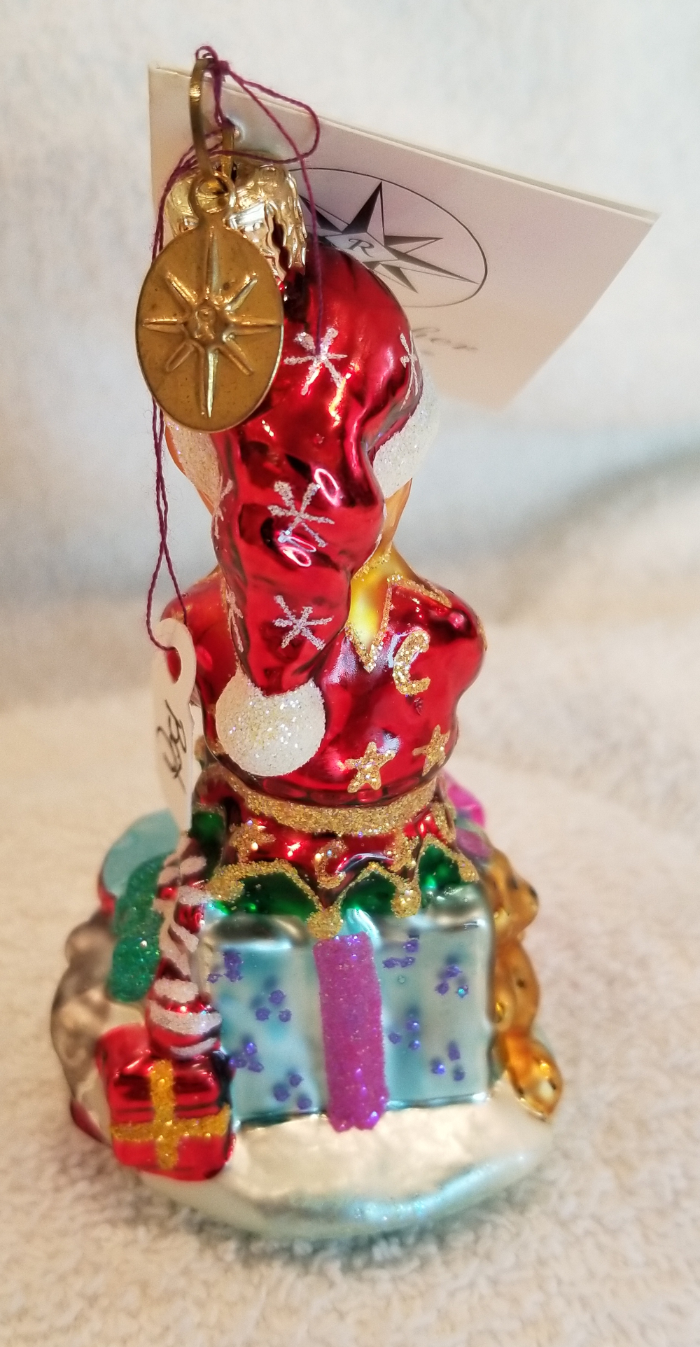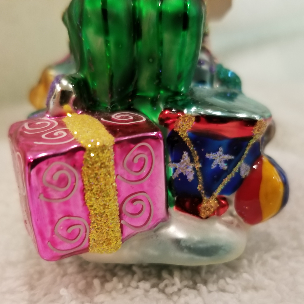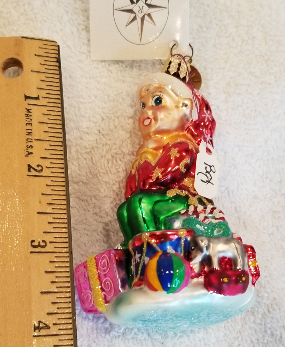 | Today I'm listing another Marshall Field's exclusive. This is Gifted Elf gem, Radko number 01-MAR-03. This is an elf sitting on top of a big pile of gifts. It is approx. 4" tall and the original metal charm and paper tag are still attached. I'm asking $35 plus shipping via Pirate Ship however you prefer. |