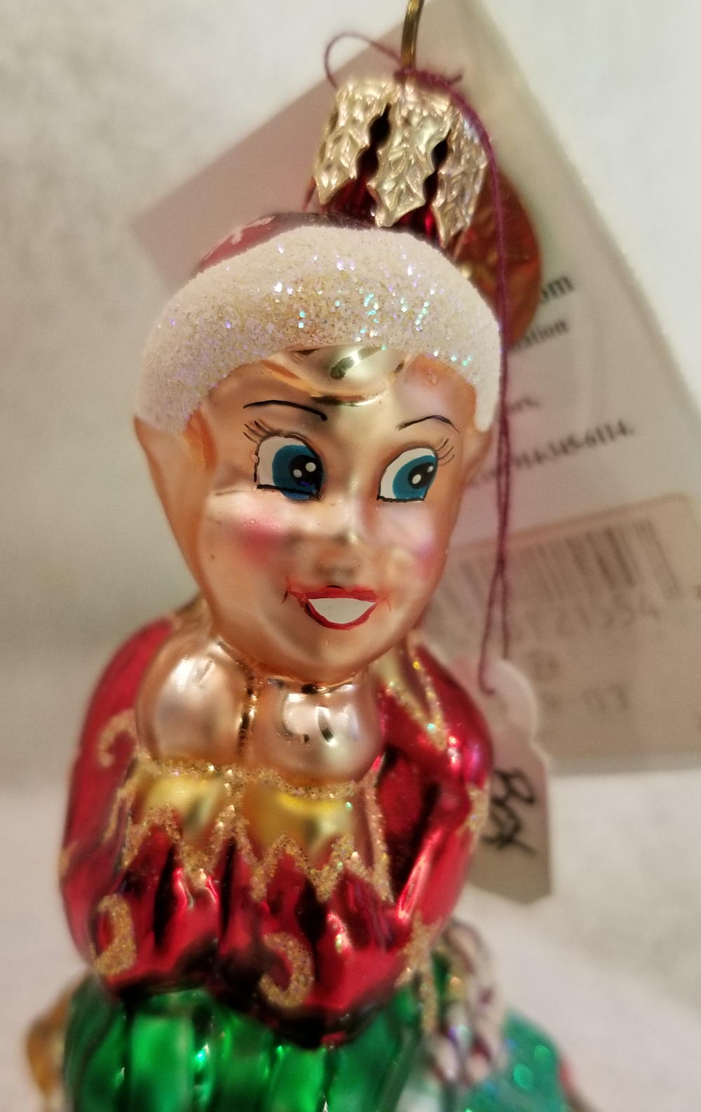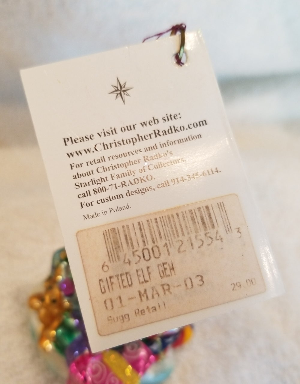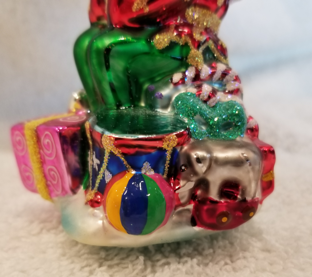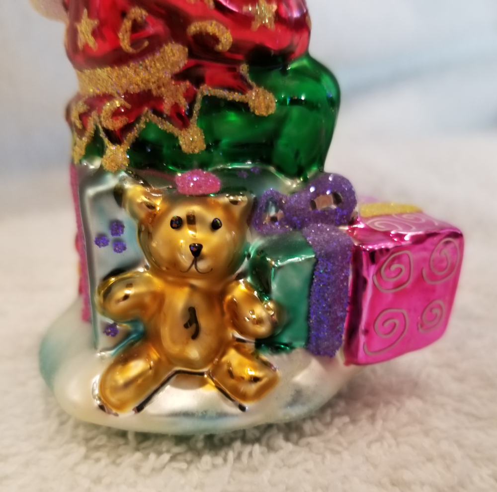| Today I'm listing another Marshall Field's exclusive. This is Gifted Elf gem, Radko number 01-MAR-03. This is an elf sitting on top of a big pile of gifts. It is approx. 4" tall and the original metal charm and paper tag are still attached. I'm asking $35 plus shipping via Pirate Ship however you prefer. |