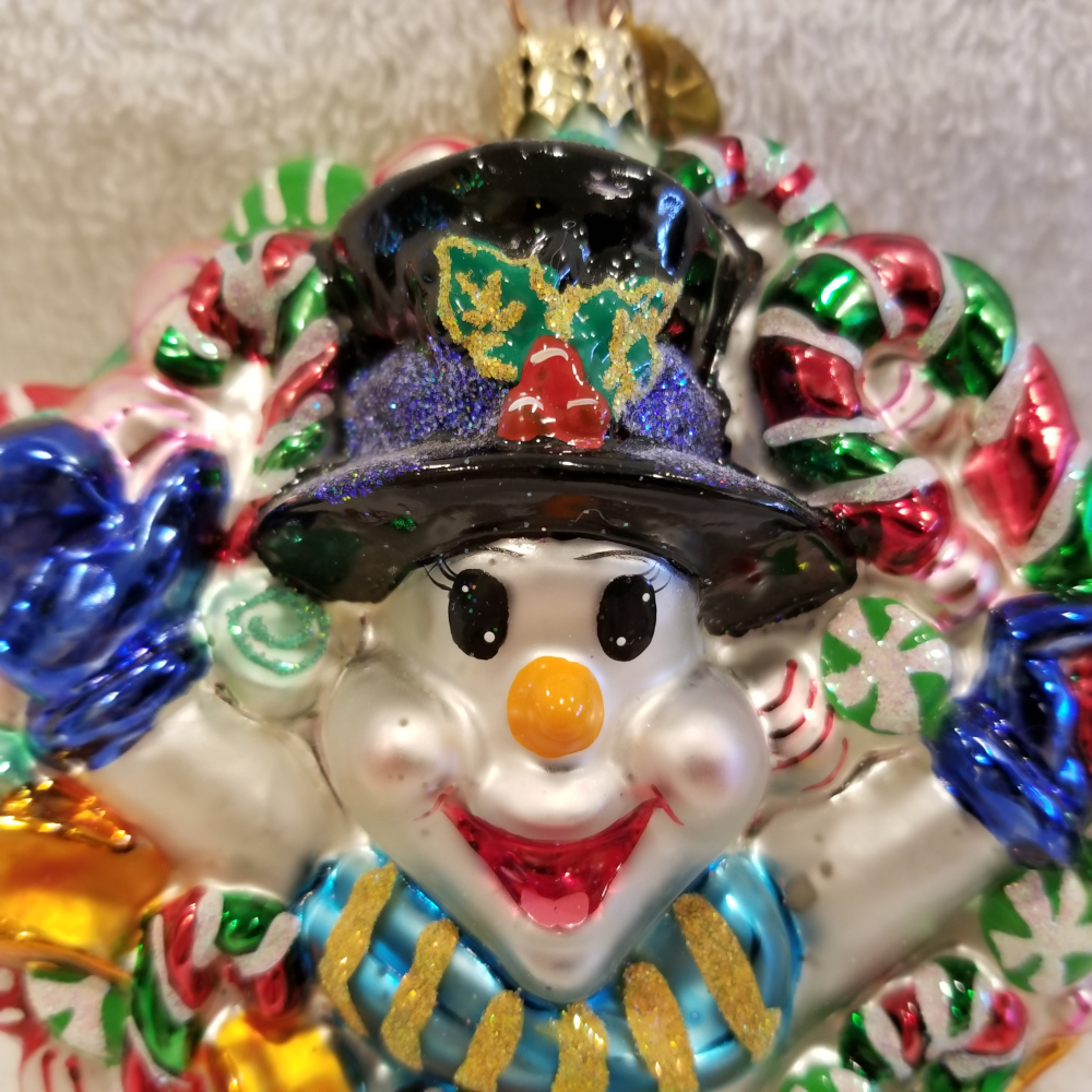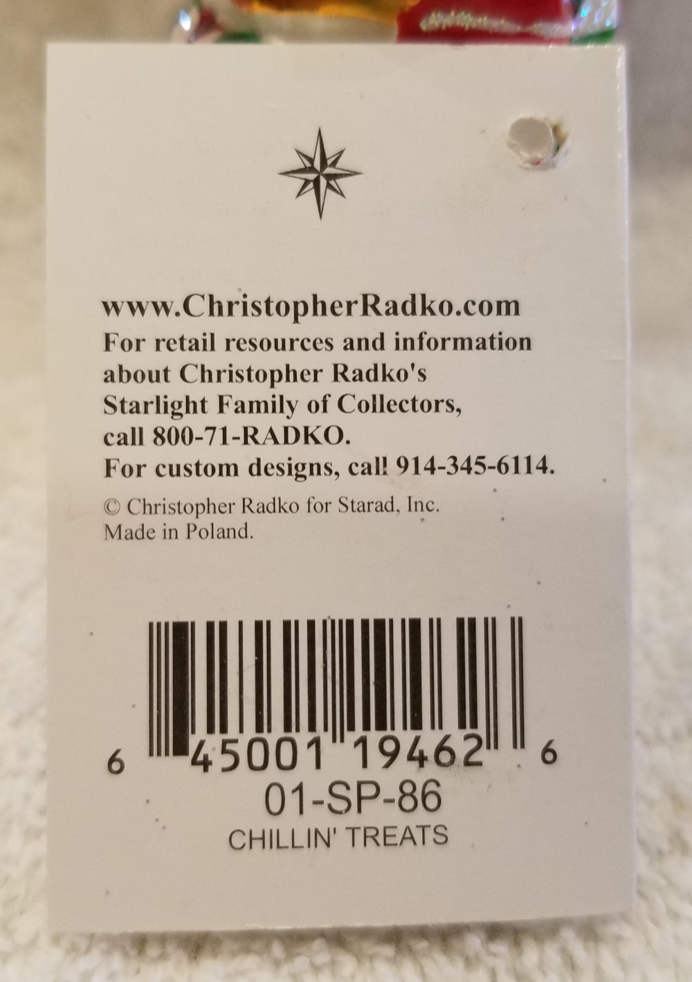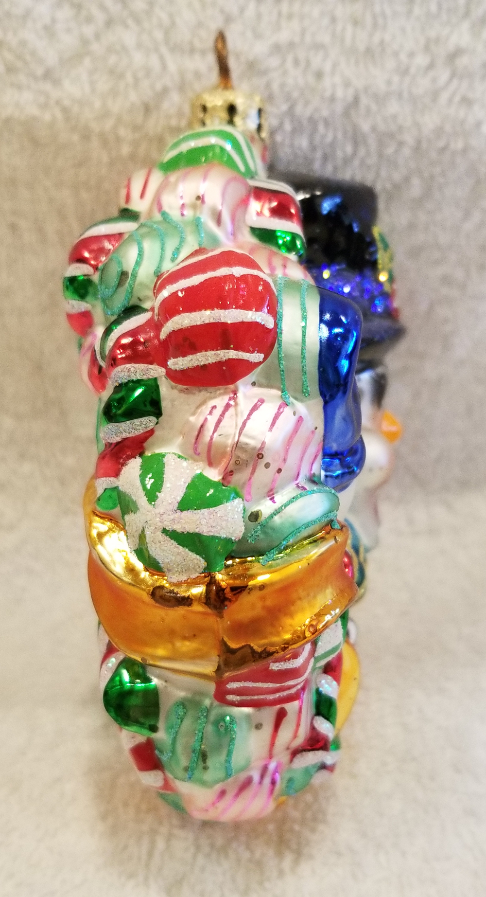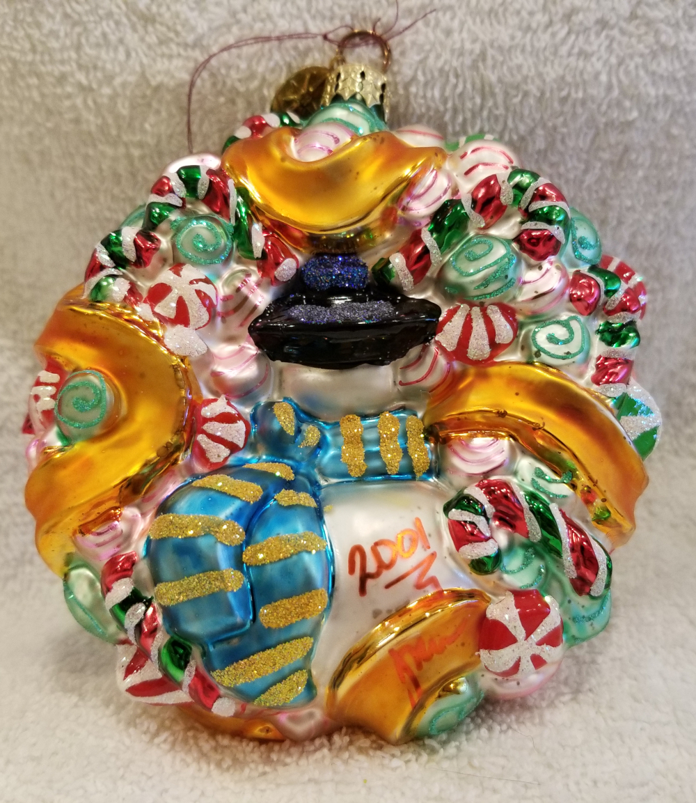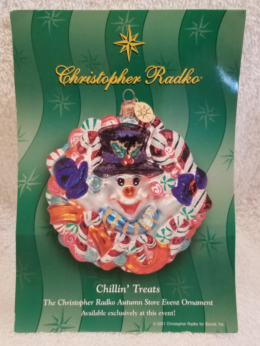 | Today I'm listing another event ornament. This is Chillin' Treats, Radko # 01-SP-86. This is the Autumn 2001 store event ornament. This one was signed by Julion Meyer on Nov 3, 2001. This ornament features a snowman in the middle of a wreath of beautiful gifts and candies. The postcard sent to my mom announcing the availability is also included. As with some older ornaments, this one also has some minor internal spotting that you can see in the pictures. The original metal charm is still attached and the paper tag is included. I'm asking $35 plus shipping via Pirate Ship. Please ask if there are any questions and thanks for taking a look! |