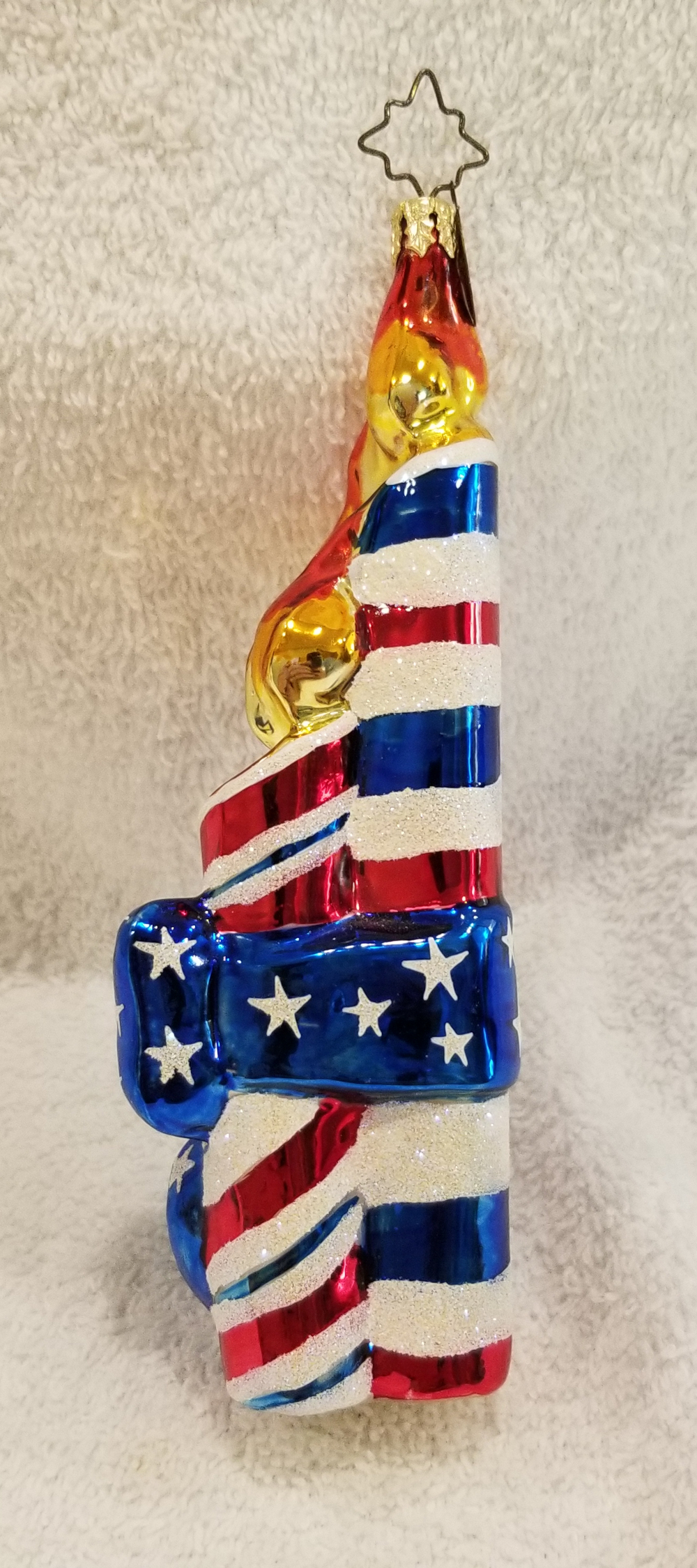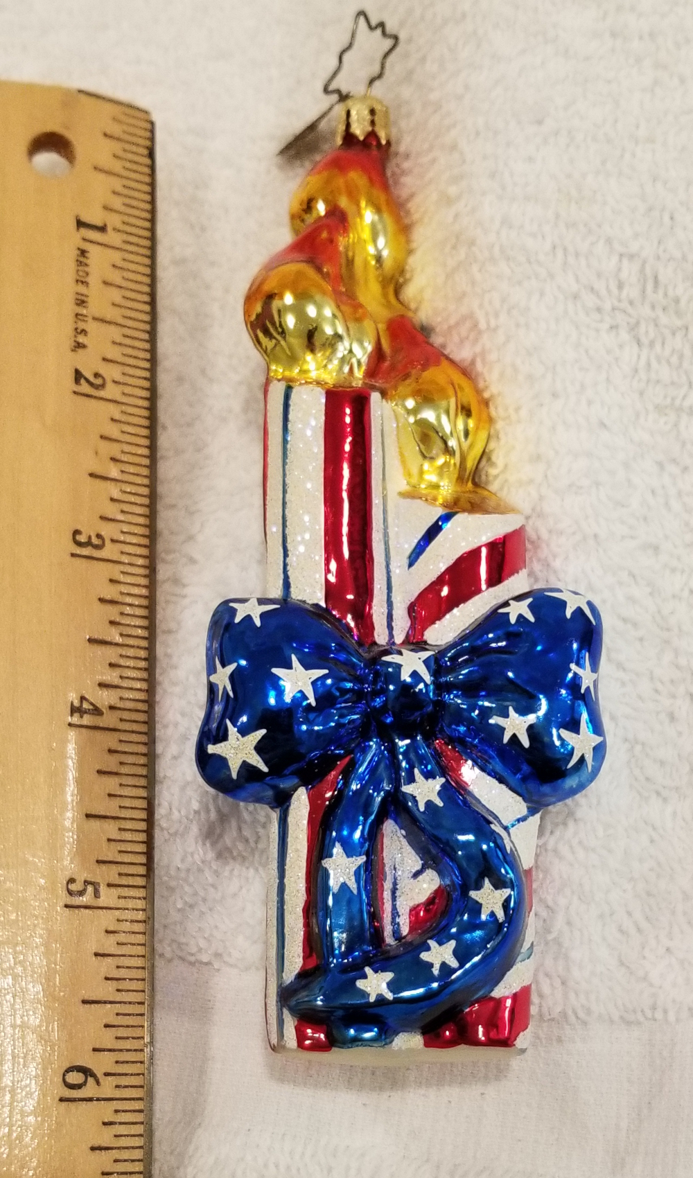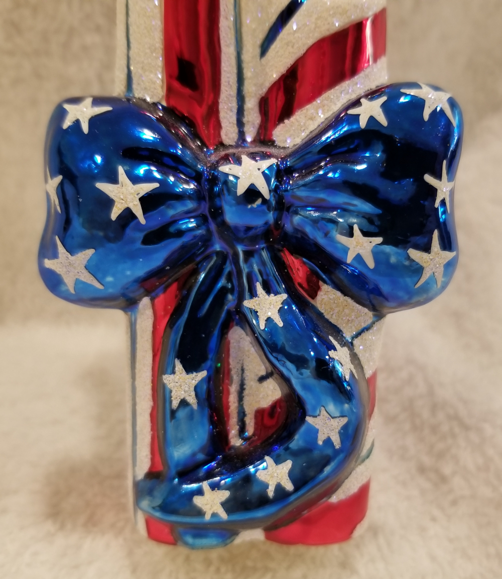 | I'm listing a great 4th of July ornament. This is Old Glory Cracker, Radko number 02-0458-0. This is a trio of red, white and blue candles wrapped in a big blue bow. The original metal charm is attached and the paper tag is included. I'm asking only $25 plus shipping via Pirate Ship. |