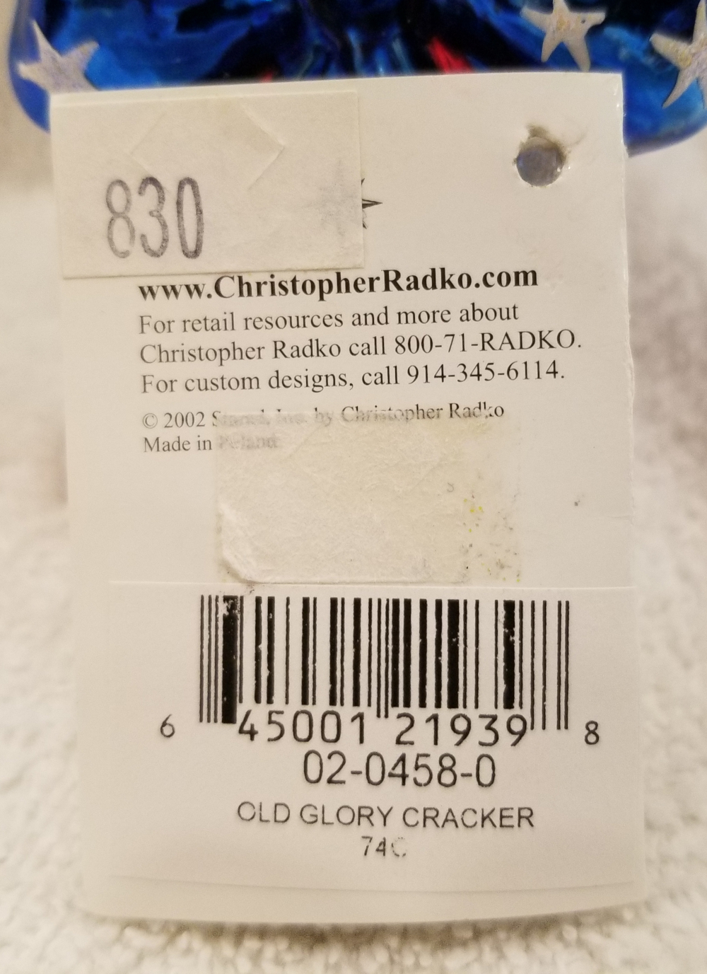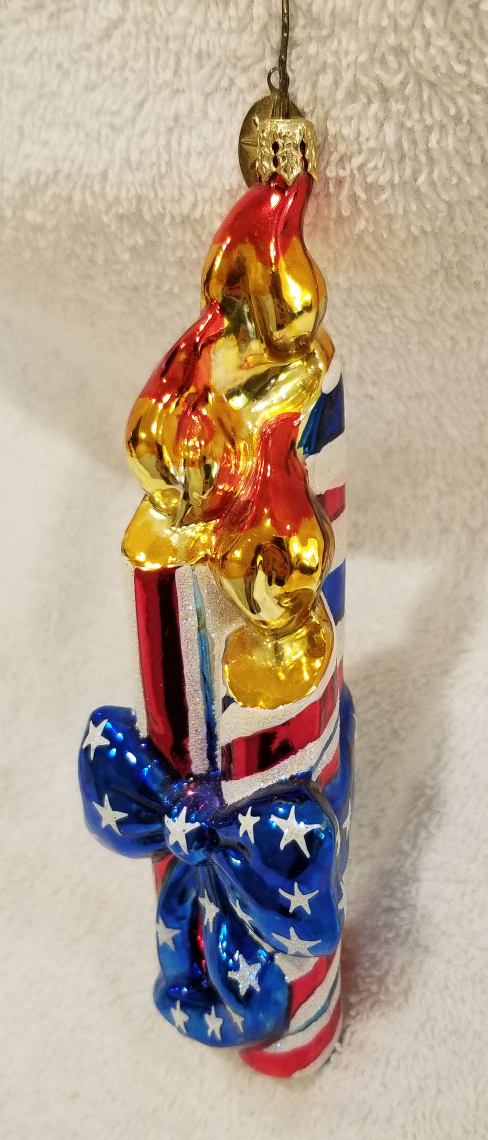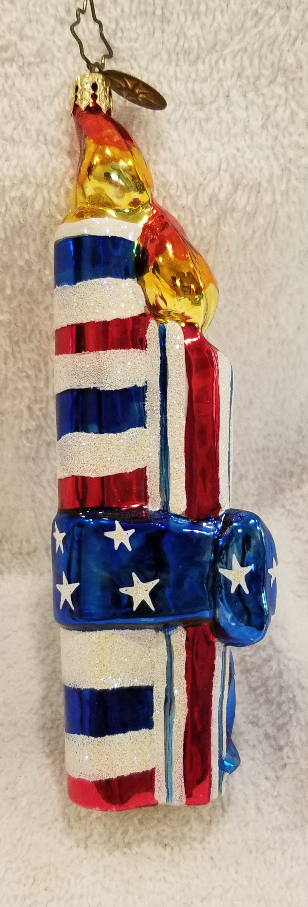 | I'm listing a great 4th of July ornament. This is Old Glory Cracker, Radko number 02-0458-0. This is a trio of red, white and blue candles wrapped in a big blue bow. The original metal charm is attached and the paper tag is included. I'm asking only $25 plus shipping via Pirate Ship. |