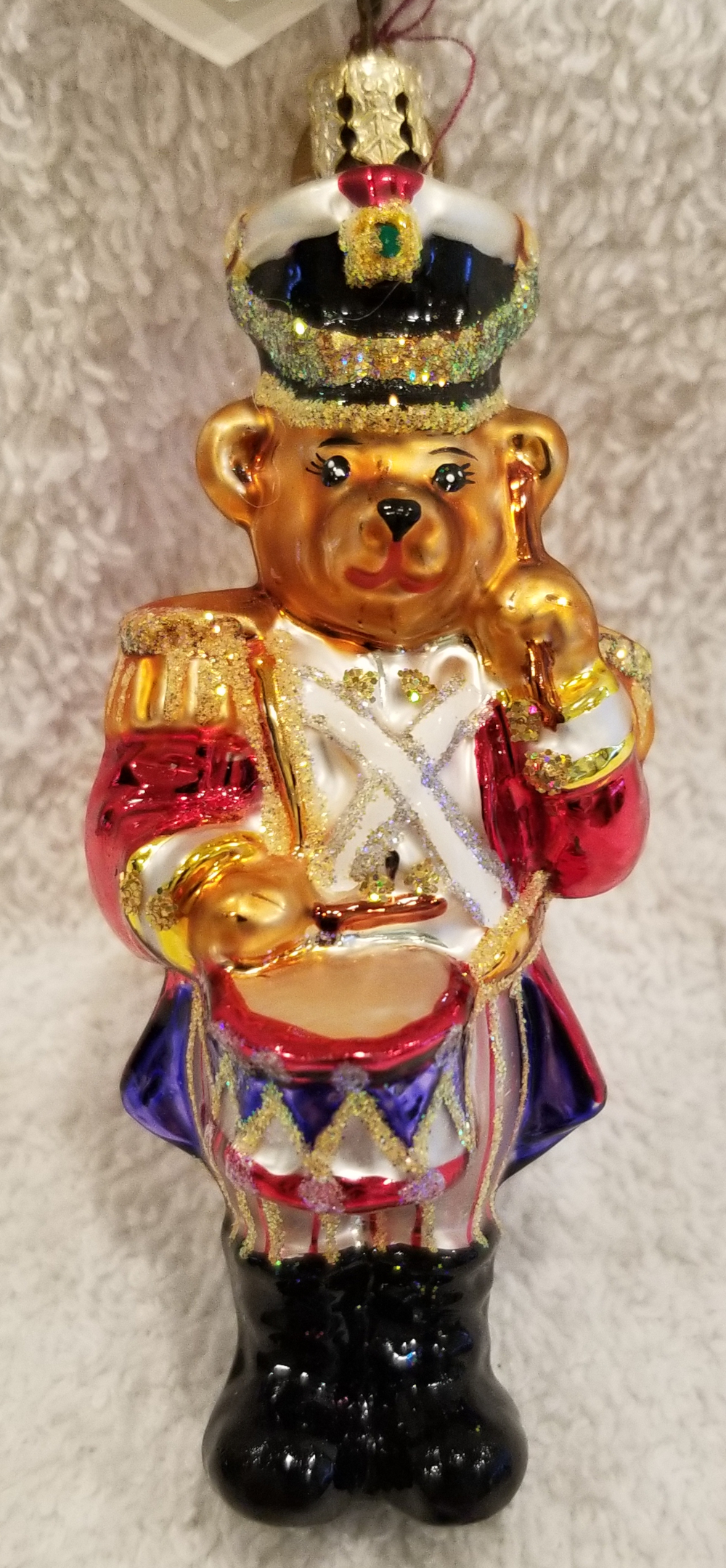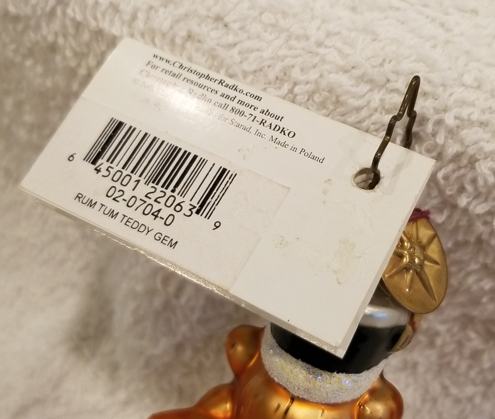 | I'm listing another unique gem. This is Rum Tum Teddy, Radko number 02-0704-0. This is a teddy bear dressed in a band uniform playing a drum. The original metal charm is still attached and the paper tag is included. I'm asking $30 plus shipping via Pirate Ship. |