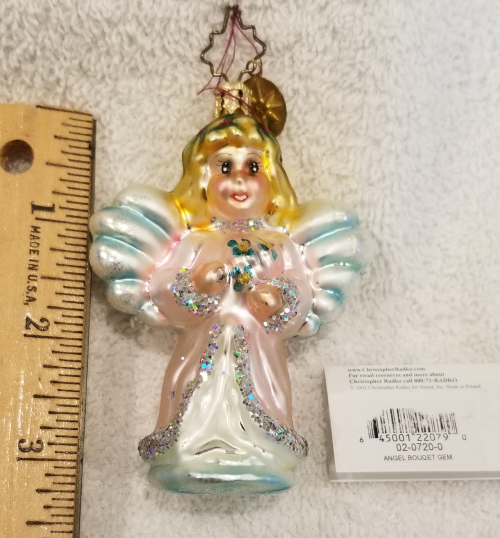 I'm listing Angel Bouquet, Radko number 02-0720-0. This is a simple beautiful angel. The original metal charm is still attached and the paper tag is included. I'm asking only $25 plus shipping via Pirate Ship.