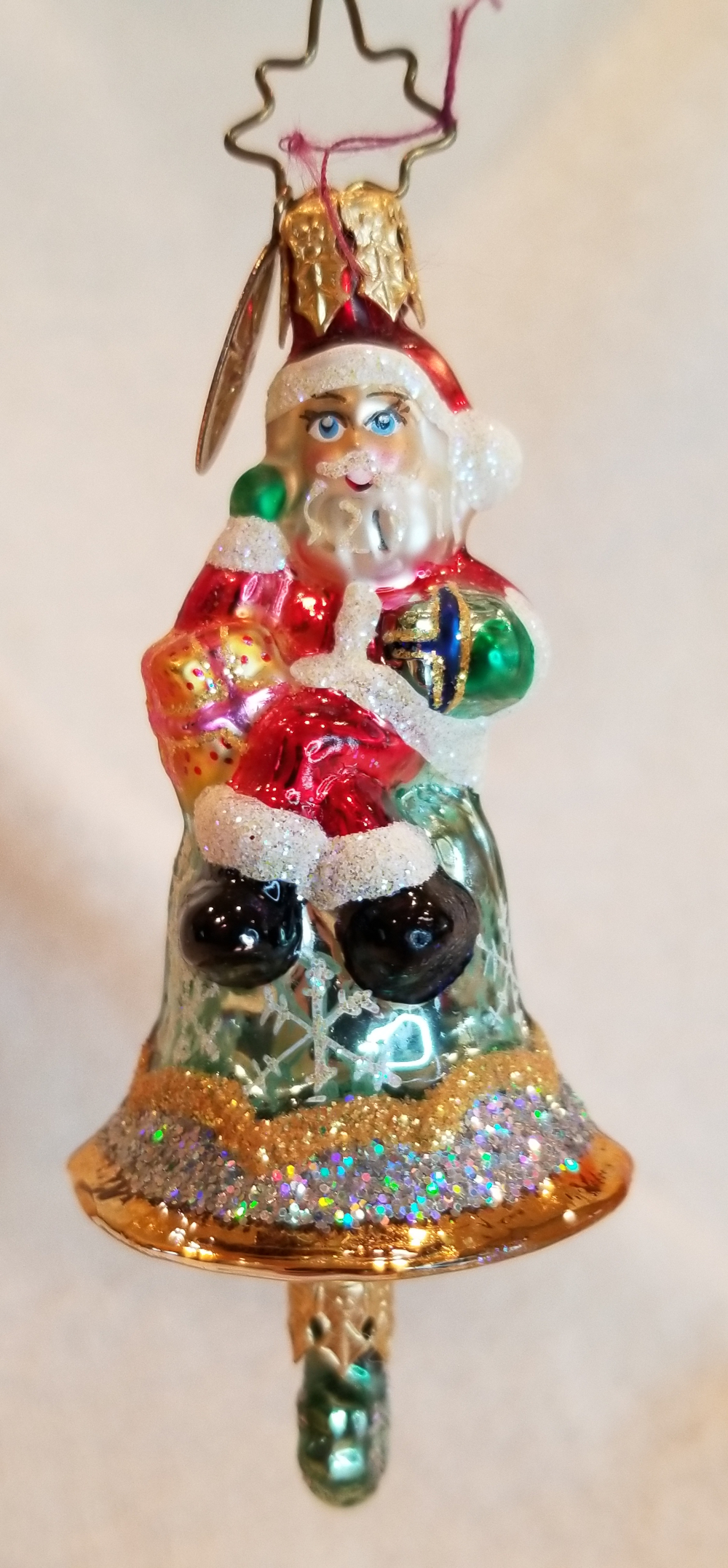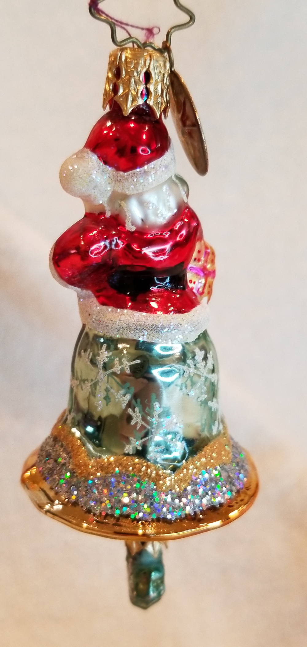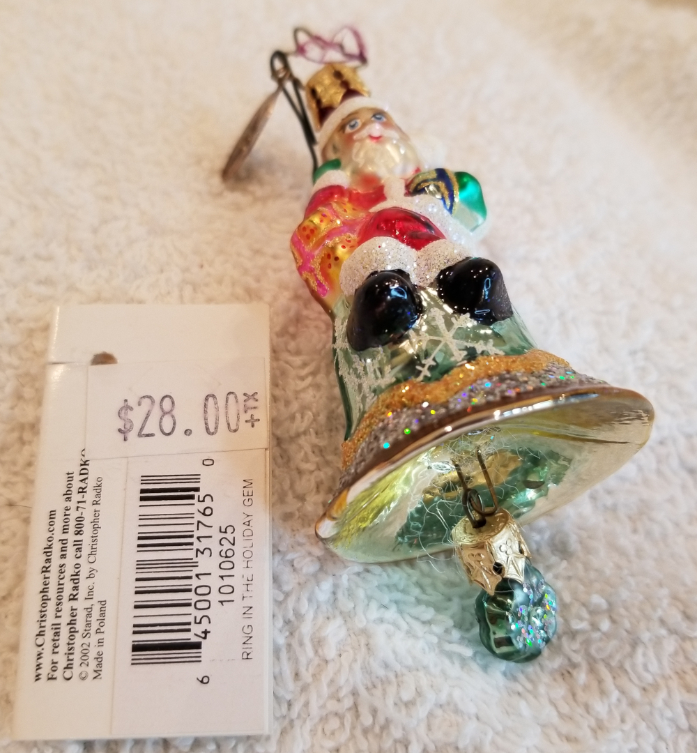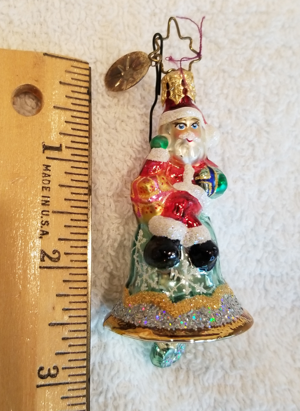 | This is Ring In The Holiday gem, Radko number 1010625. This ornament features Santa carrying some gifts and sitting on a big bell. The original metal charm is still attached and the paper tag is available. There are some white fuzzy strings in the pictures, this is leftover cotton protection and is not a defect on the ornament. I will re-take these pictures asap. I'm asking $30 plus shipping via Pirate Ship however you prefer. Please ask if there are any questions and thanks for taking a look! |