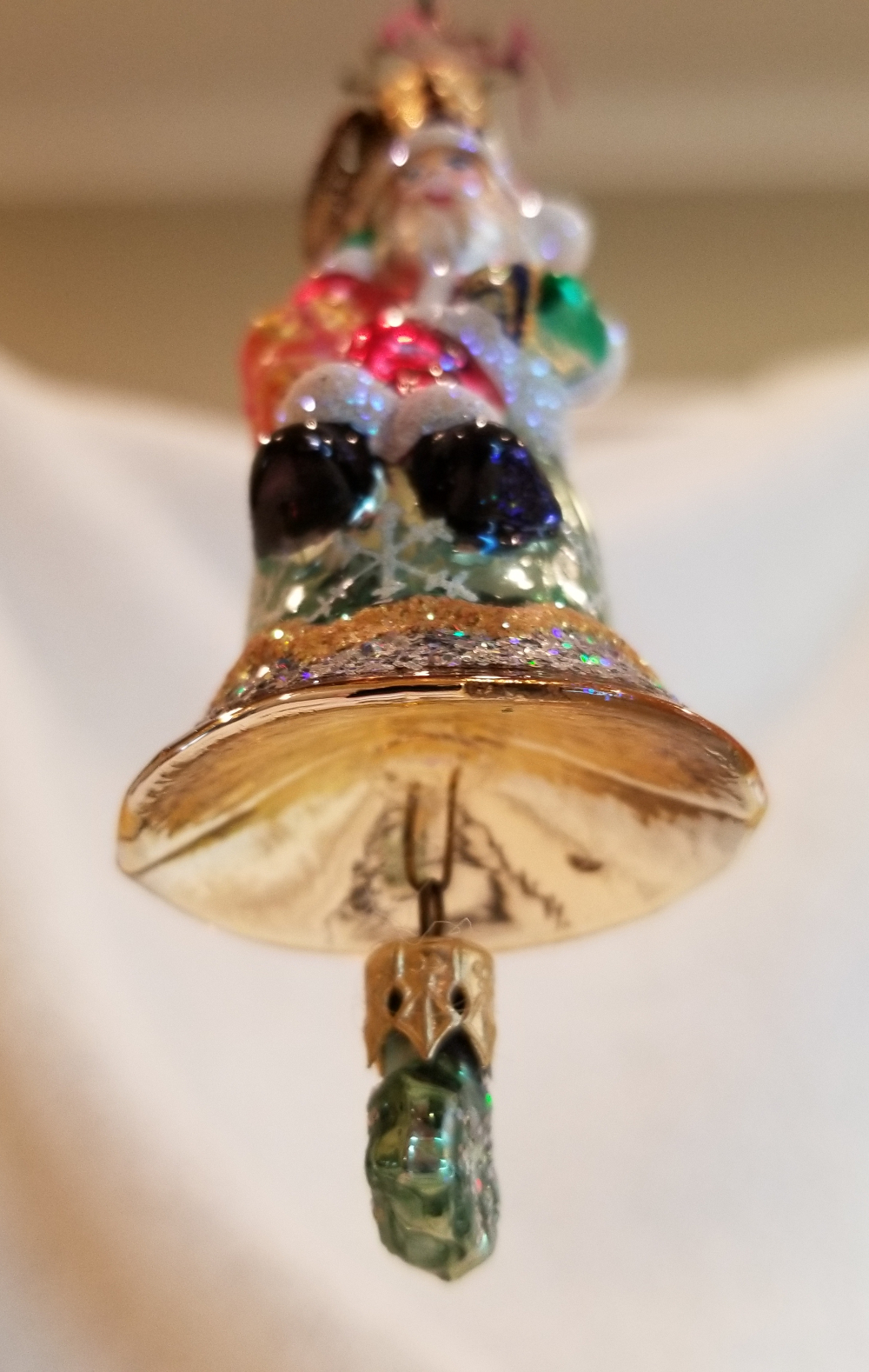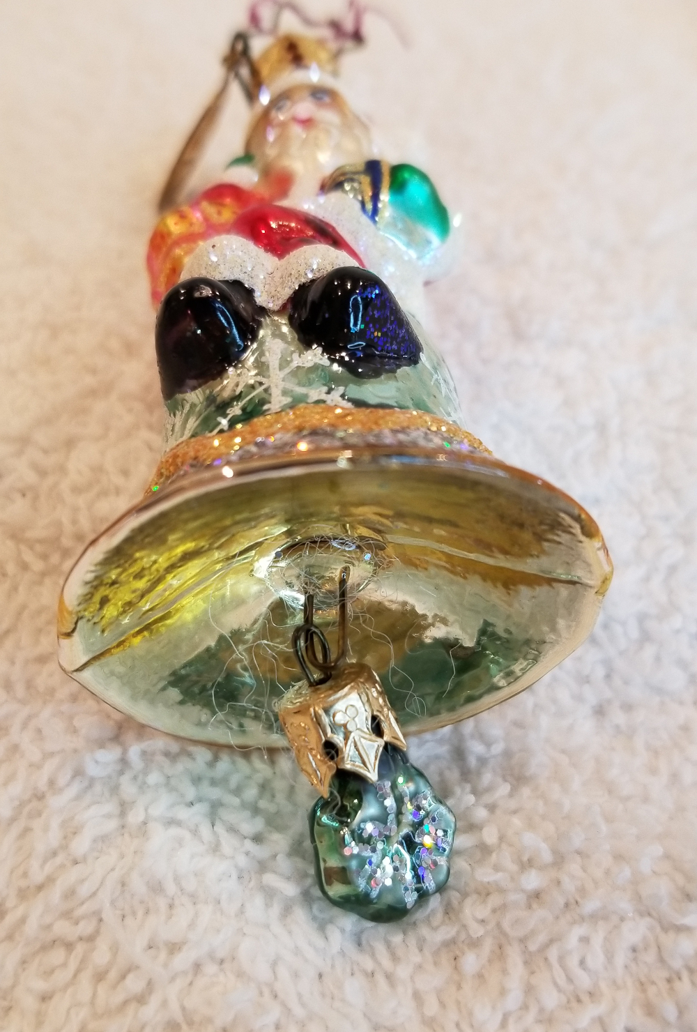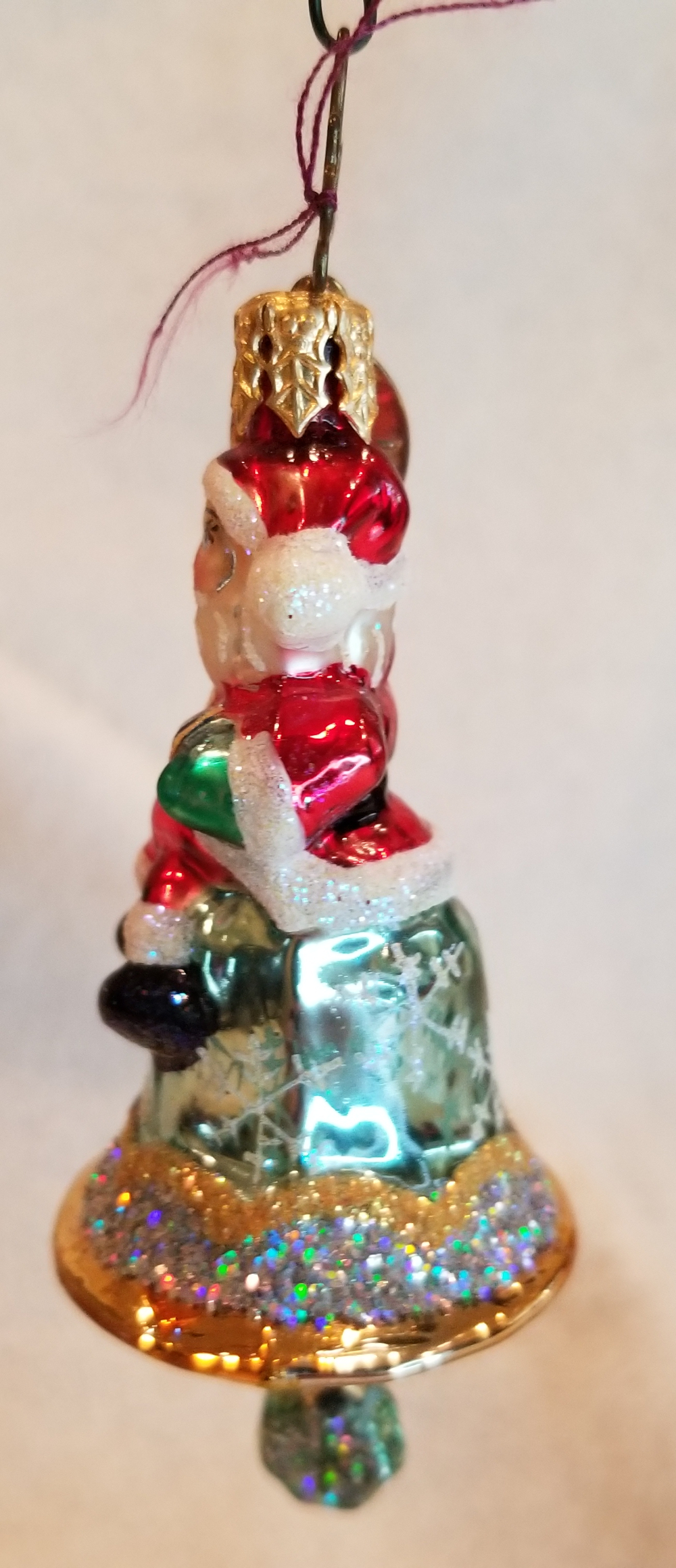 | This is Ring In The Holiday gem, Radko number 1010625. This ornament features Santa carrying some gifts and sitting on a big bell. The original metal charm is still attached and the paper tag is available. There are some white fuzzy strings in the pictures, this is leftover cotton protection and is not a defect on the ornament. I will re-take these pictures asap. I'm asking $30 plus shipping via Pirate Ship however you prefer. Please ask if there are any questions and thanks for taking a look! |