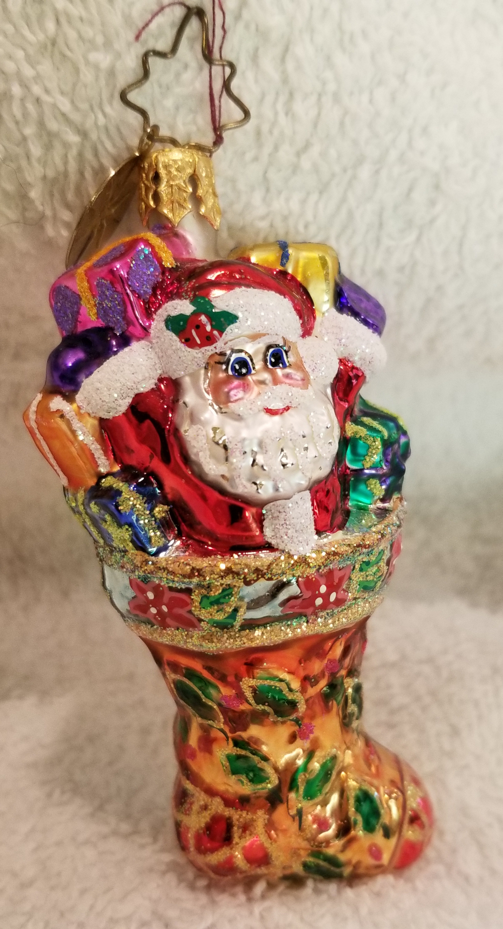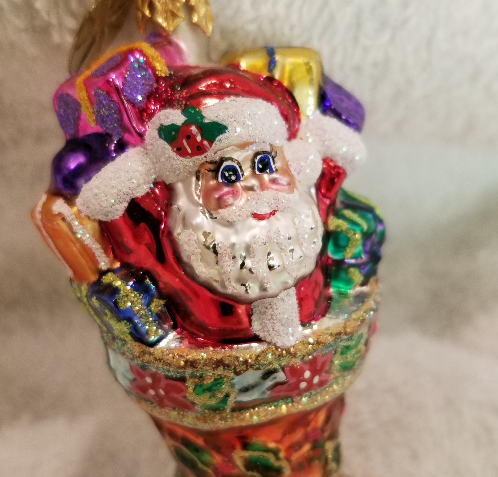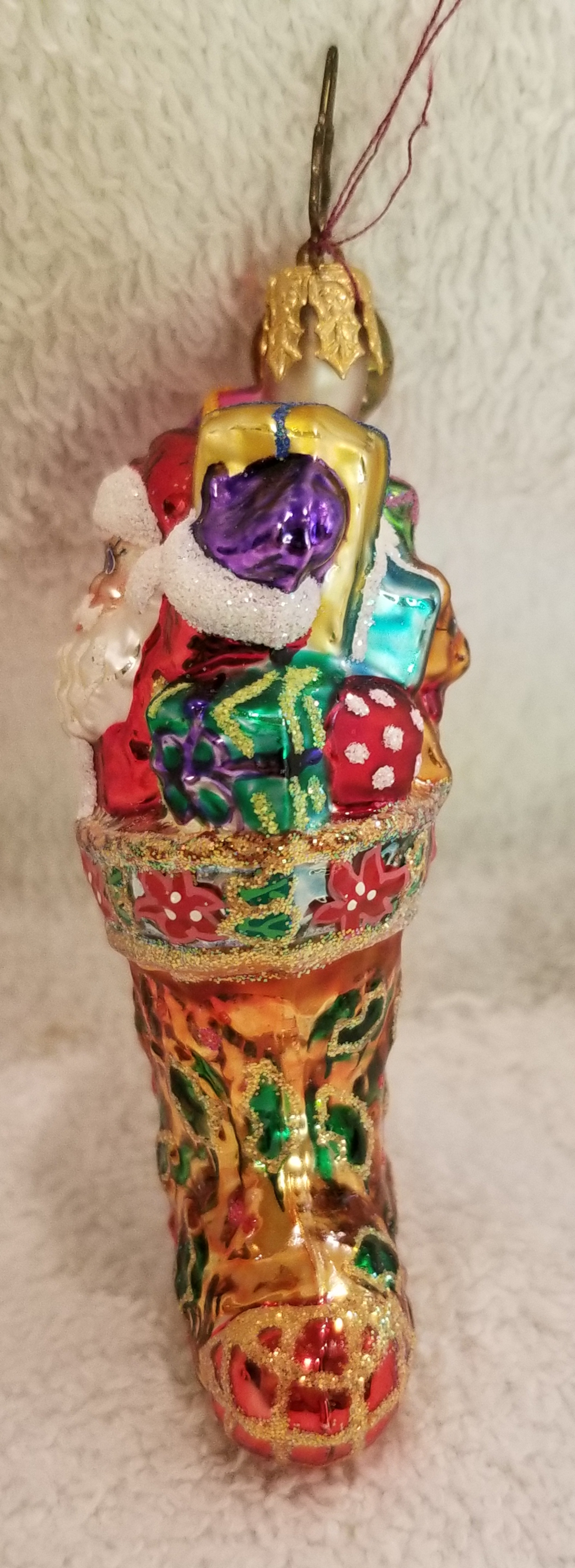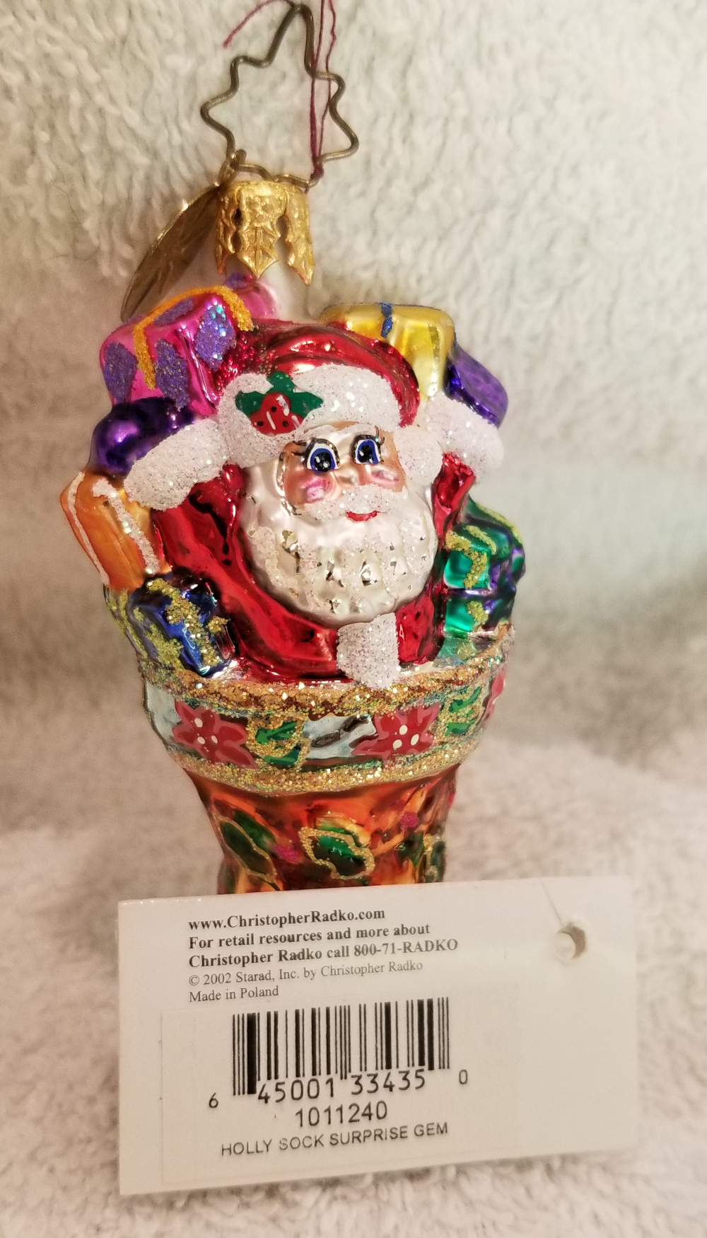 | Today I'm listing Radko number 1011240, Holly Sock Surprise Gem. This is a cute stocking featuring Santa with a bunch of gifts pouring out of the top of the stocking. The original metal charm is still attached and the paper tag is available. I'm asking only $25 plus shipping via Pirate Ship however you prefer. |