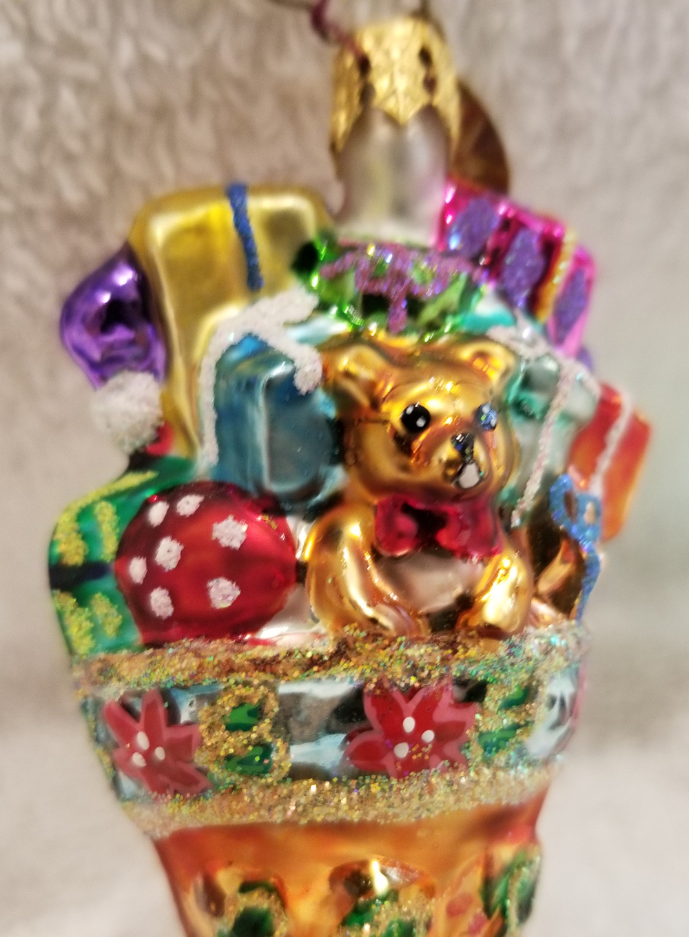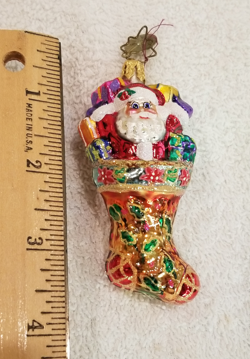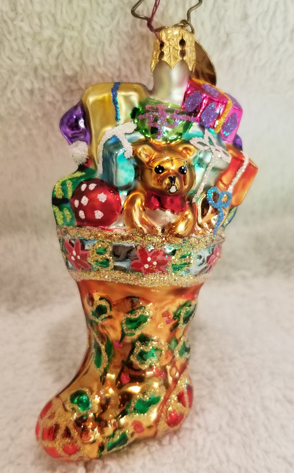 | Today I'm listing Radko number 1011240, Holly Sock Surprise Gem. This is a cute stocking featuring Santa with a bunch of gifts pouring out of the top of the stocking. The original metal charm is still attached and the paper tag is available. I'm asking only $25 plus shipping via Pirate Ship however you prefer. |