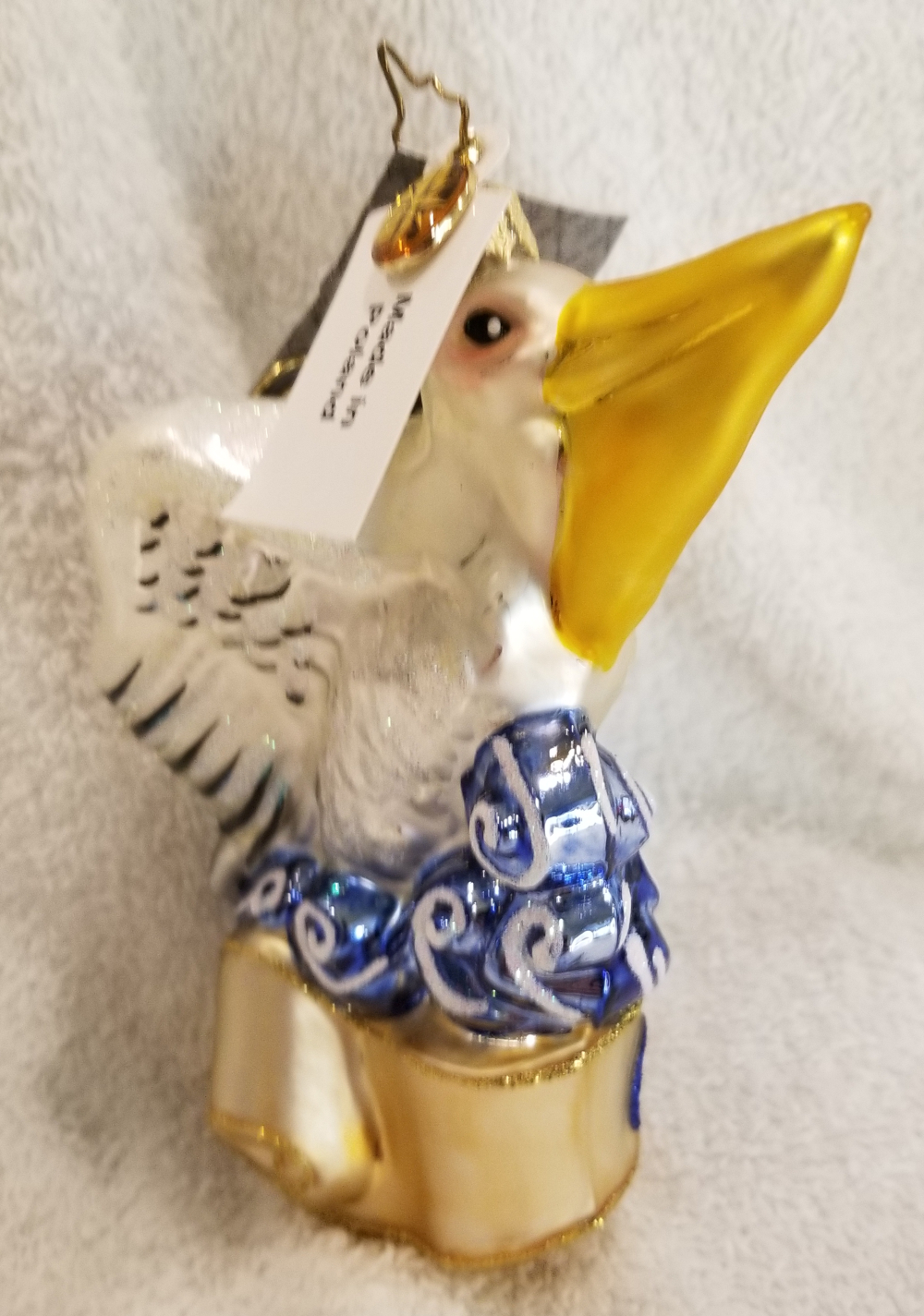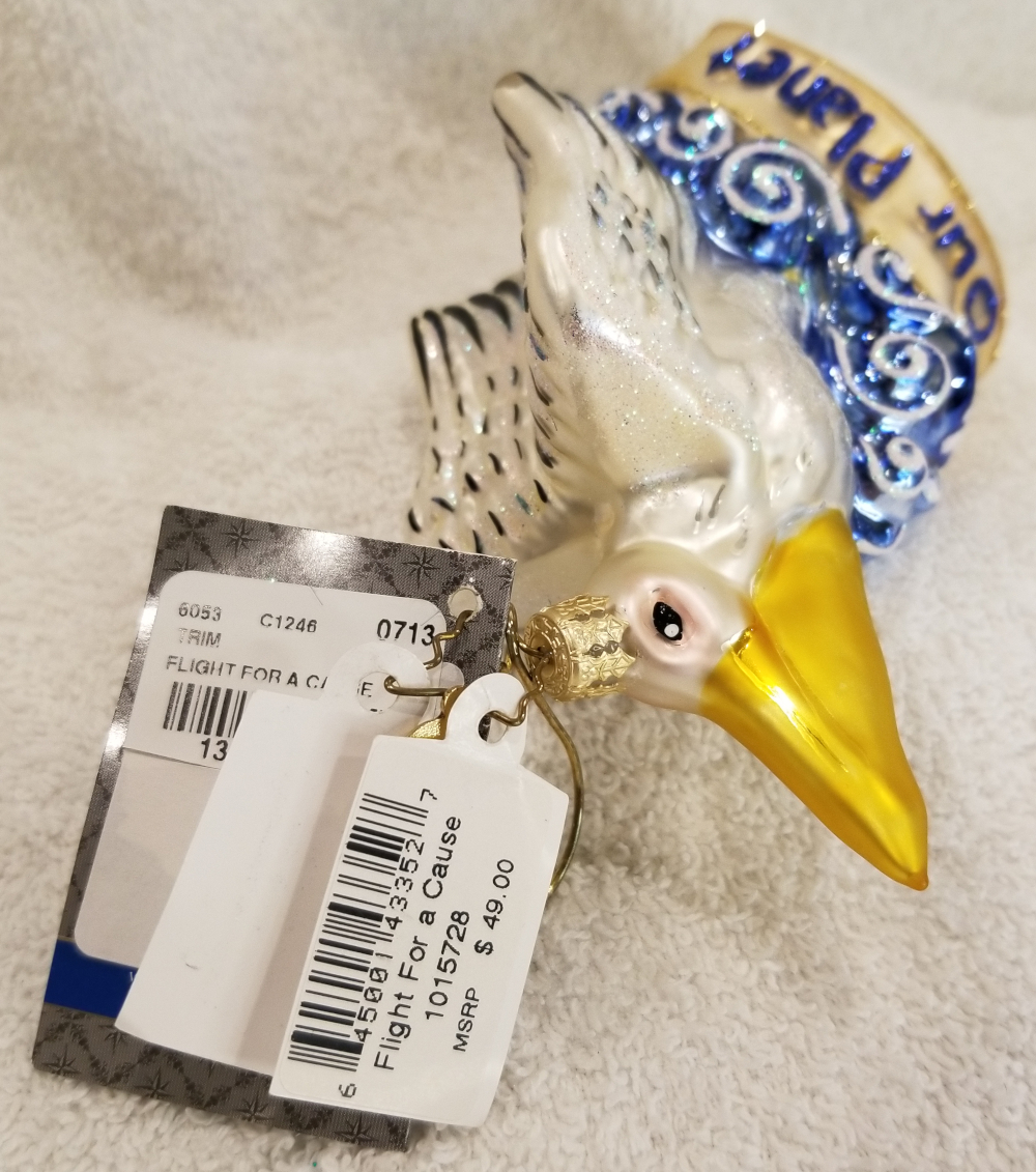 | Today I'm listing Flight for a Cause. From 2011, this is part of Christopher Radko's Environmental Awareness initiative. It is number 1015728. This ornament features a pelican flying over the ocean. All of the tags are still attached. I'm asking the original purchase price of $50 plus shipping via Pirate Ship. |