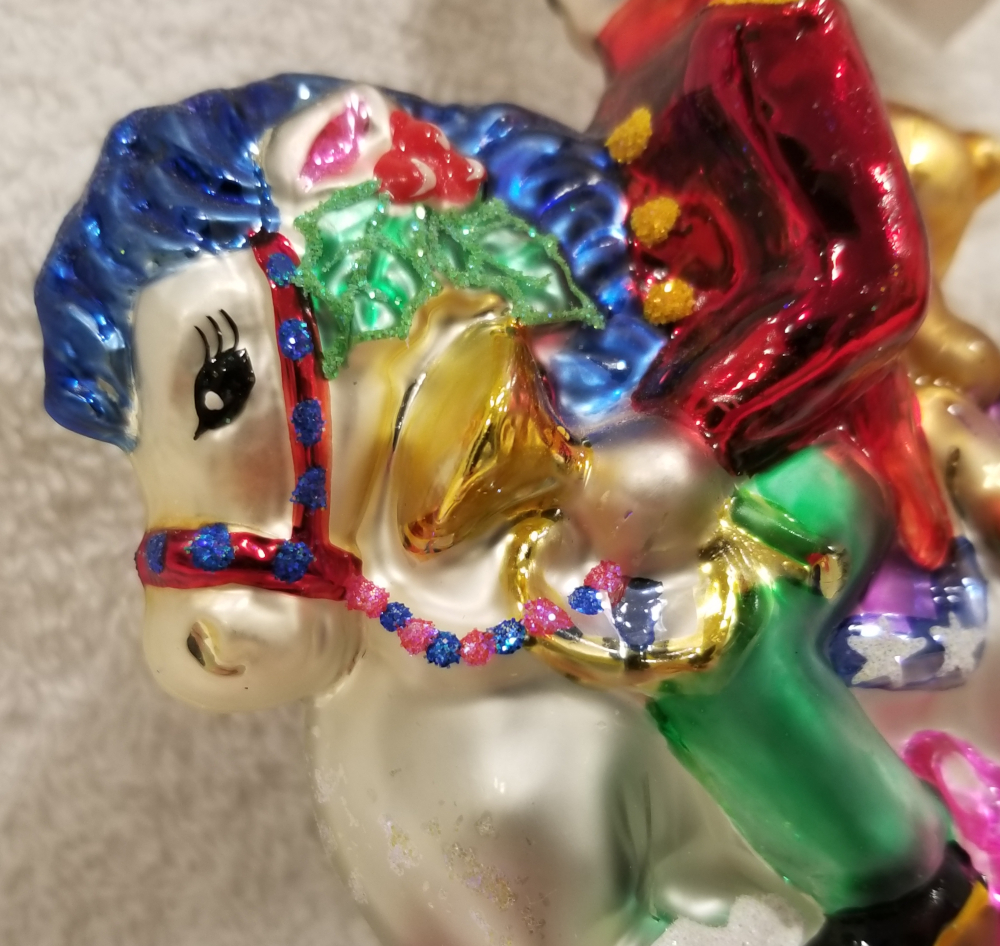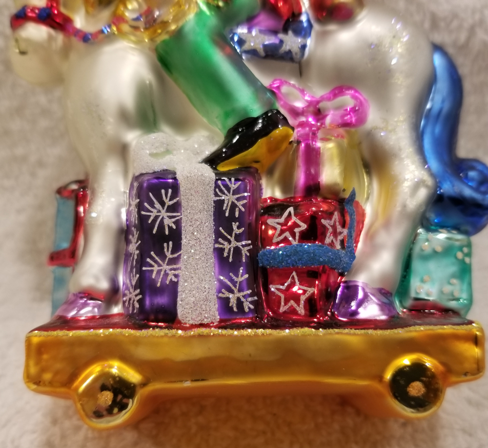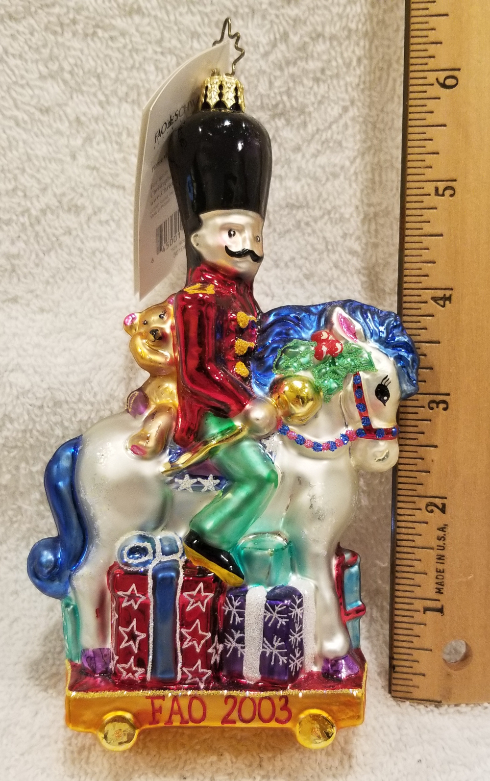 | I'm listing another FAO Schwarz exclusive. This is Toy Soldier, Radko number 3010484. From 2003, this is a soldier riding his trusty horse getting ready to deliver all the beautiful gifts at his feet. The cart is labeled with FAO 2003. The original metal charm and paper tag are included. I'm asking $35 plus shipping via Pirate Ship. |