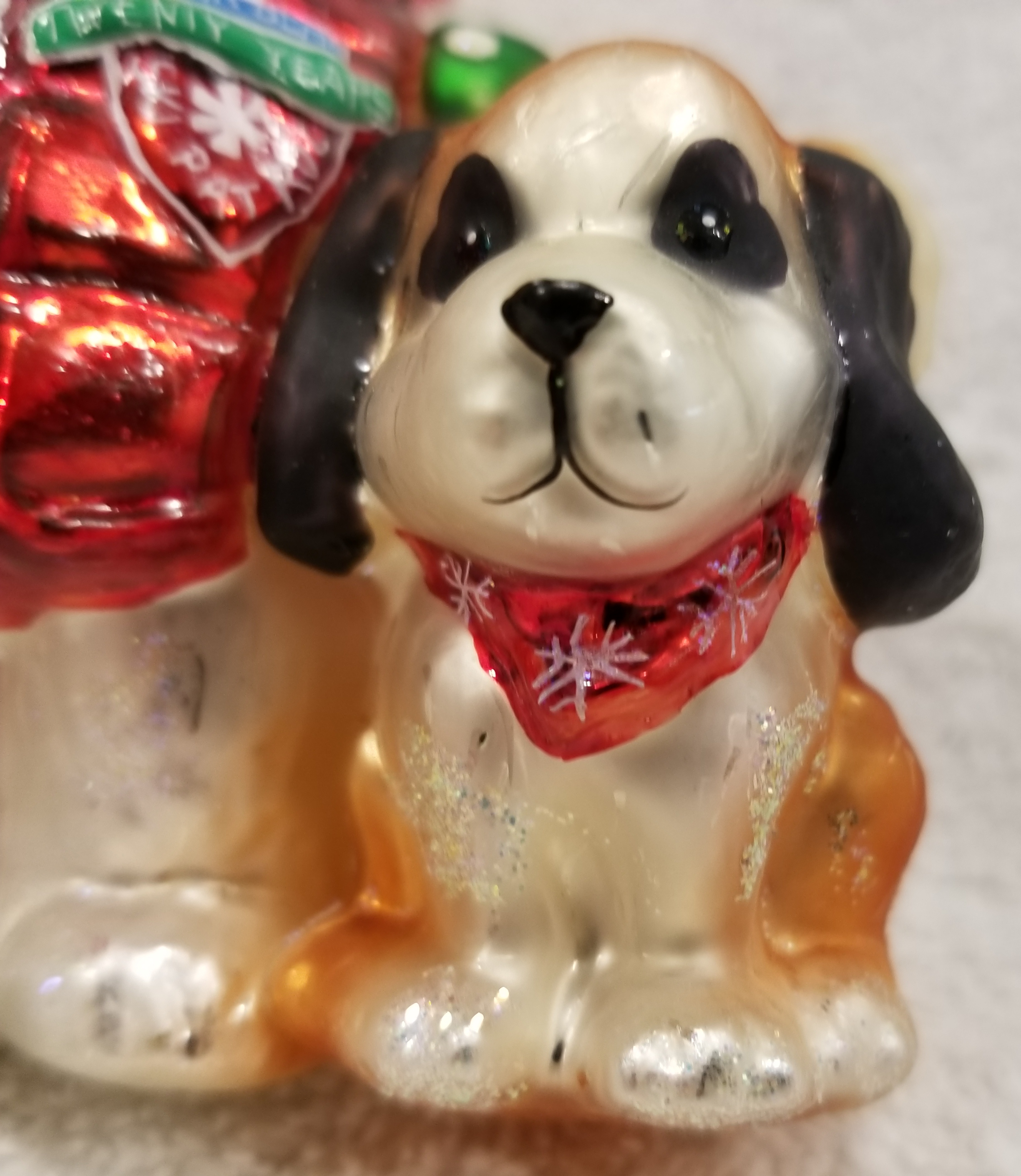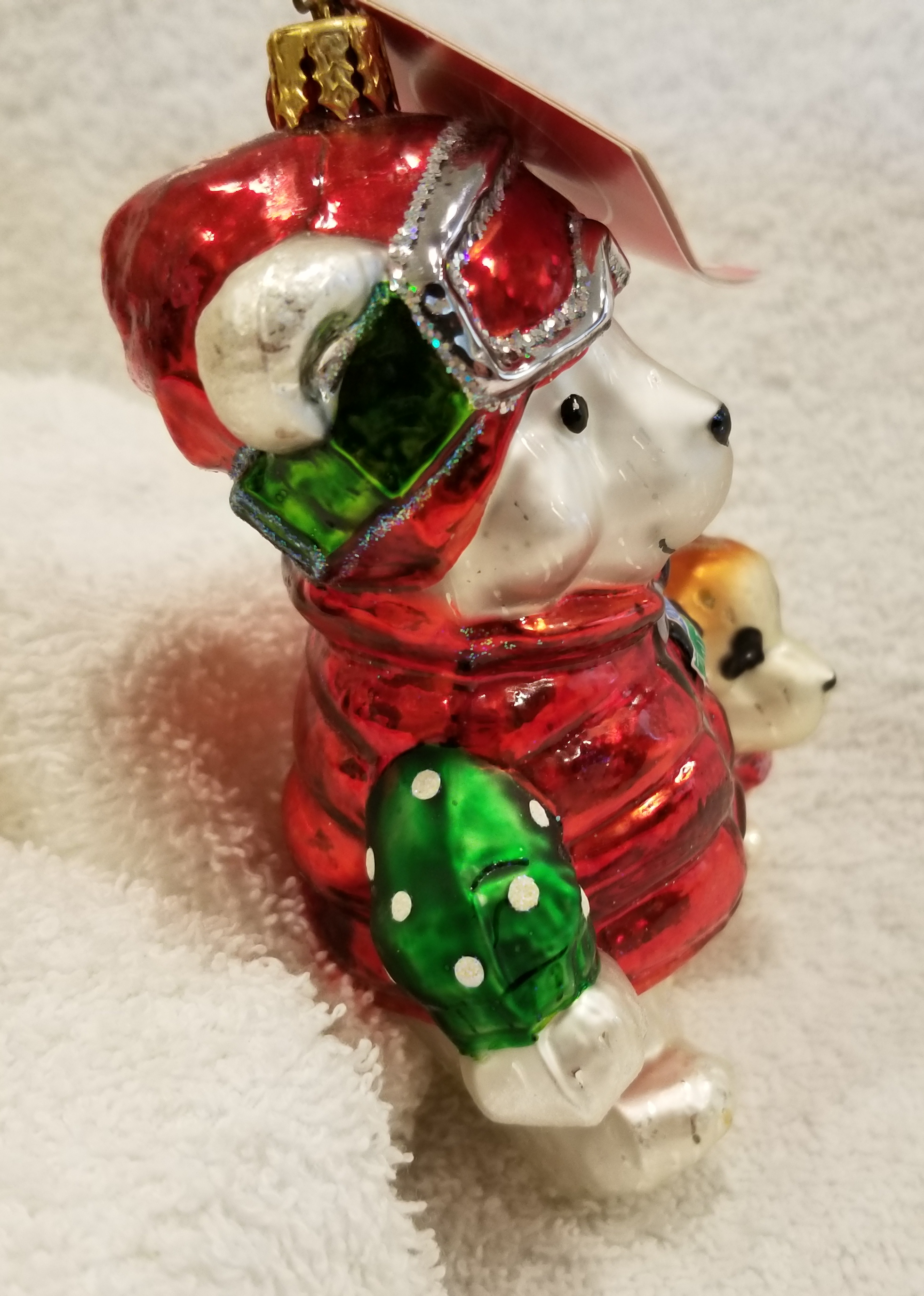 | Today I'm listing another cute bear. This is 2004 Marshall Fields Santa Bear Ski Patrol with pet dog. Radko number 3010797. This is a big bear dressed in ski gear with a red parka and goggles. Next to him is his trusty pet dog. The original metal charm and the paper tag are still attached. I'm asking $40 plus shipping via Pirate Ship however you prefer. Please ask if there are any questions and thanks for taking a look! |
