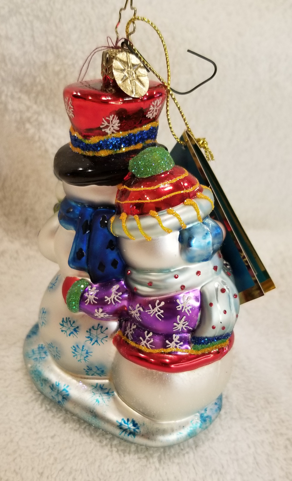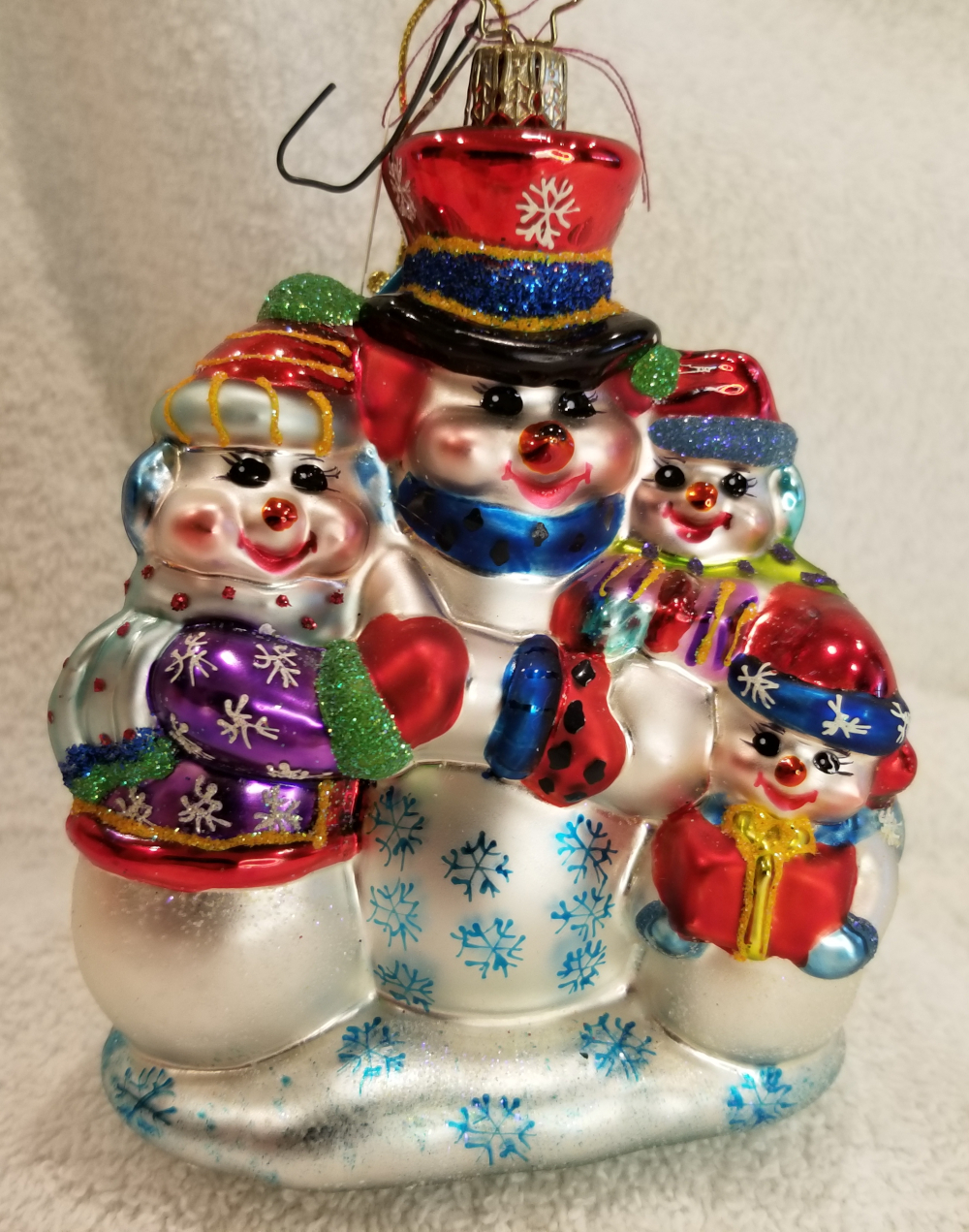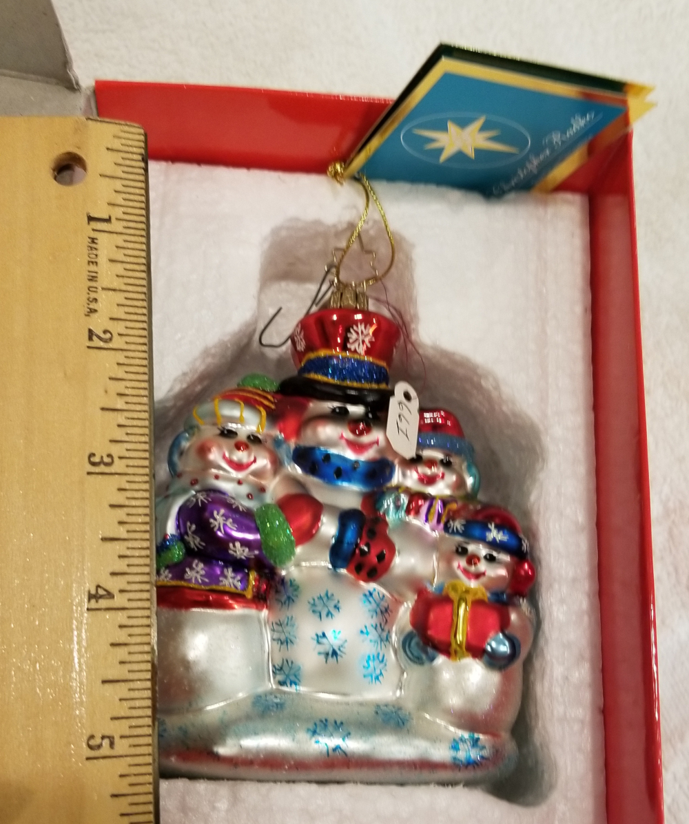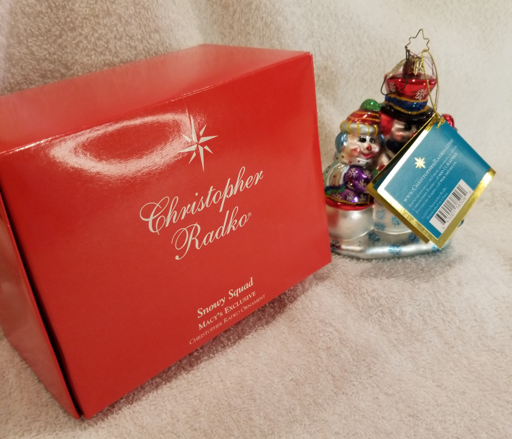 | This is another Macy's Exclusive, Snowy Squad, a really cute snowman family. It is Radko number 3011256. Featuring a mom and dad with two kids. This one includes the red Radko box in the pictures. The original metal charm and the paper tag are attached. I'm asking $30 plus shipping via Pirate Ship. |