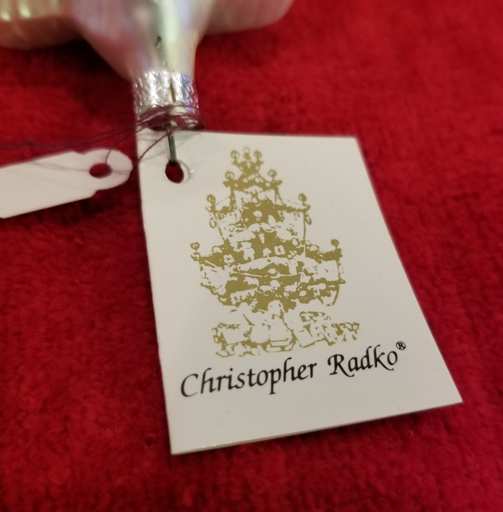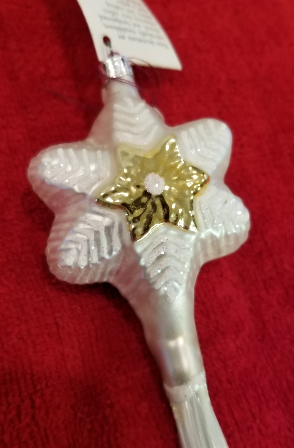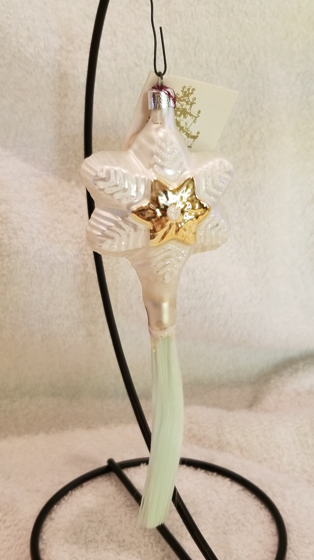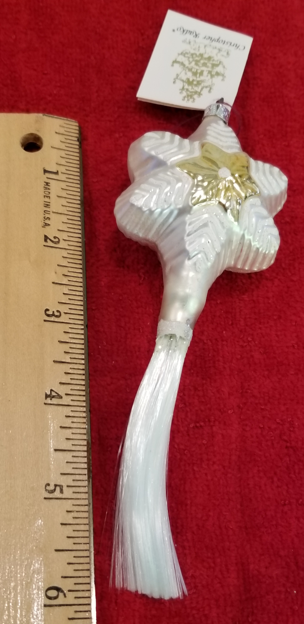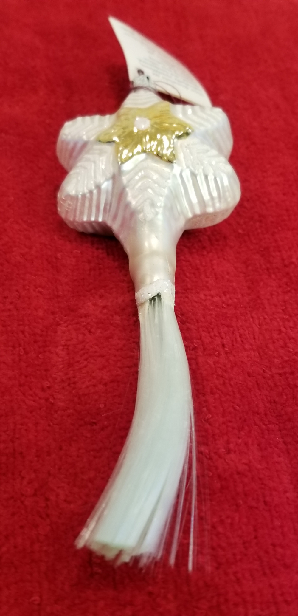 | This one is rare! From 1991 this is "Comet", the double-sided star with tail. Radko number 91-062-0. This is a beautiful white and gold star with a flowing white tail. The original paper tag is still attached. I'm asking $50 plus shipping via Pirate Ship however you prefer. |
