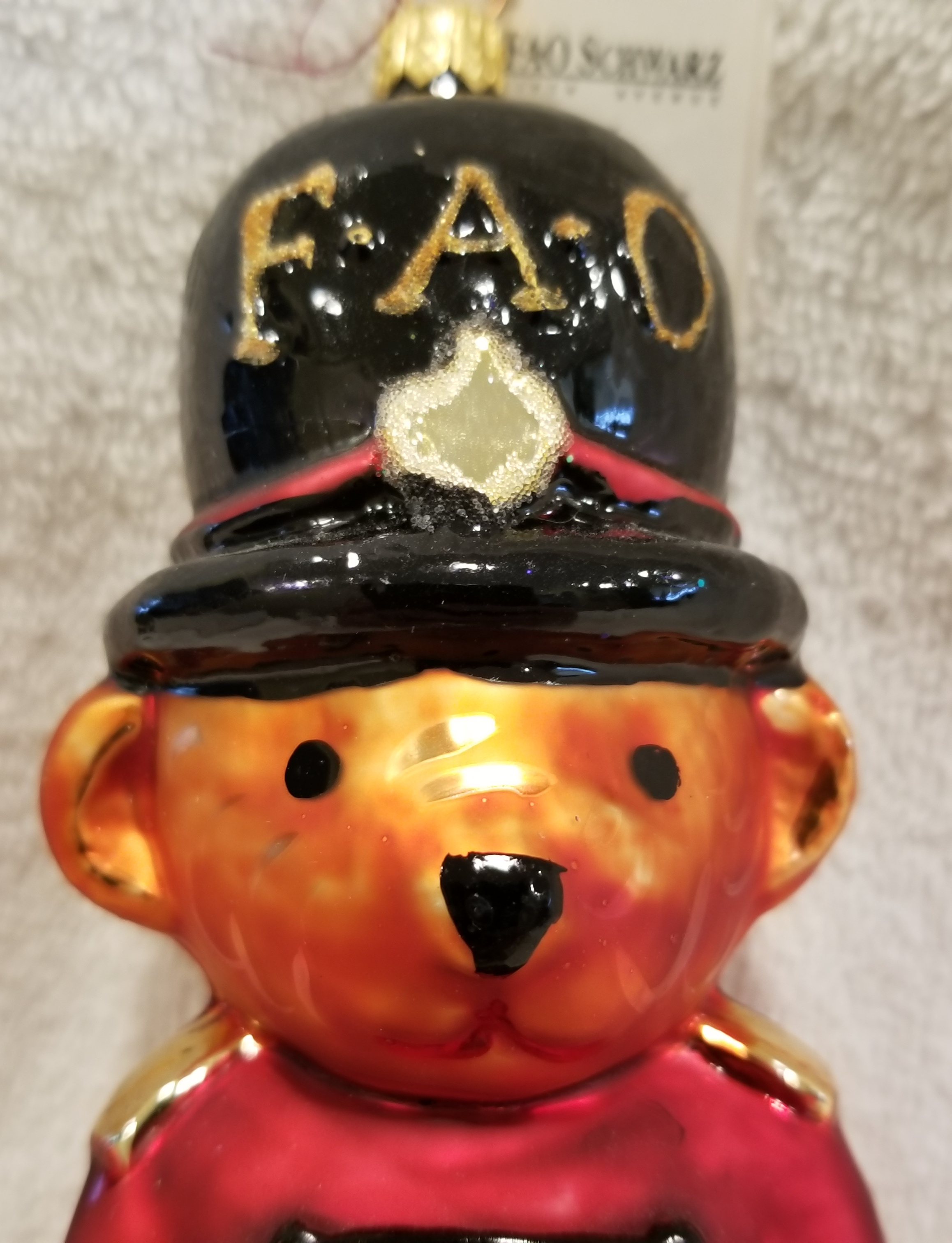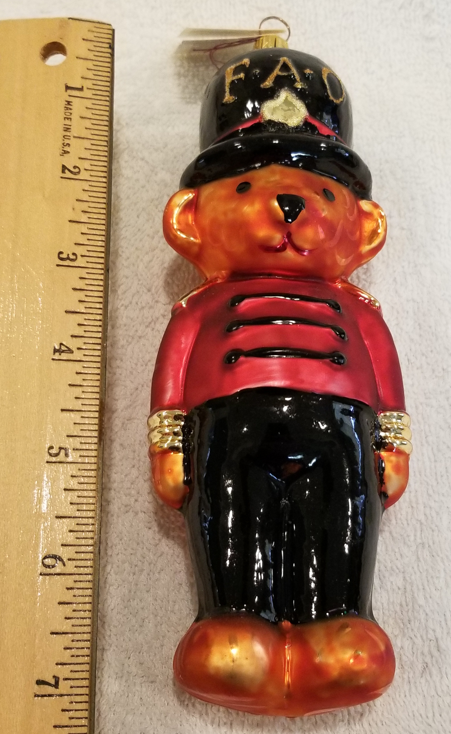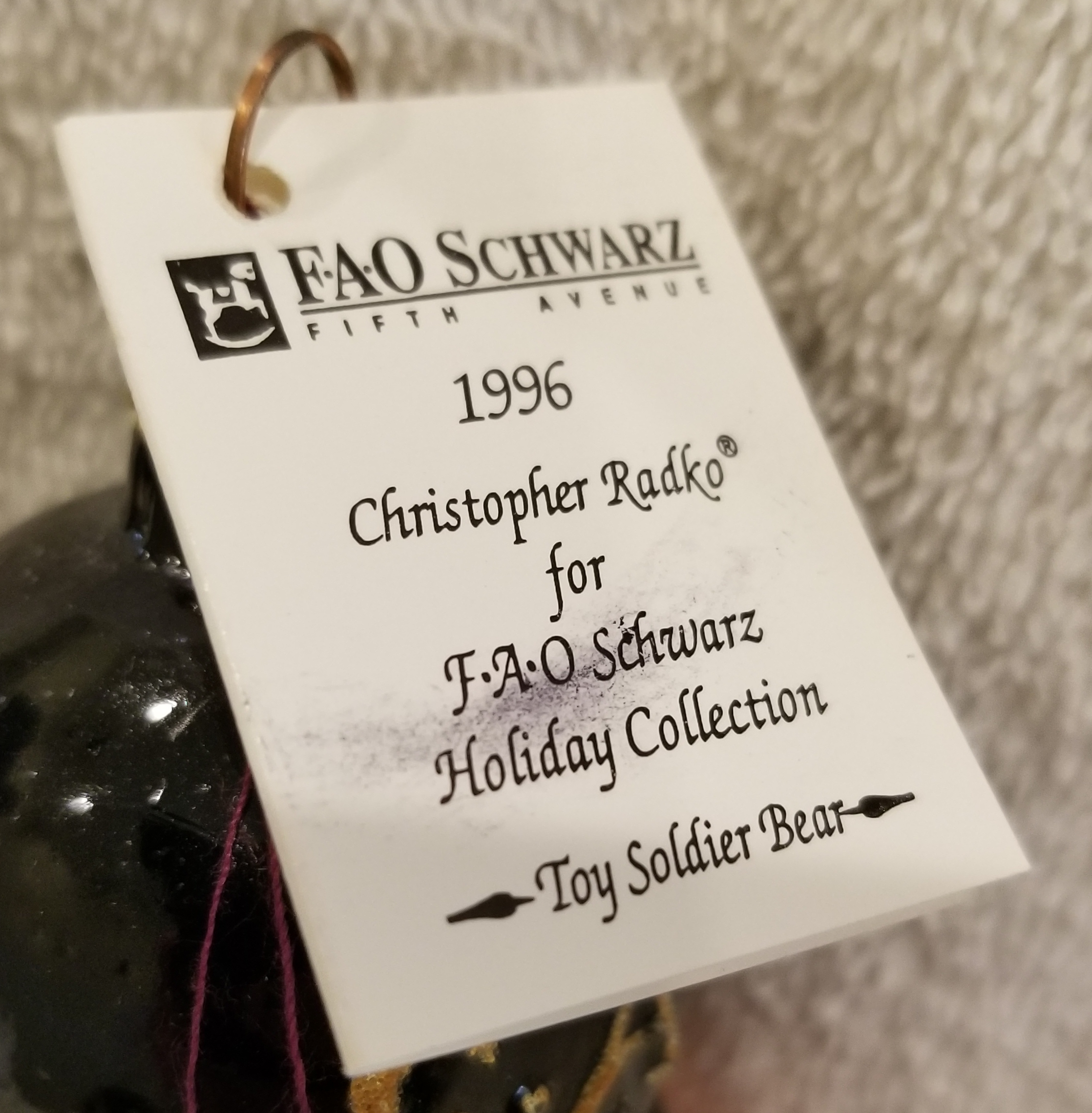 | This week I'm listing more FAO Schwarz exclusive ornaments. Today's listing is for 1996 Toy Soldier Bear. Radko number 96-FAO-01. This bear stands approx. 7" tall and the original paper tag is attached. There were only 5000 produced and this one is number 1337. I'm asking only $50 plus shipping via Pirate Ship however you prefer. Please ask if there are any questions and thanks for taking a look! |