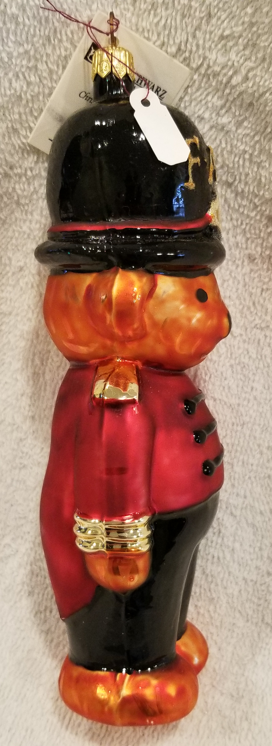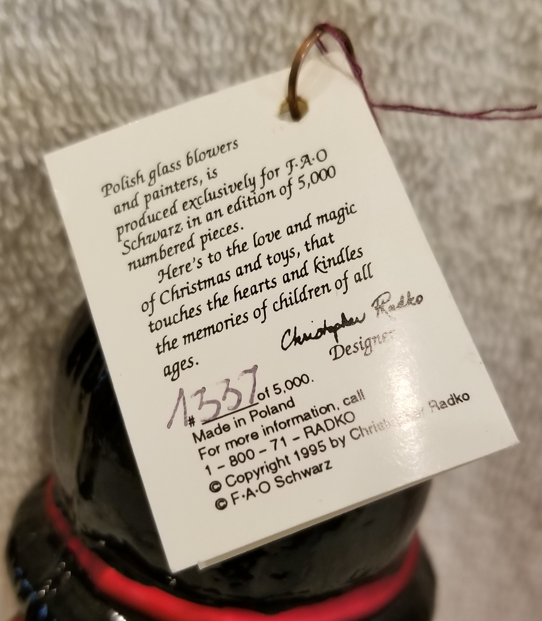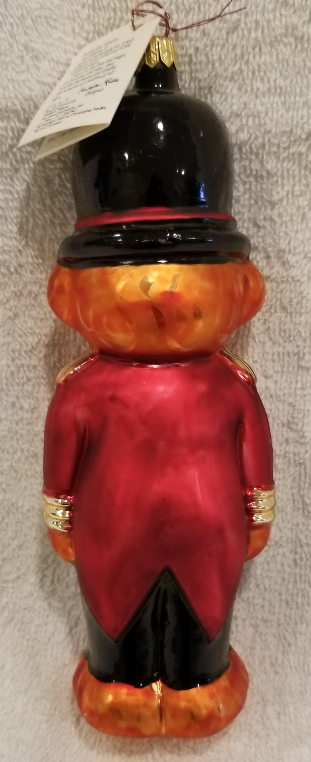 | This week I'm listing more FAO Schwarz exclusive ornaments. Today's listing is for 1996 Toy Soldier Bear. Radko number 96-FAO-01. This bear stands approx. 7" tall and the original paper tag is attached. There were only 5000 produced and this one is number 1337. I'm asking only $50 plus shipping via Pirate Ship however you prefer. Please ask if there are any questions and thanks for taking a look! |