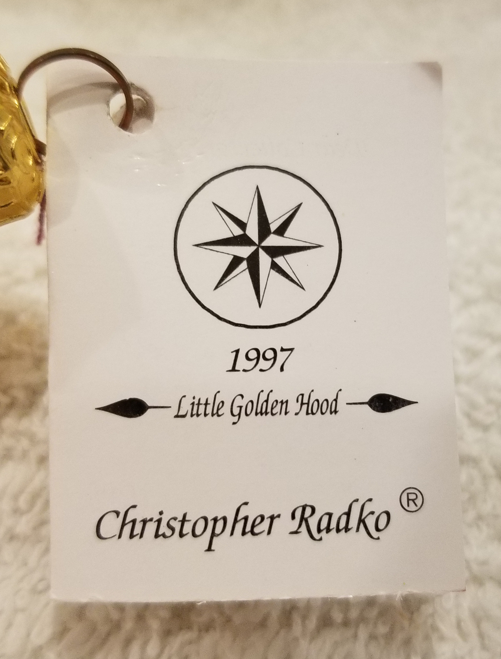 | I'm listing a special event ornament from 1997. This is Little Golden Hood, Radko # 97-261-E. This is Santa in beautiful golden robes with green Christmas tree accents carrying a red sack full of gifts. The original paper tag is still attached. I'm asking $40 plus shipping via Pirate Ship. |