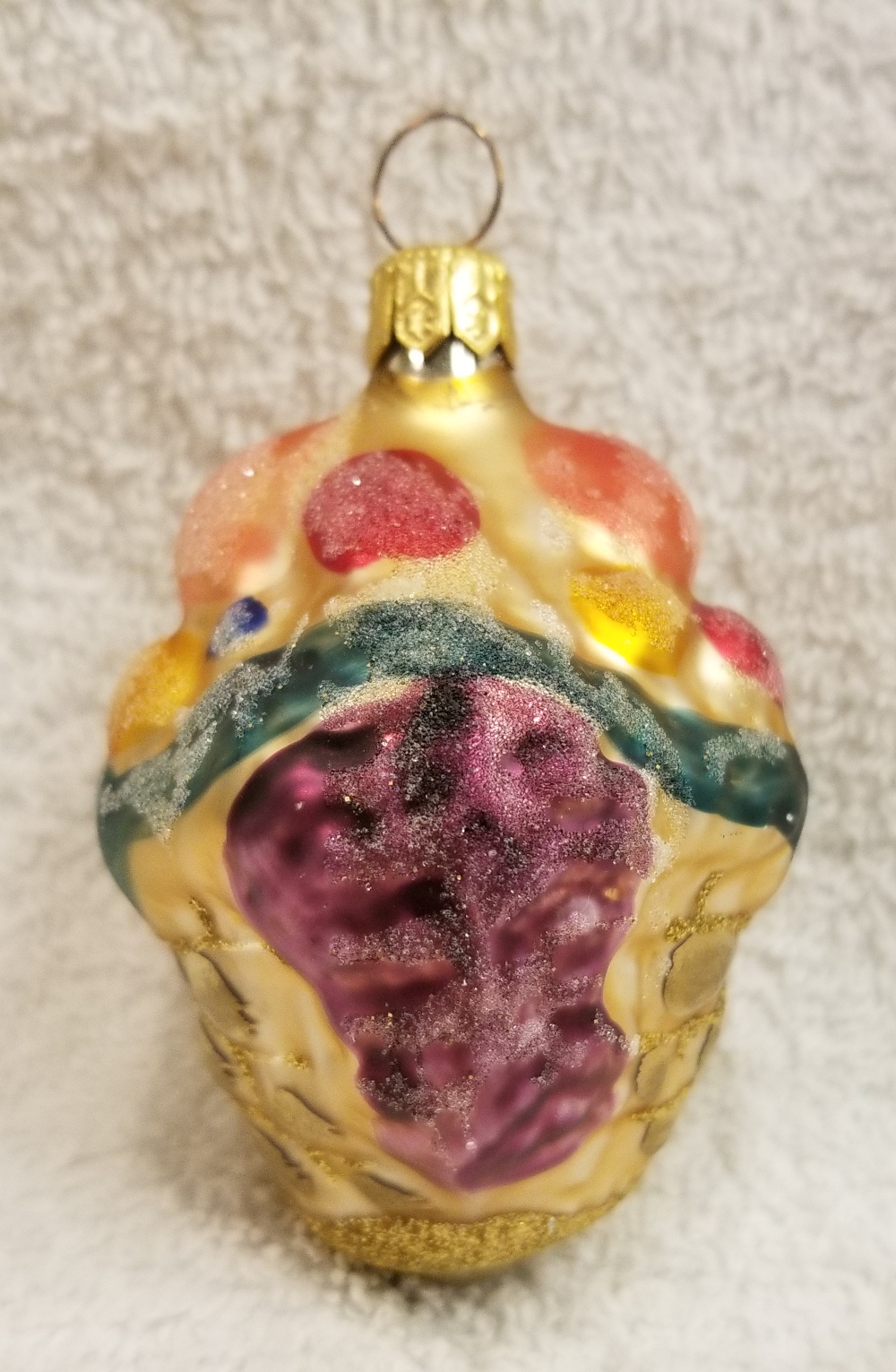 | I'm listing Harvest Home, Radko number 97-371-1. This is another fruit basket, but this one has frosted fruit and is a different style basket than the usual square style. It stands approx. 3" tall and the original paper tag is available. I'm asking only $25 plus shipping via Pirate Ship. |