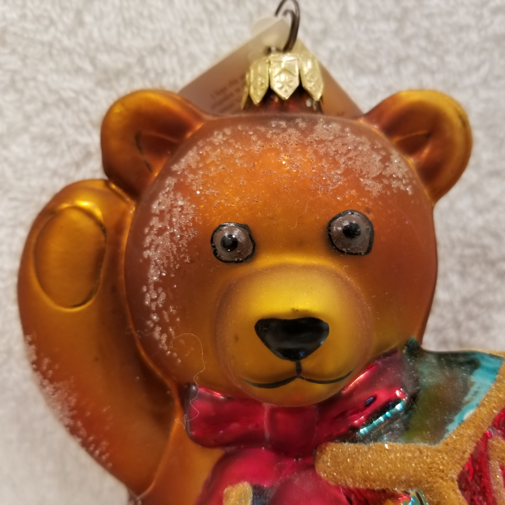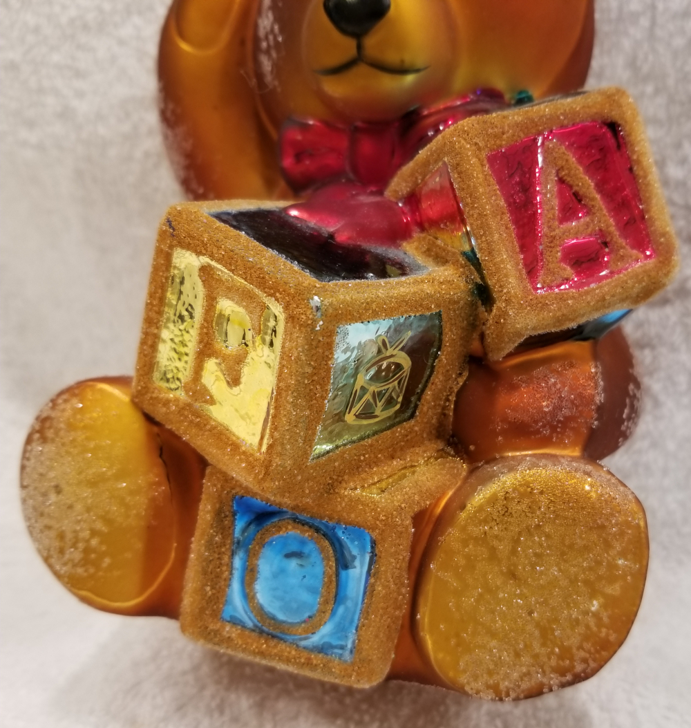 | I'm listing another cute FAO Schwarz bear. This is Toy Block Bear, Radko number 97-FAO-03. This is a big brown bear sitting with FAO wooden blocks. It is a limited edition number 982 of only 5000 produced. You can see some spots of discoloration on the back side of the bear in the pictures. The original paper tag is attached. I'm asking $65 plus shipping via Pirate Ship. |
