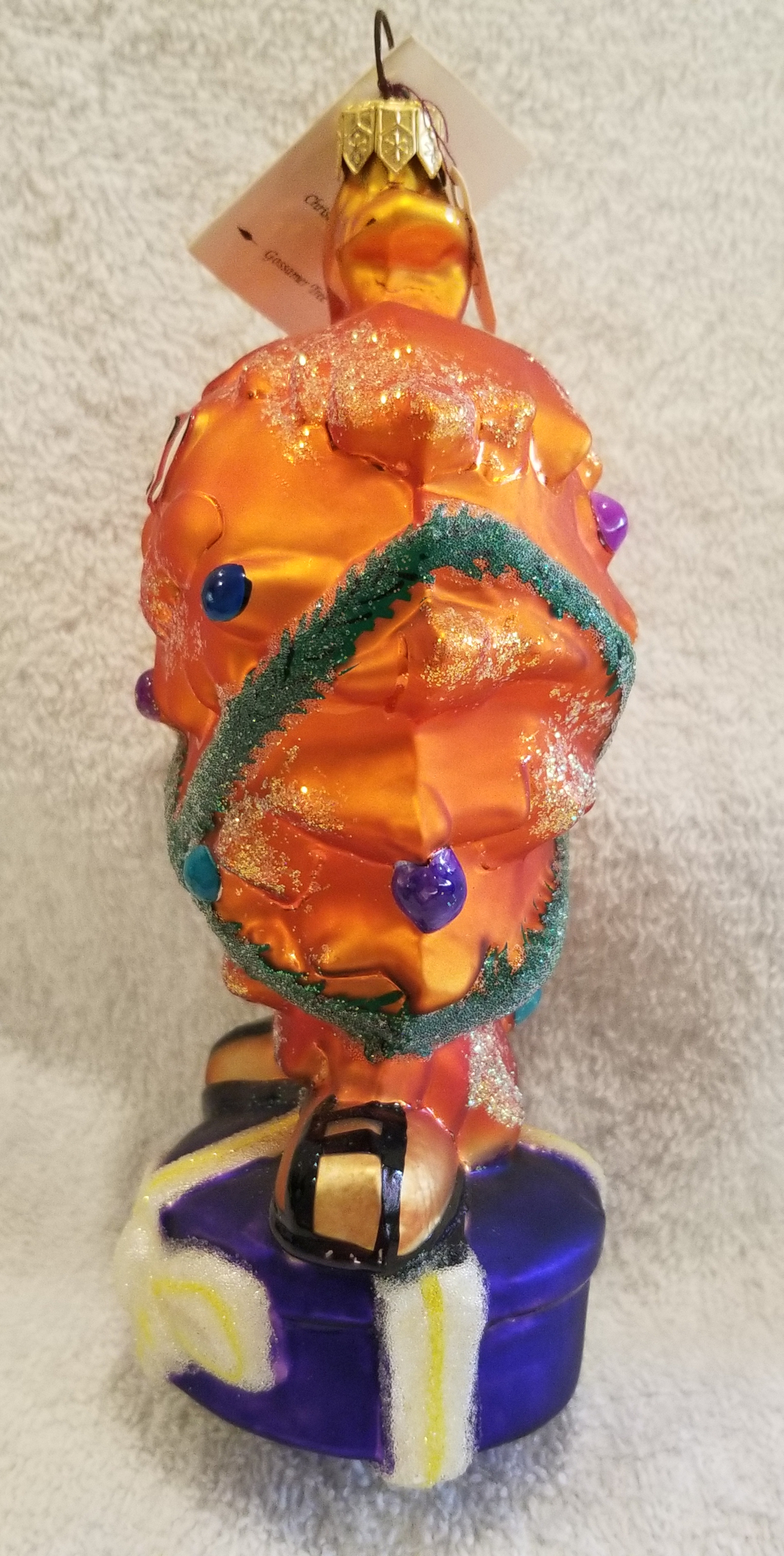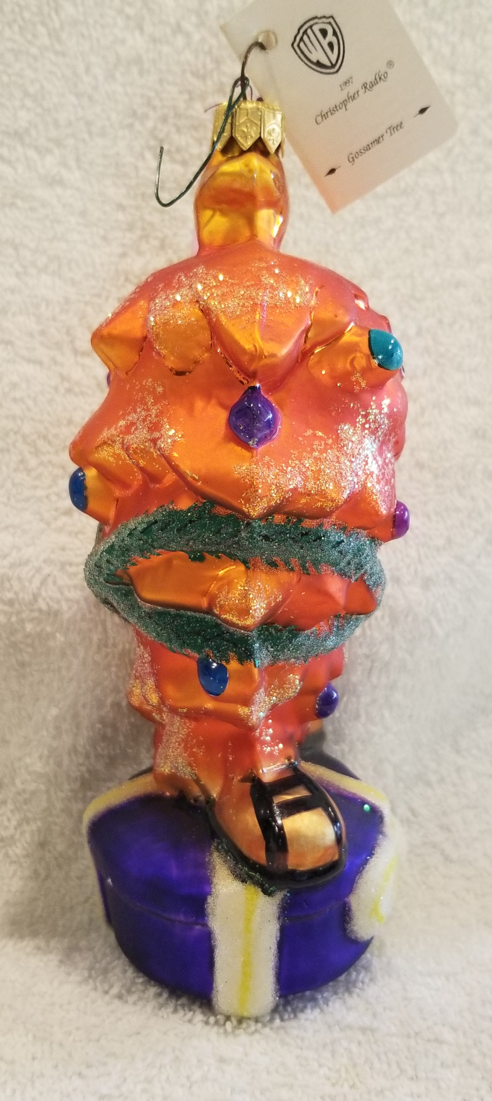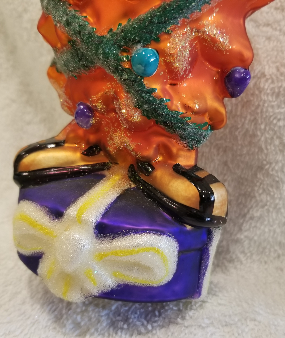 | I'm listing another Warner Brothers collaboration. This is 1997 Gossamer Tree, Radko number 97-GOS. This is Gossamer from the Bugs Bunny cartoons wrapped in green ivy and decorated with shiny Christmas balls. He is standing on a big blue hat-box style present. I'm asking $65 plus shipping via Pirate Ship. |
