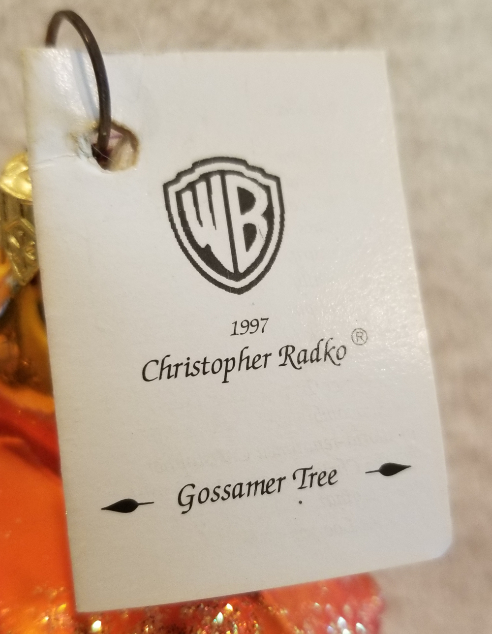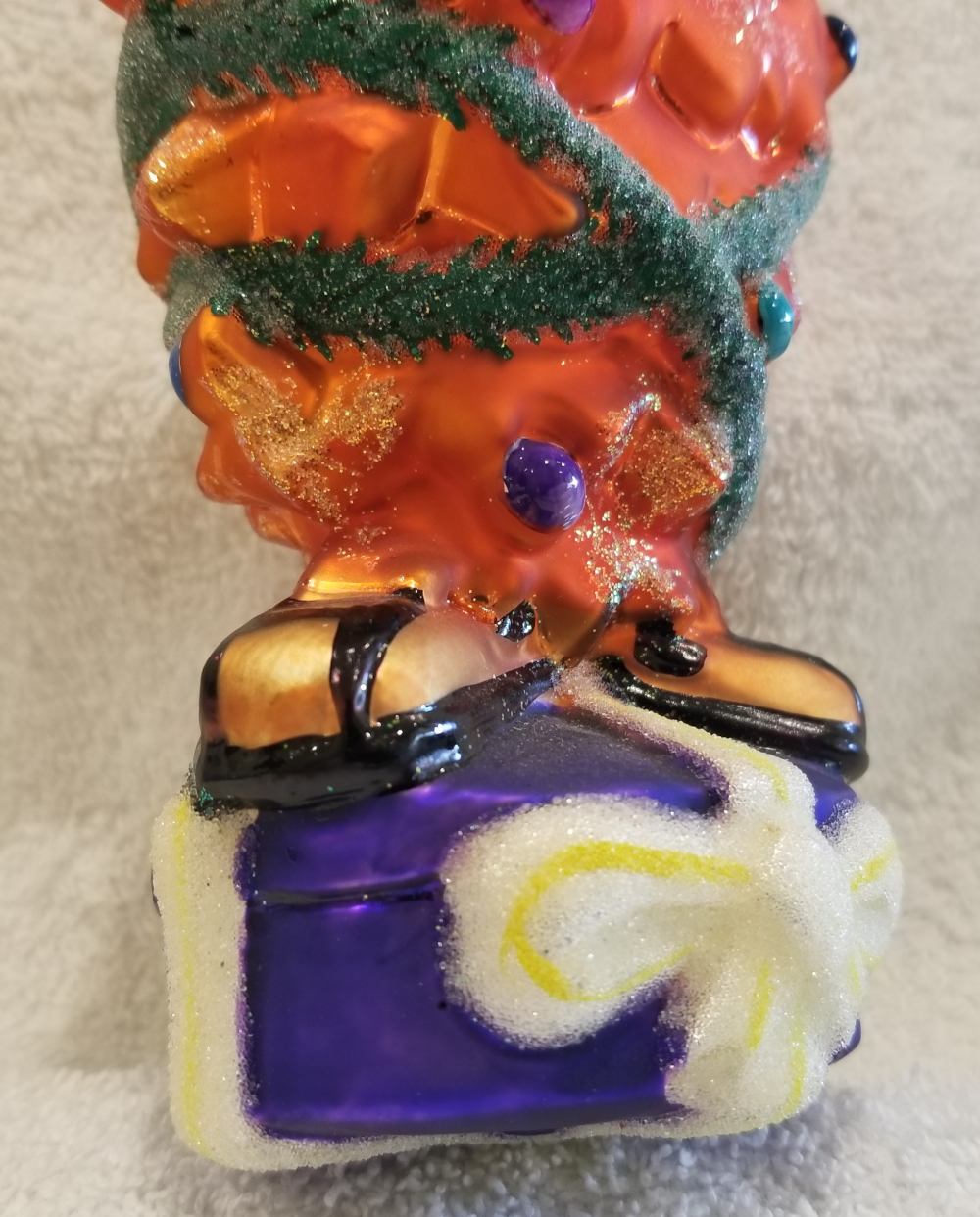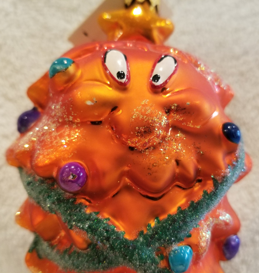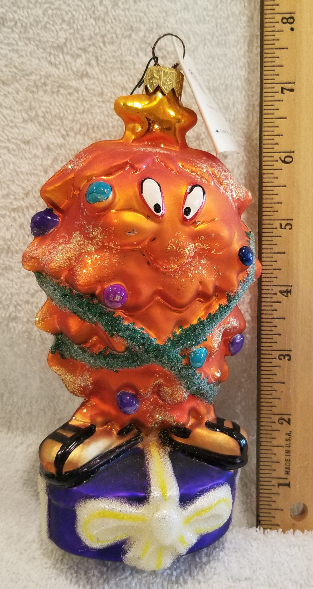 | I'm listing another Warner Brothers collaboration. This is 1997 Gossamer Tree, Radko number 97-GOS. This is Gossamer from the Bugs Bunny cartoons wrapped in green ivy and decorated with shiny Christmas balls. He is standing on a big blue hat-box style present. I'm asking $65 plus shipping via Pirate Ship. |