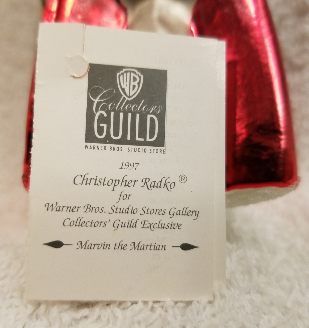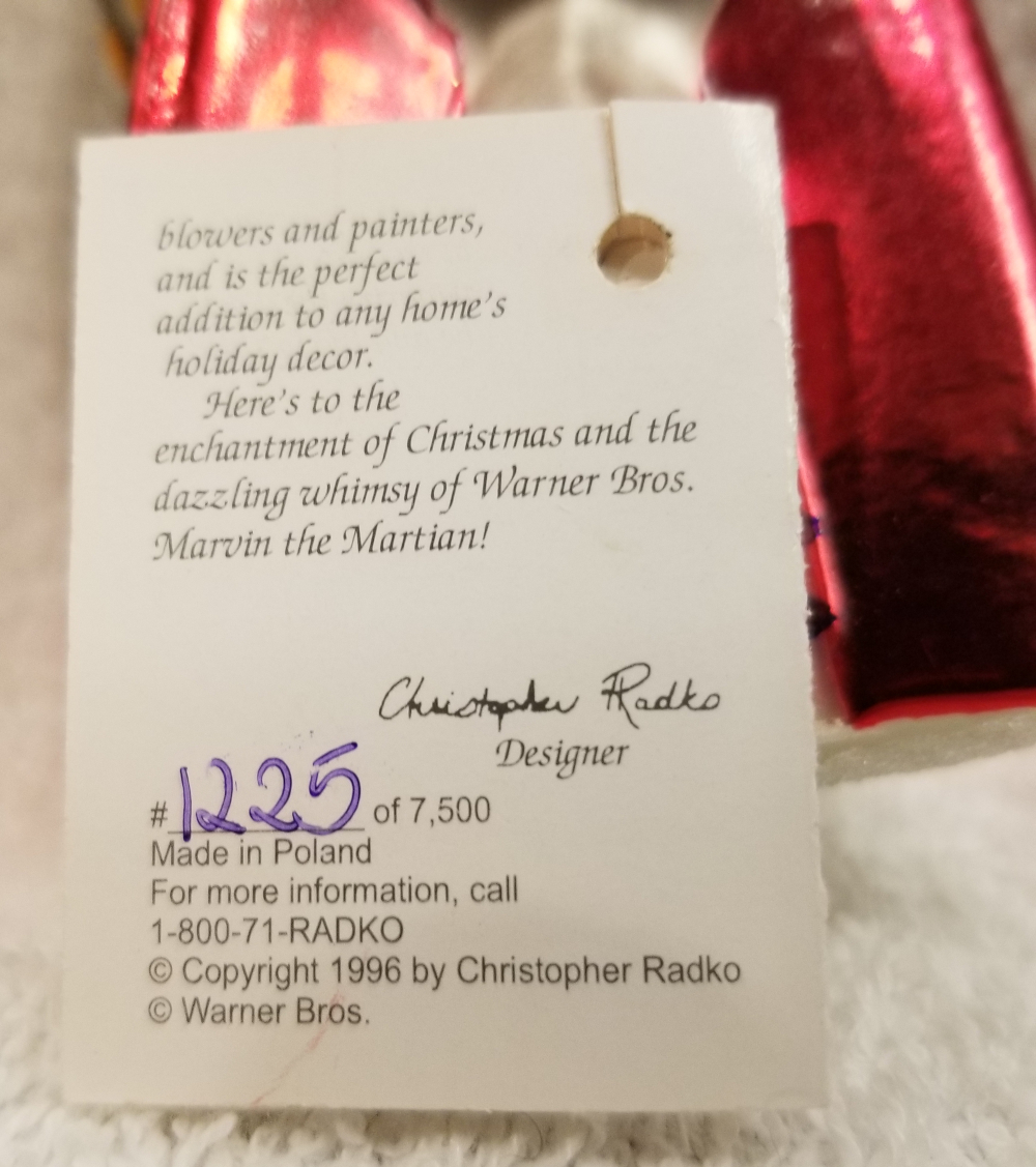 | This is an amazing limited-edition special! From 1997, this big one is Marvin the Martian from the Warner Brothers cartoon. Marvin is in his big silver rocket ship, which stands more than 7" tall. There were only 7500 produced and this is number 1225. The original paper tag is included. I'm asking $100 plus shipping via Pirate Ship. |