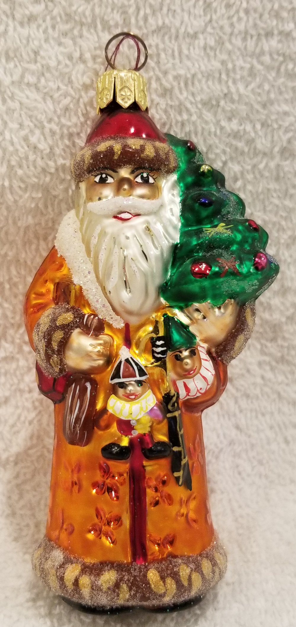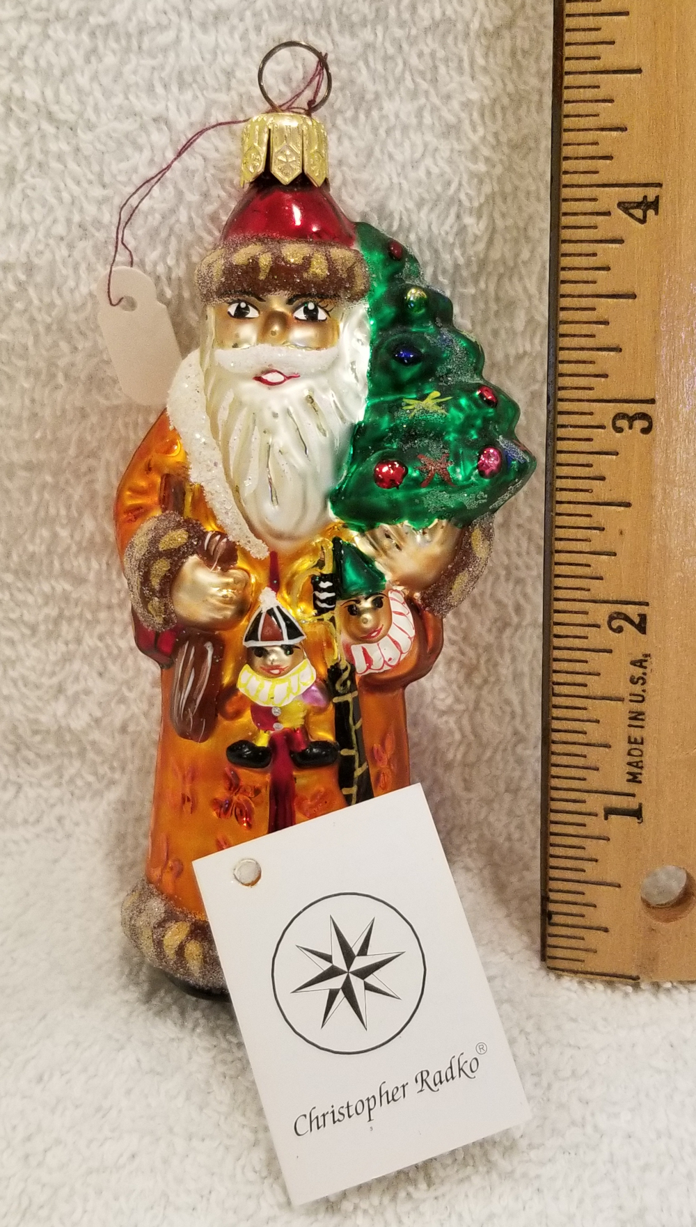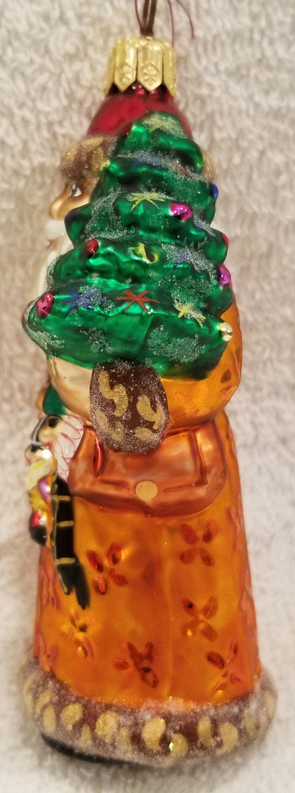 | I'm listing another beautiful Santa. This is Baby Balmoral Santa, Radko number 98-171-0. This is Santa in beautiful golden robes carrying a frosted Christmas tree and some gifts. The original paper tag is included. I'm asking only $30 plus shipping via Pirate Ship. |