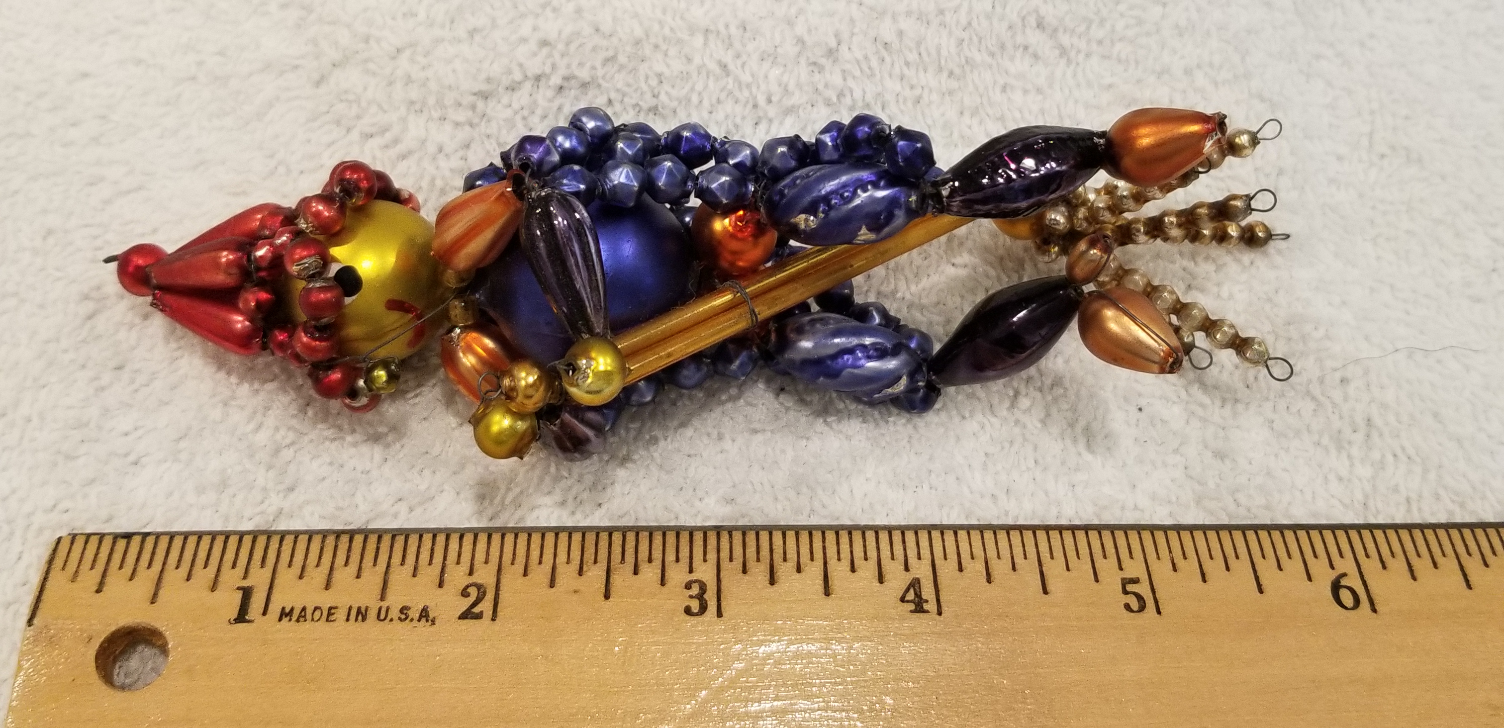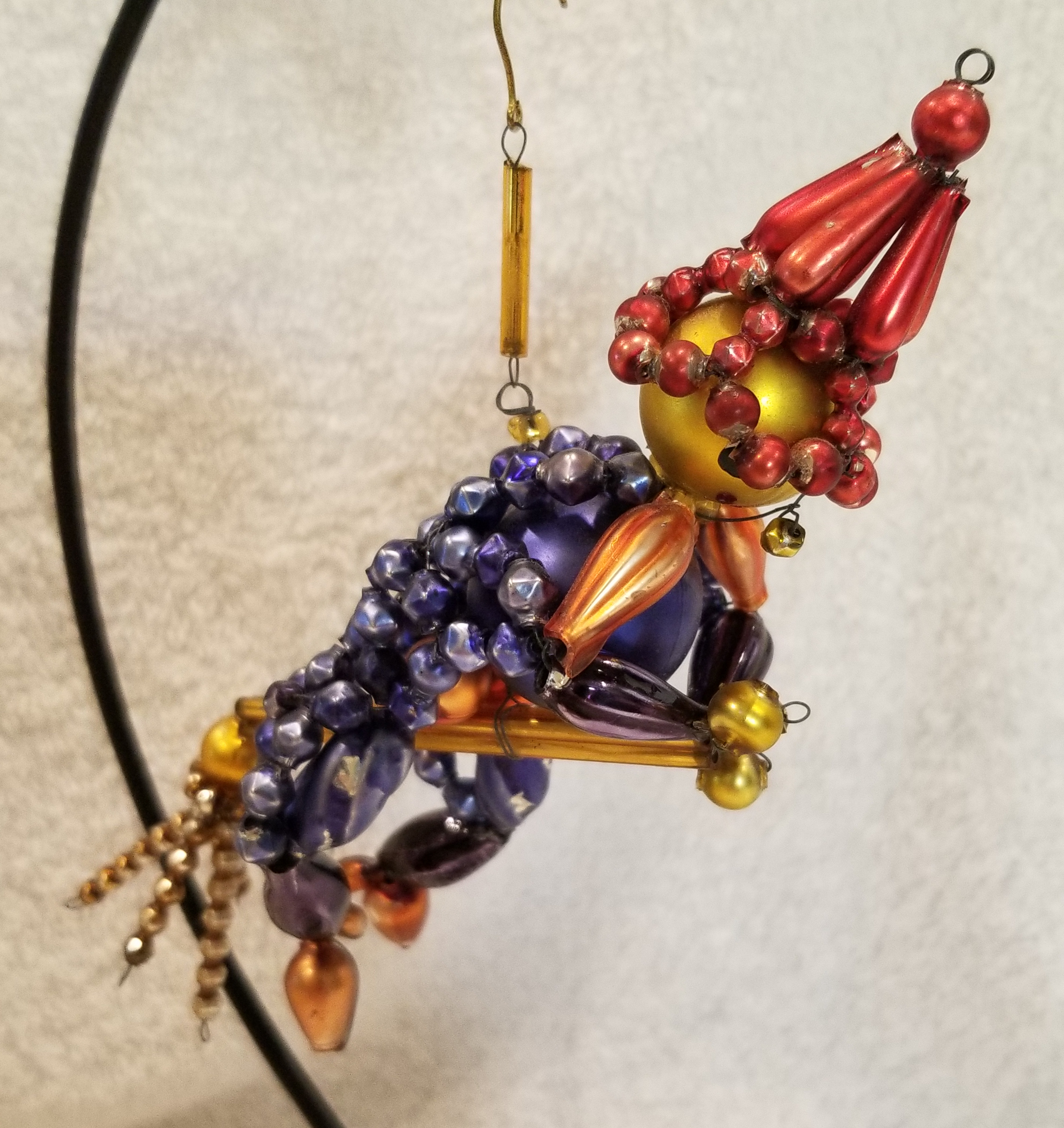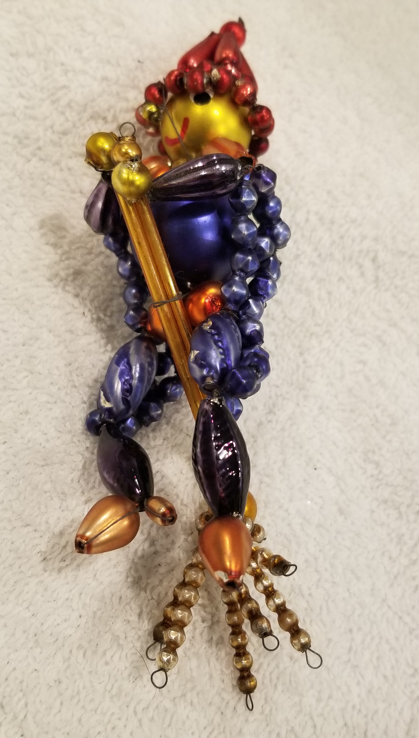 | This week I'm listing Halloween ornaments I just received! This is Broom With A View. Radko number 98-233-0. This amazing beaded ornament is a witch on a broomstick. Have a look at all the pictures! Some of the blue coating is coming off in a couple of small spots on the thighs, but otherwise the ornament is in great condition. You can see this in one of the pictures. The original paper tag is available. I'm asking $30 plus shipping via Pirate Ship however you prefer. Please ask if there are any questions and thanks for taking a look! |