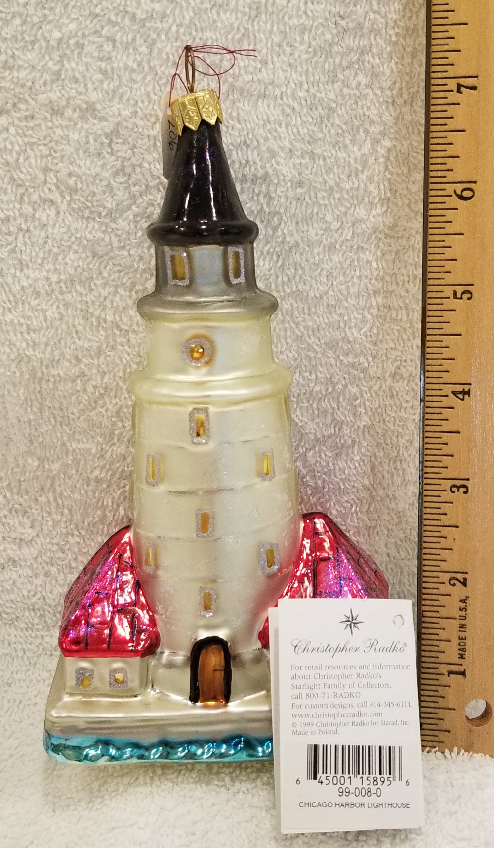 | Today I'm listing the Chicago Harbor Lighthouse, Radko number 99-008-00. This larger lighthouse is approx. 7" tall and has offices and living quarters at the base. The original paper tag is included. I'm asking $45 plus shipping via Pirate Ship. Please ask if there are any questions and thanks for taking a look! |