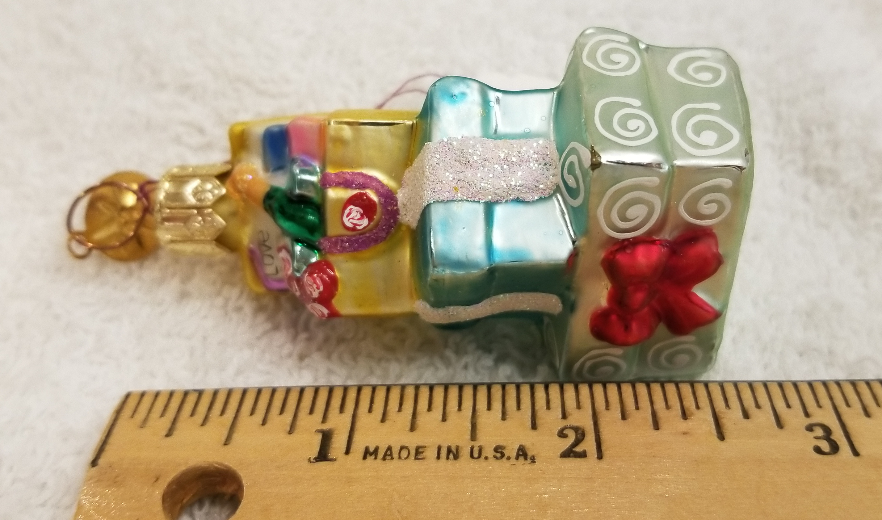 | Today I'm listing a beautiful pastel-colored stack of gifts. This is Just for You gem. Radko number 99-936-0. There's even a bottle of champagne on top! I hope the pictures do it justice. The original metal charm is still attached and the paper tag is available. I'm asking only $25 plus shipping via Pirate Ship however you prefer. |