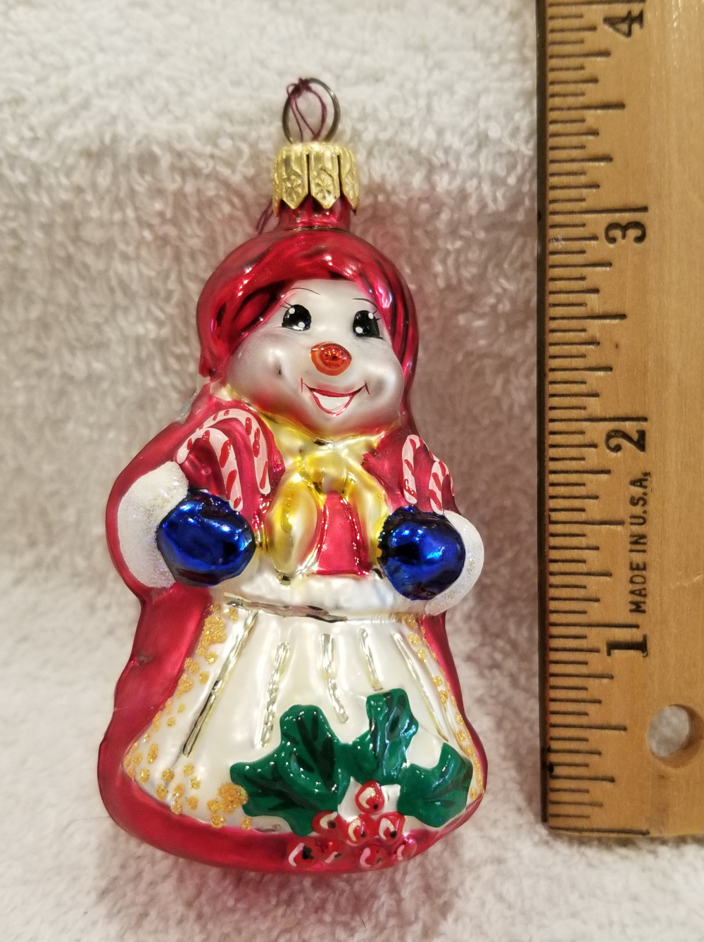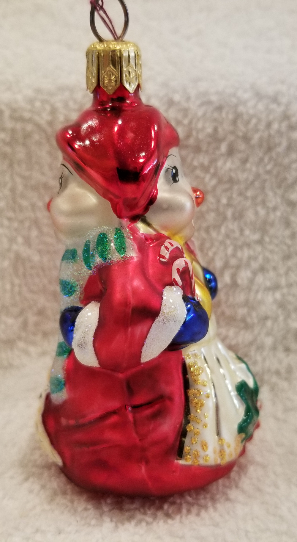 | Today I'm listing another cute double-sided ornament. This is Cool Couple, Radko number 99-961-0. This one features a snowwoman on one side and a snowman on the other. They are both wearing really pretty robes. Be sure to check out the pictures! I'm asking $25 plus shipping via Pirate Ship. |