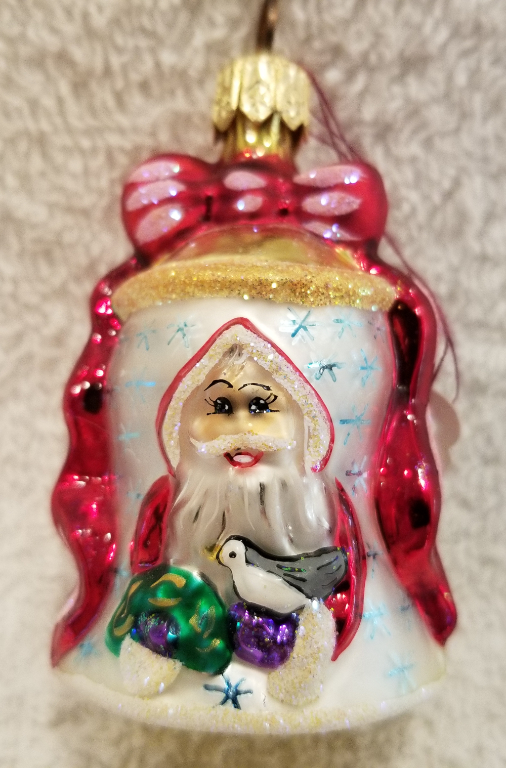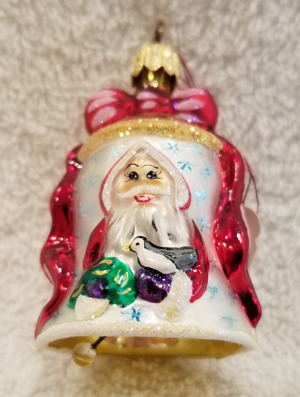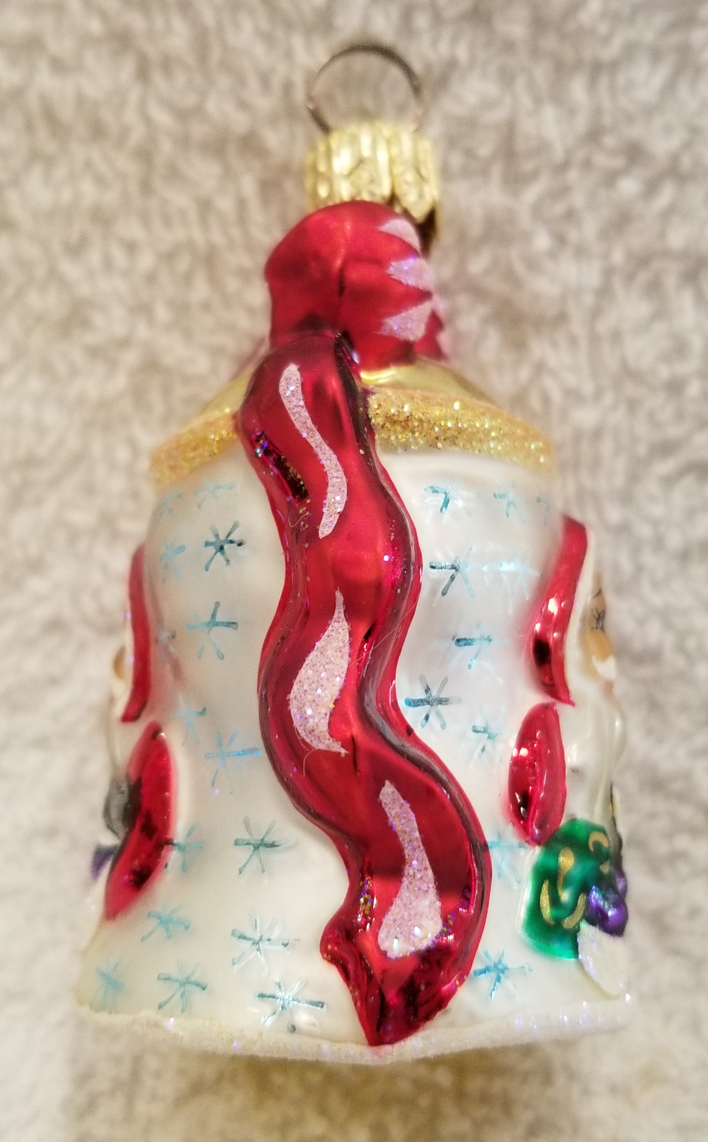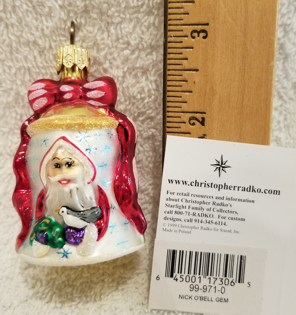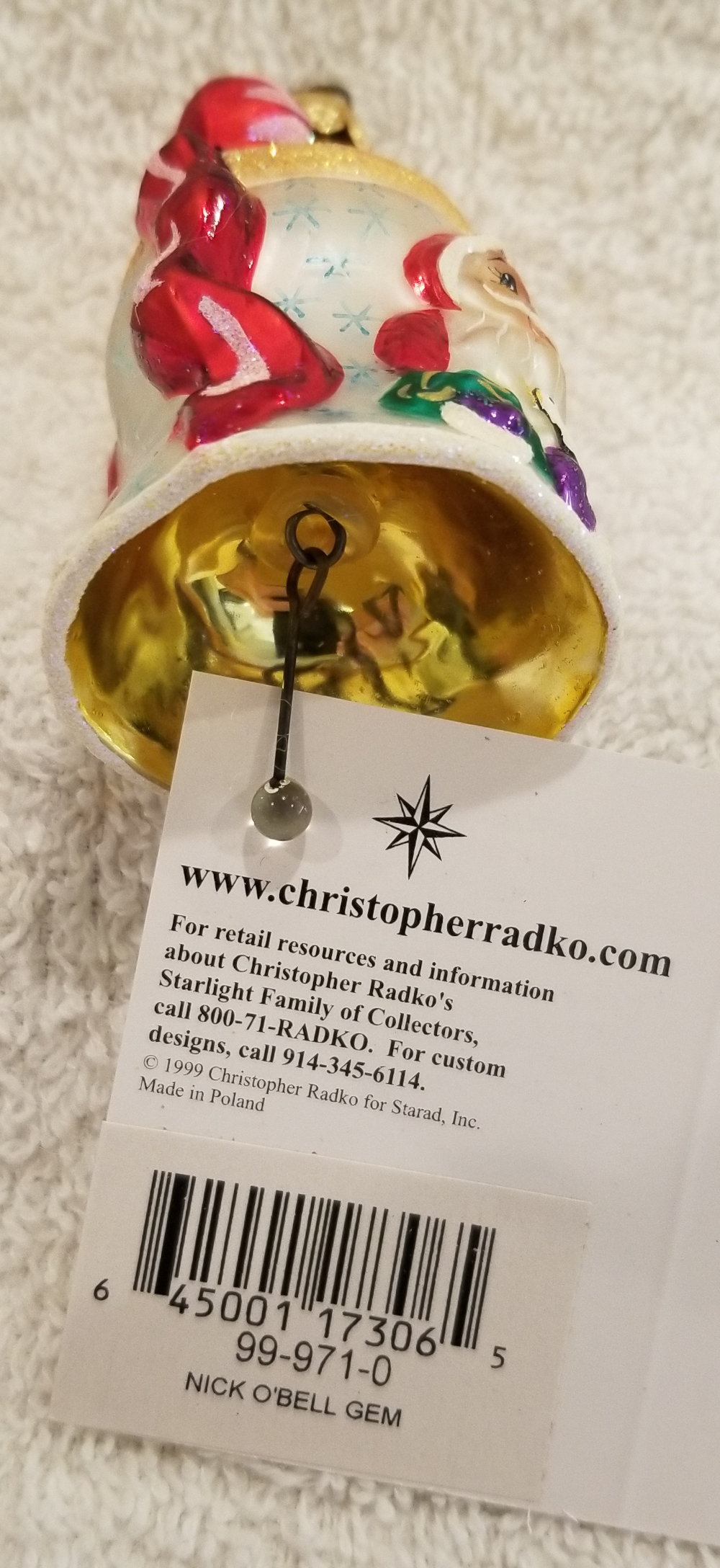 | I'm listing another cute bell. This is Nick O' Bell, Radko number 99-971-0. This is a white bell with Santa and red ribbons painted on the sides. The original paper tag is included. I'm asking only $25 plus shipping via Pirate Ship. |