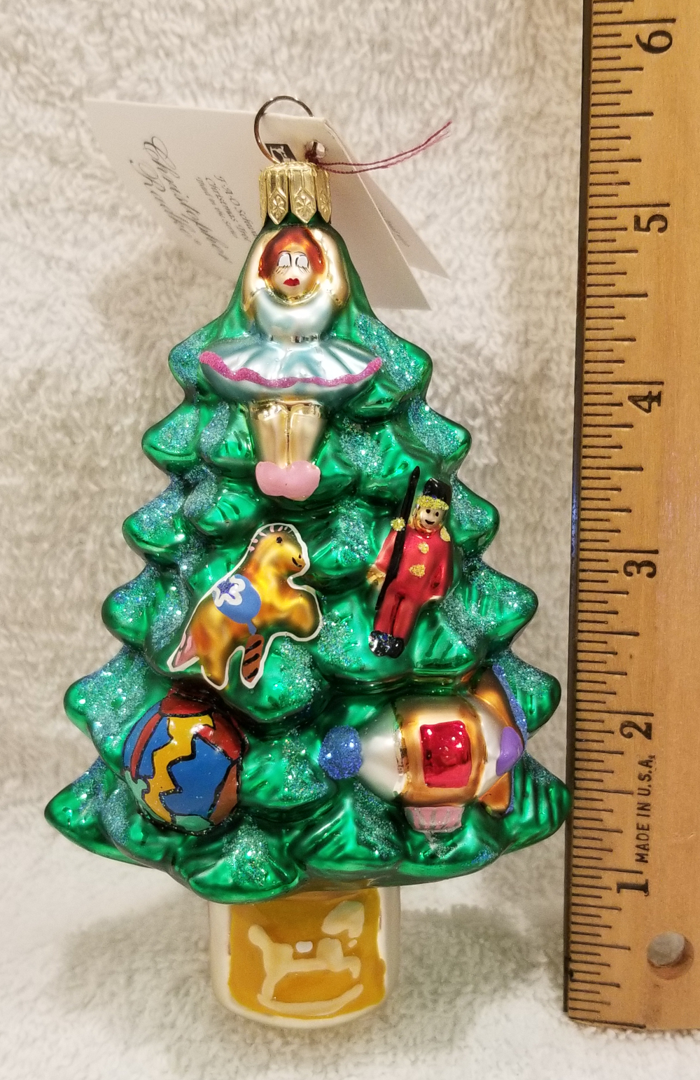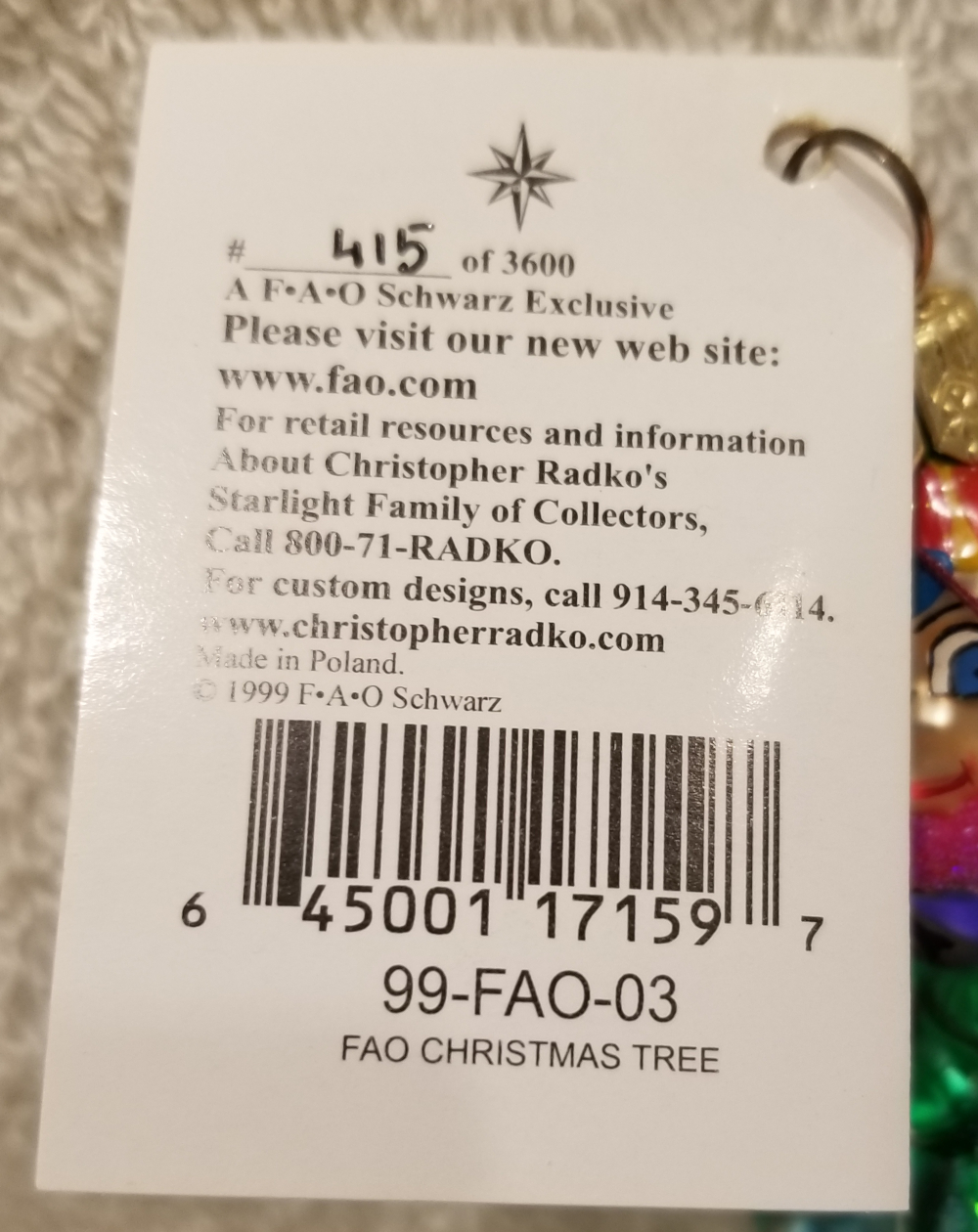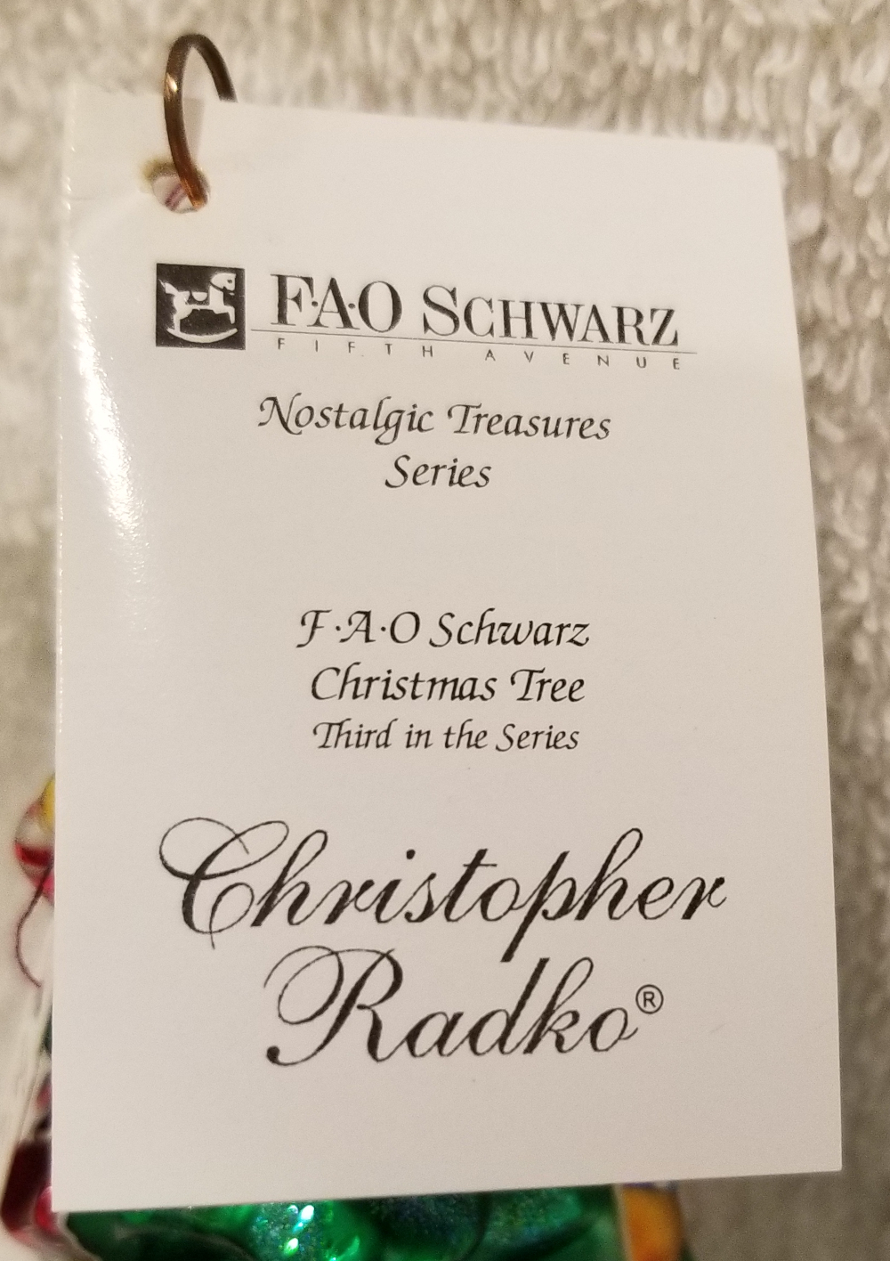 | Today I'm listing another FAO Schwarz Radko LIMITED-EDITION exclusive. FAO Christmas Tree, Radko number 99-FAO-03. This beautiful tree is adorned with a ballerina, soldier, ball train and many more ornaments. It is number 415 of only 3600 produced. The original paper tag is included. I'm asking $35 plus shipping via Pirate Ship. |