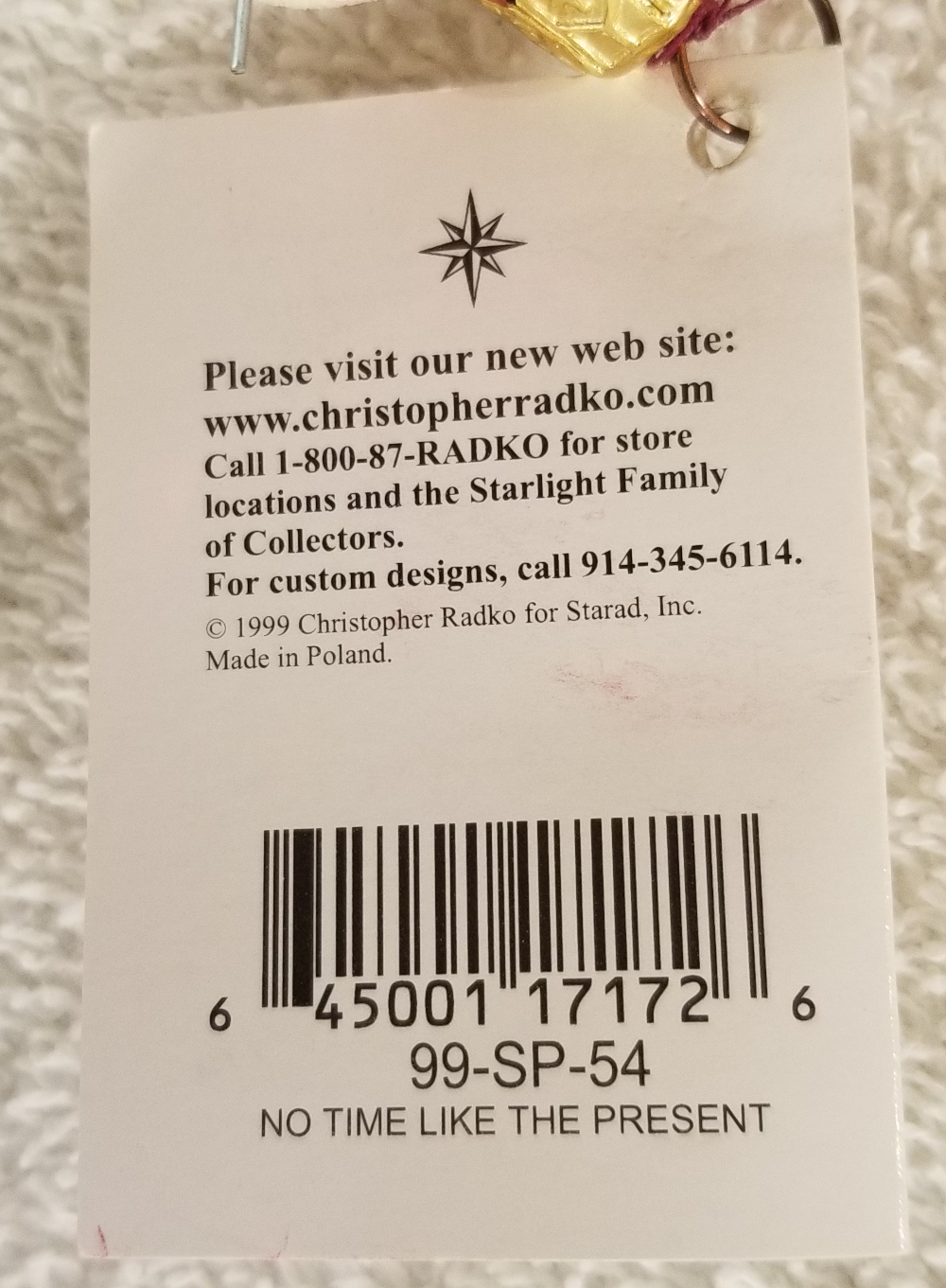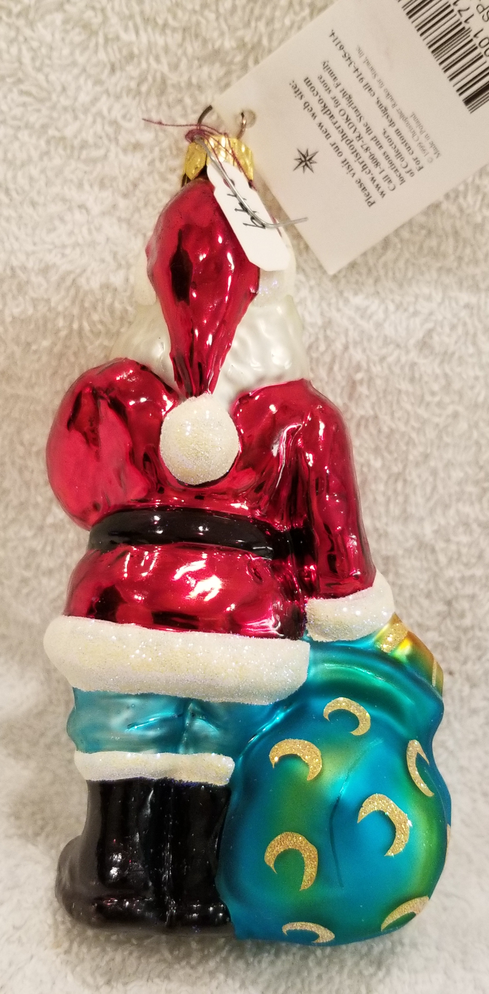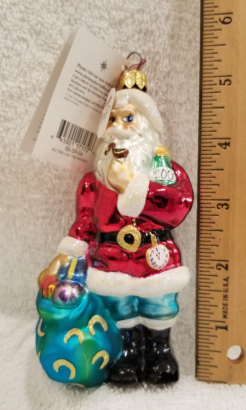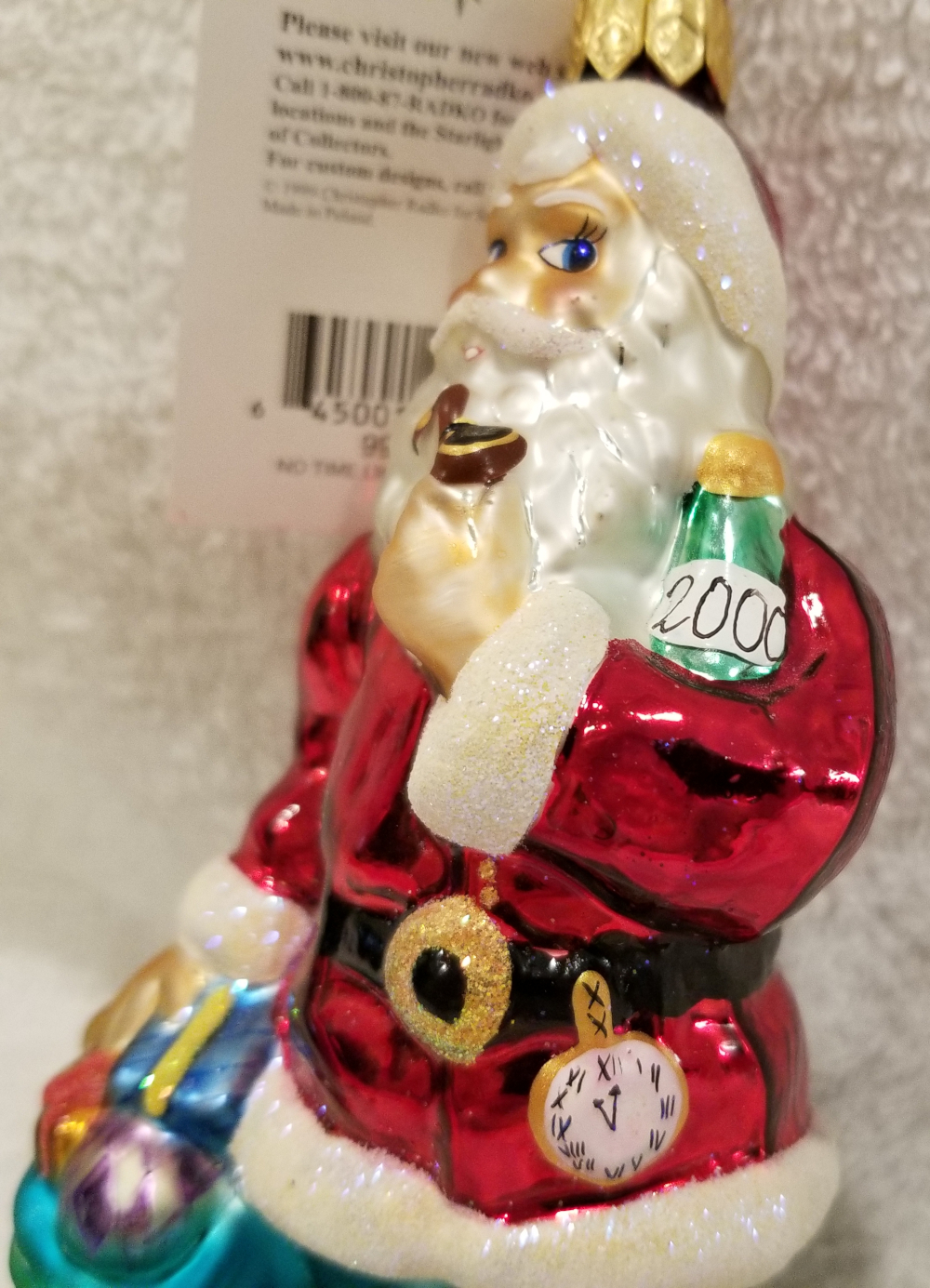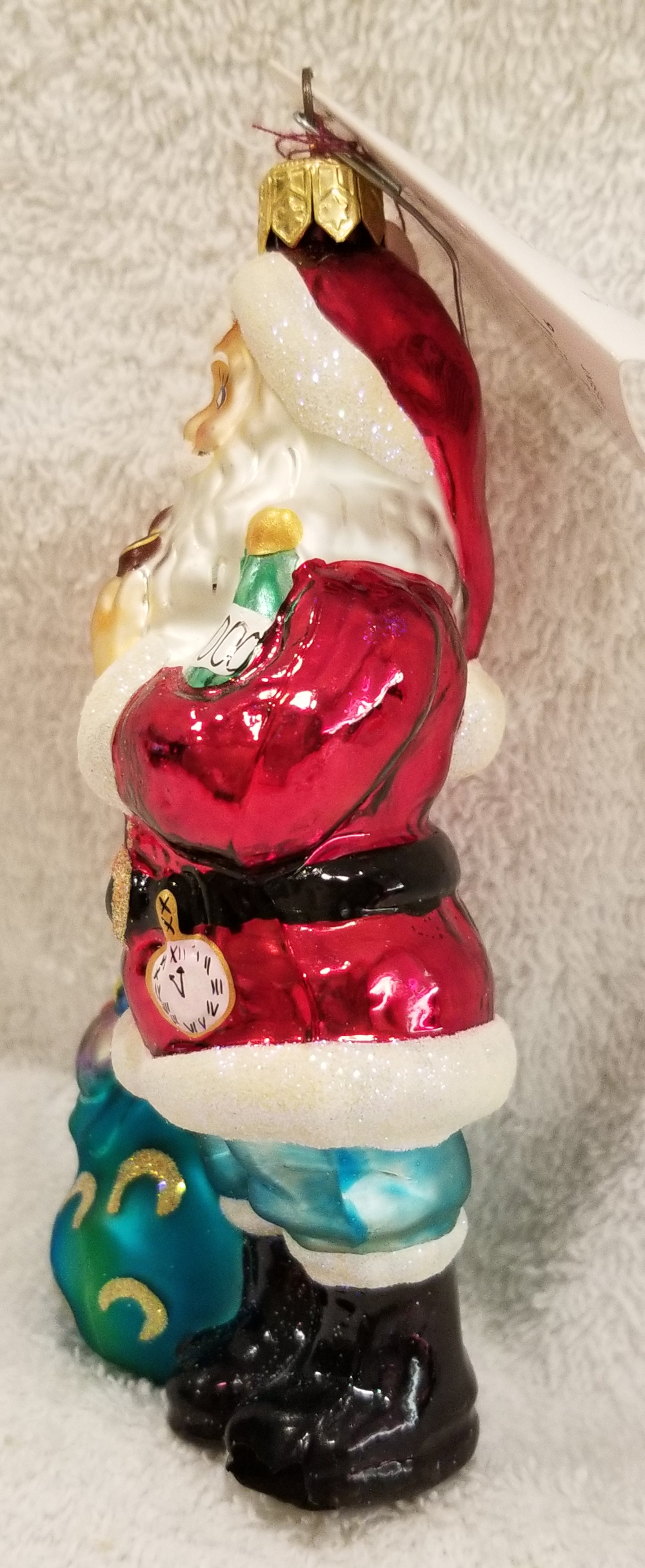 | Today I'm listing another cute Santa ornament. This is "No Time Like the Present", Radko number 99-SP-54. This is Santa standing next to a big sack of gifts. He's holding his pipe and is that a champagne bottle he's holding, too? The original paper tag is included. I'm asking $35 plus shipping via Pirate Ship. |