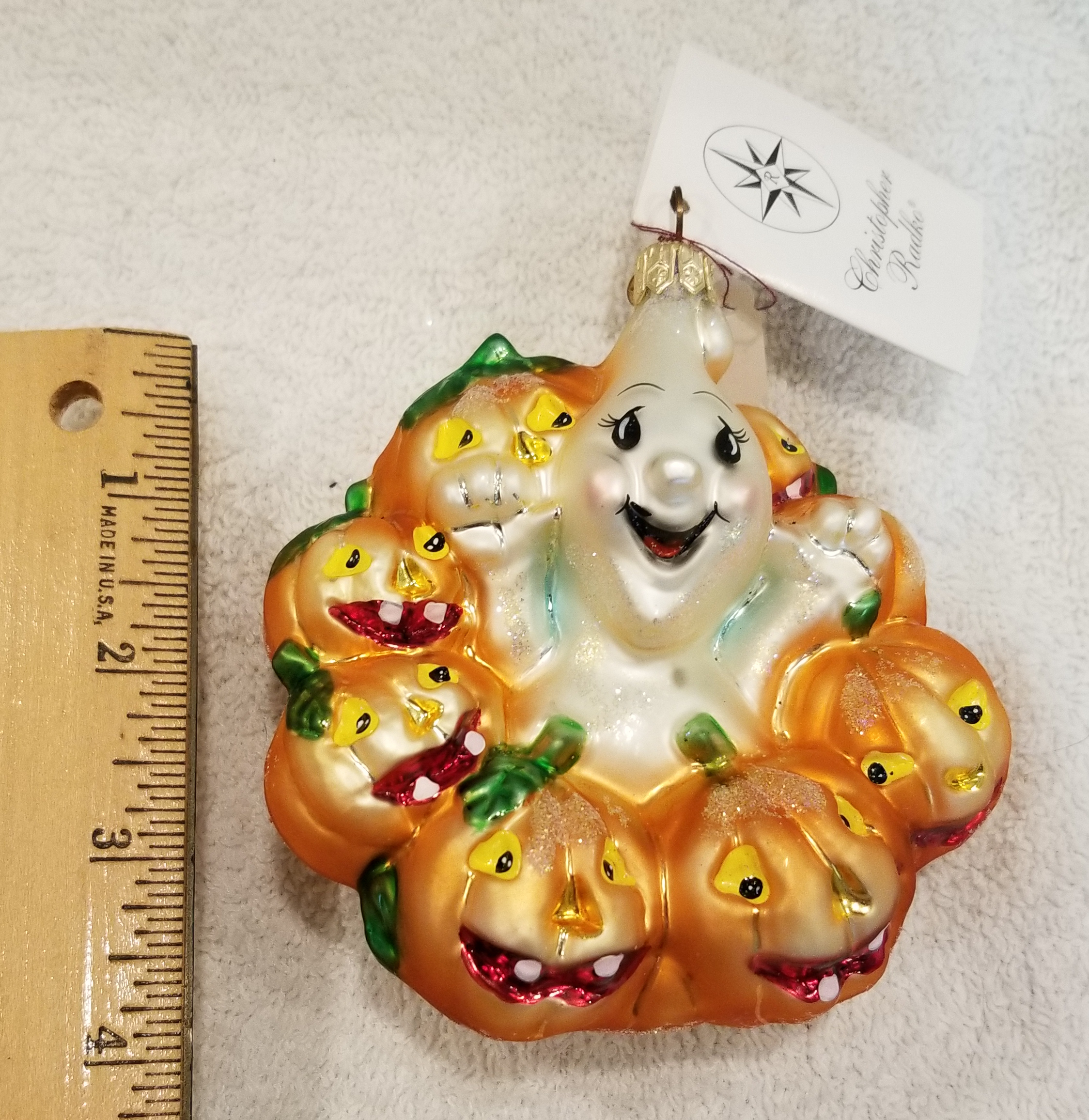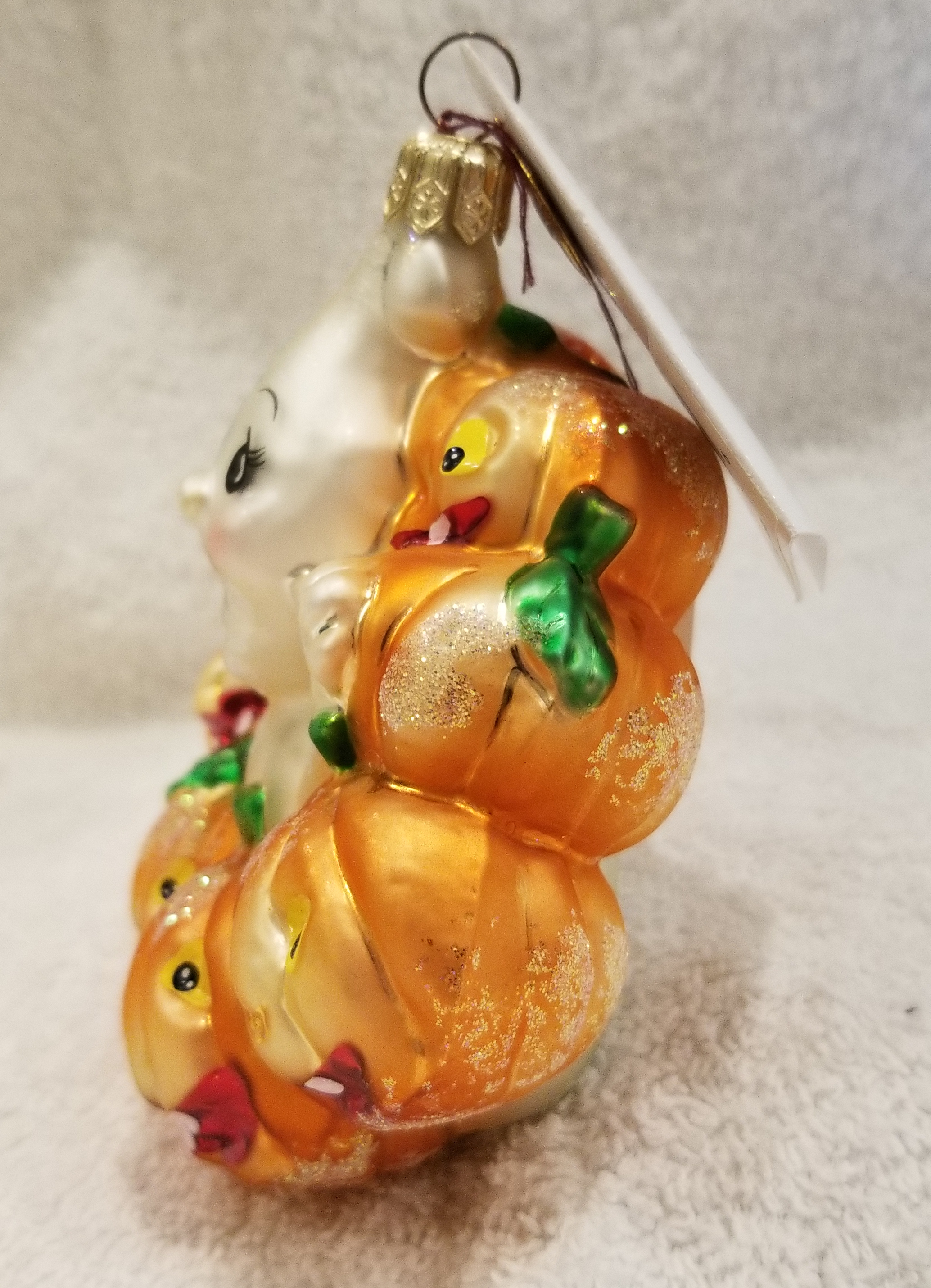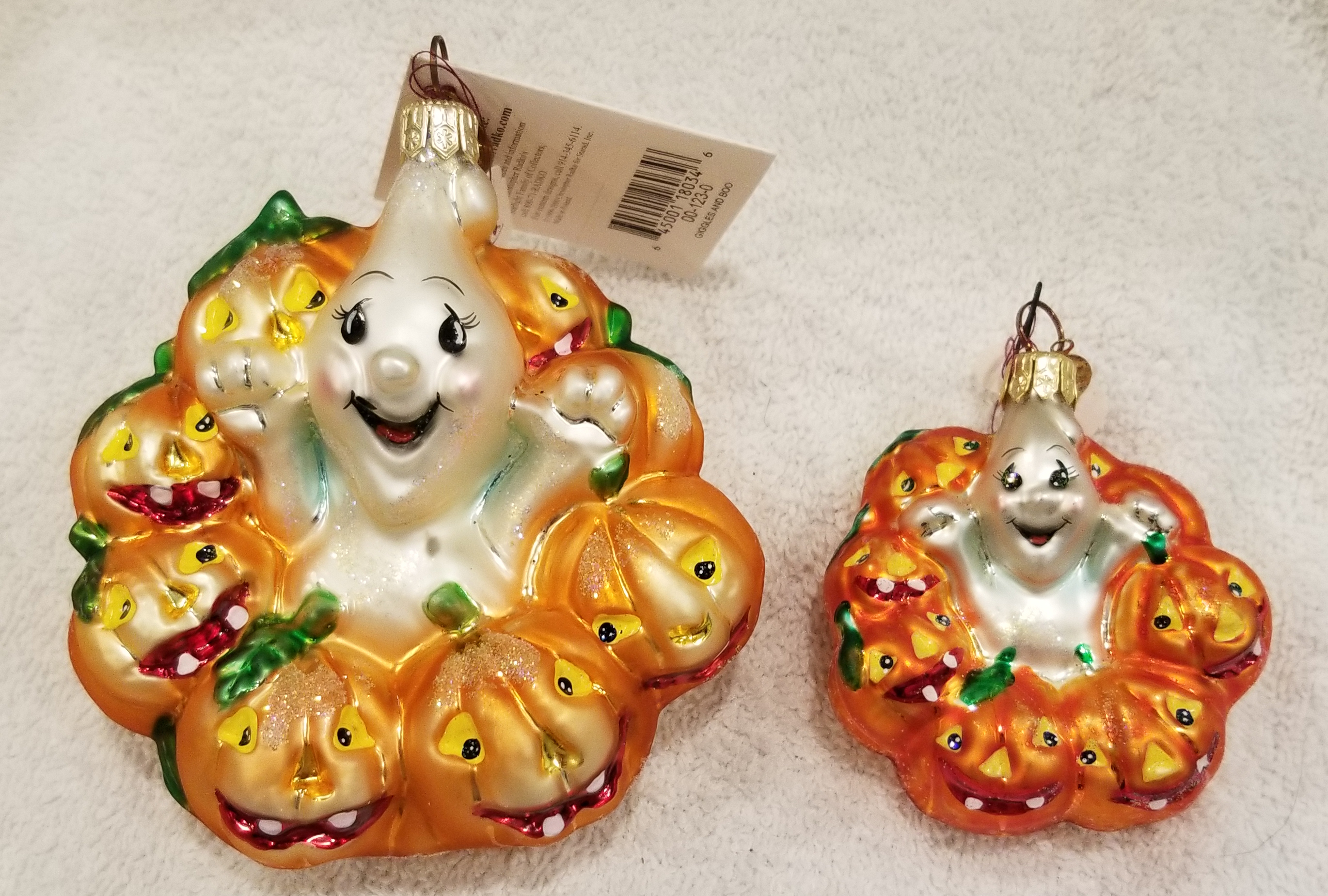 | This week I'm listing Halloween ornaments I just received! This one is Giggles and Boo, Radko number 00-123-0. This is a larger version of the gem I will also be listing. This is the 4" version, the gem is the 3" version. I am including a picture of both for size reference. They are otherwise identical to my eyes. The original metal charm and paper tag are still attached. I'm asking $40 plus shipping via Pirate Ship however you prefer. |