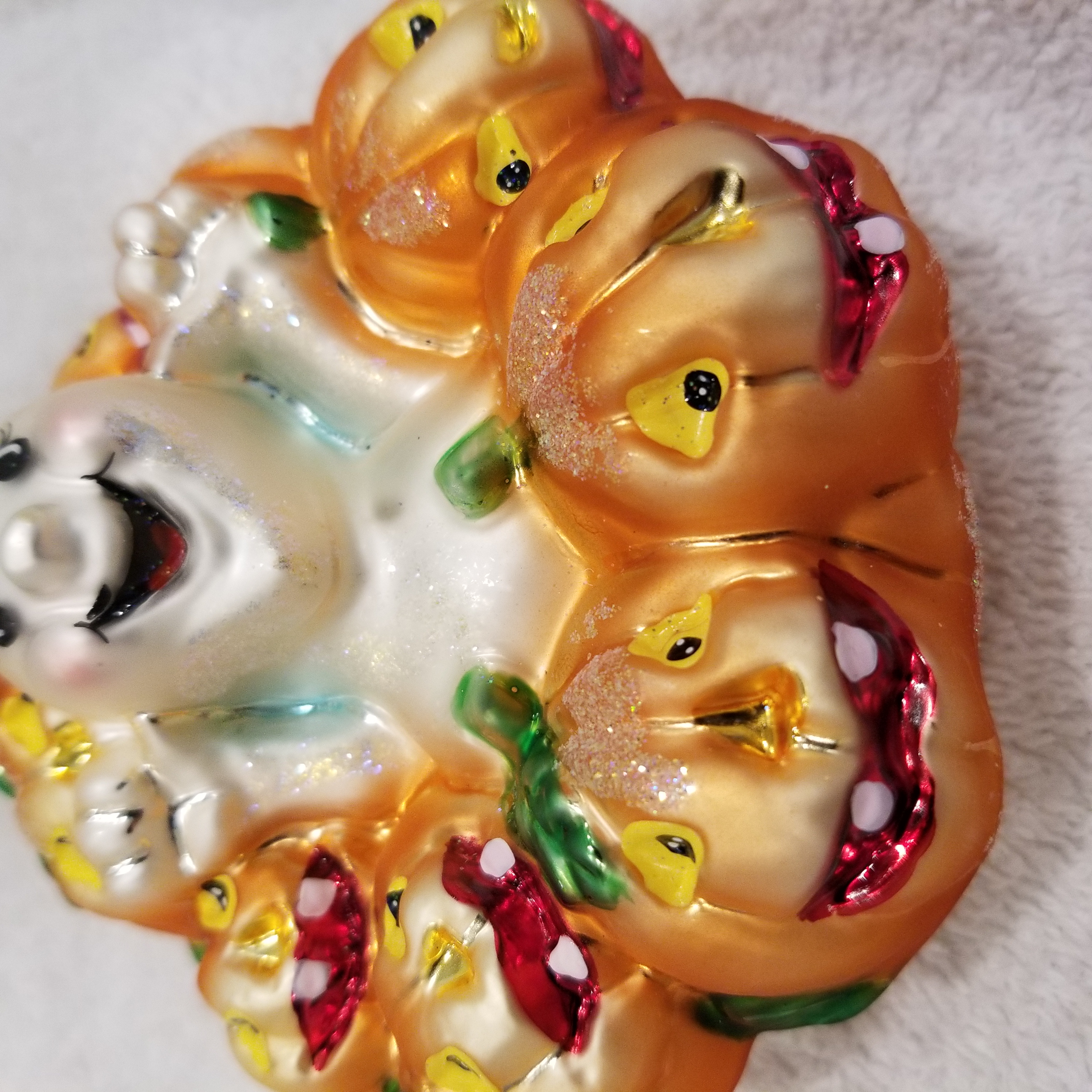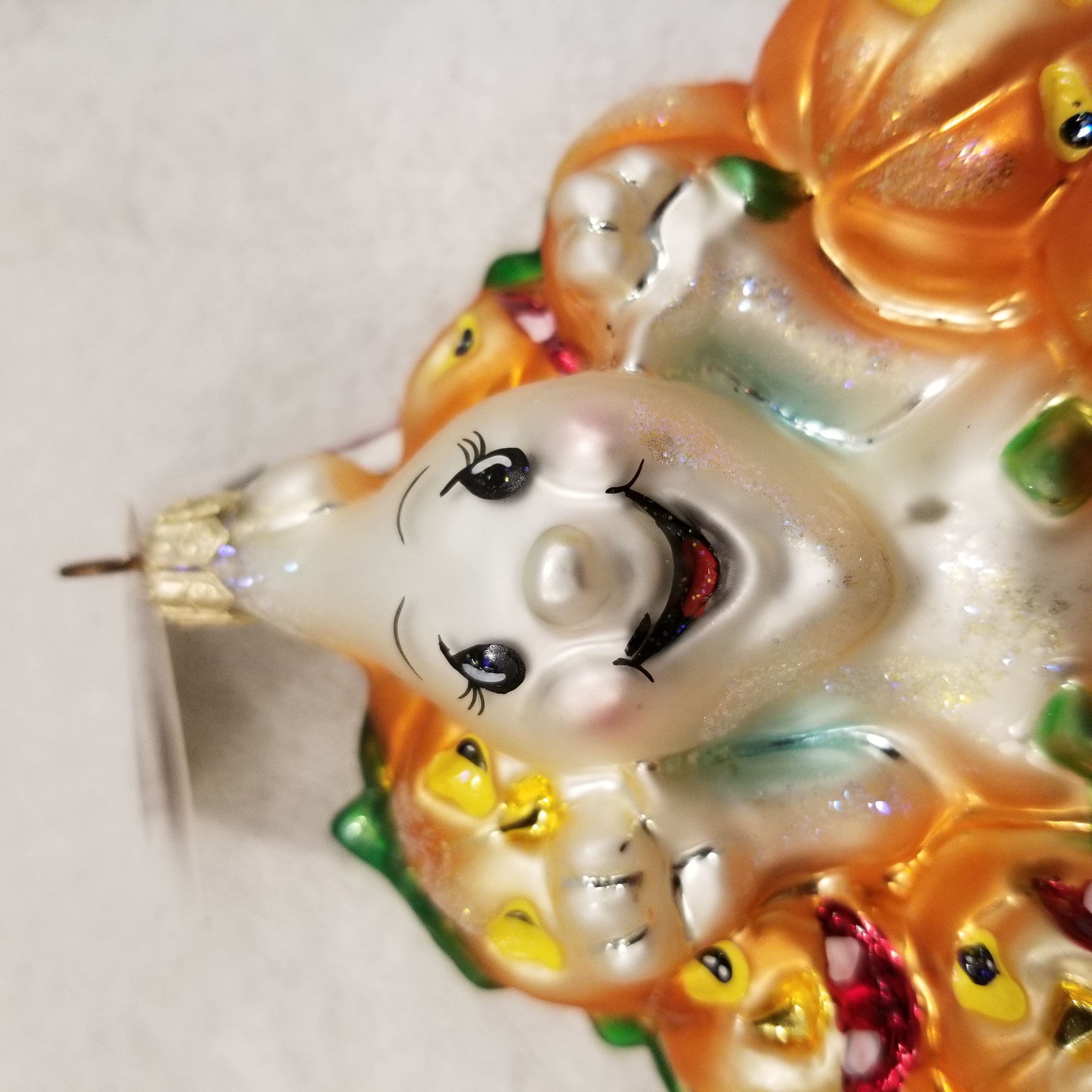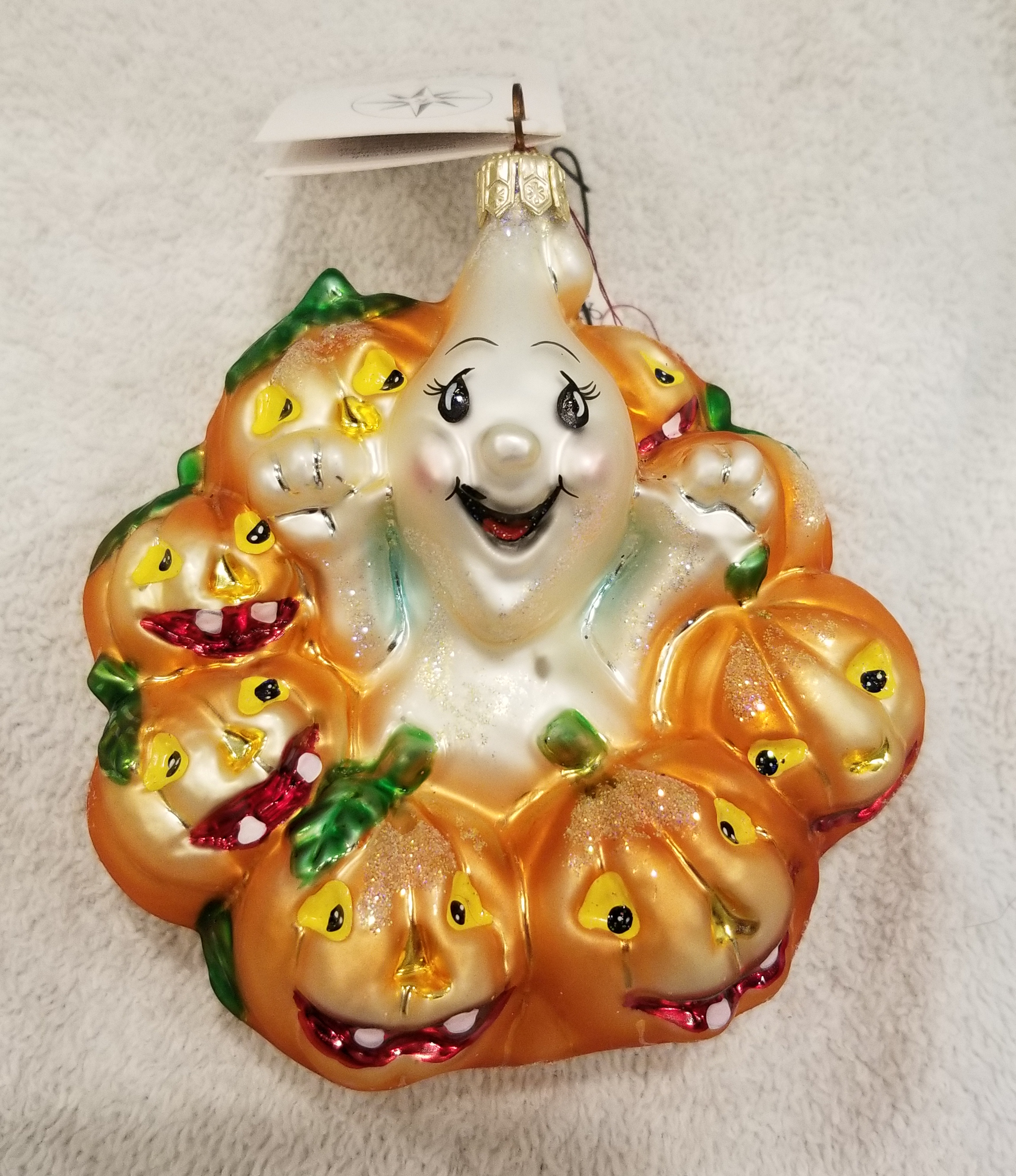| This week I'm listing Halloween ornaments I just received! This one is Giggles and Boo, Radko number 00-123-0. This is a larger version of the gem I will also be listing. This is the 4" version, the gem is the 3" version. I am including a picture of both for size reference. They are otherwise identical to my eyes. The original metal charm and paper tag are still attached. I'm asking $40 plus shipping via Pirate Ship however you prefer. |