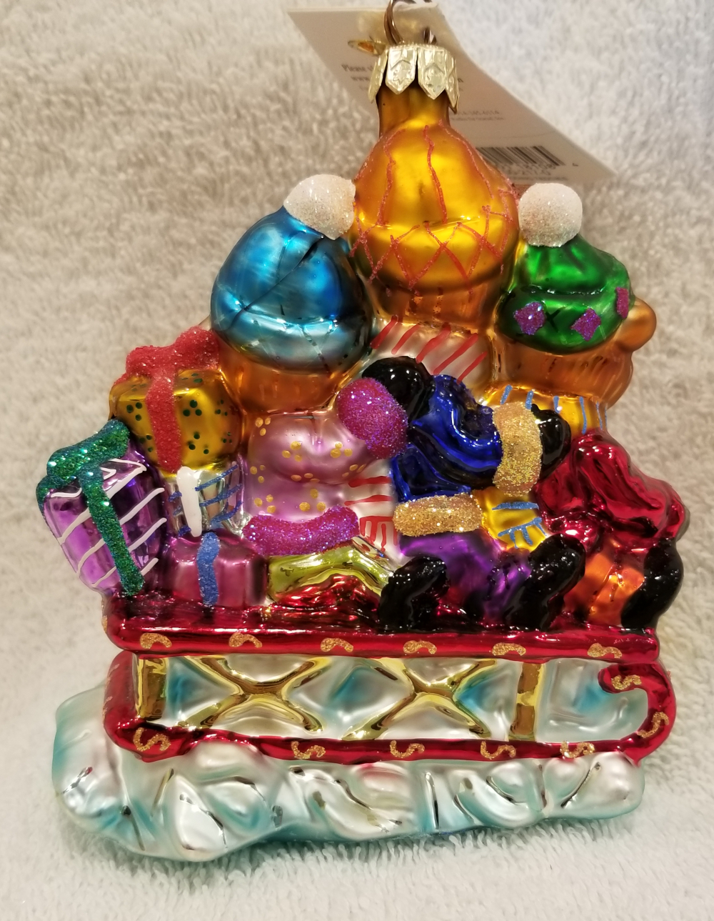 | Today I'm listing another cute bear ornament. This is Sledding Teddies, Radko number 00-217-0. This one features three smiling teddy bears riding a red and gold sled surrounded by a huge pile of pretty presents. The original metal charm and the paper tag are included. I'm asking $30 plus shipping via Pirate Ship. |