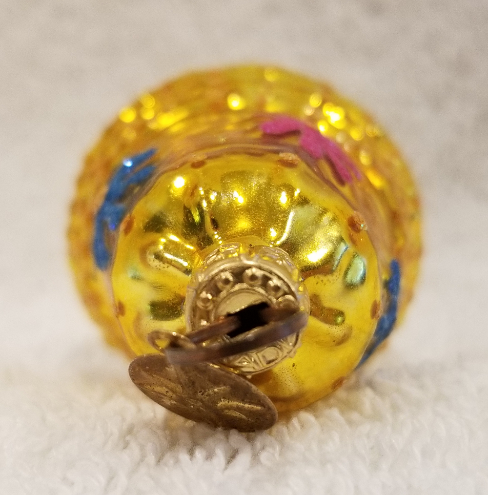 | Today I'm listing a cute gem-size bell. This is Tinkle Bell , Radko number 01-0324-0. This is a yellow bell with red and blue flowers along the outside. The original metal charm is attached and the paper tag is included. I'm asking $25 plus shipping via Pirate Ship. |