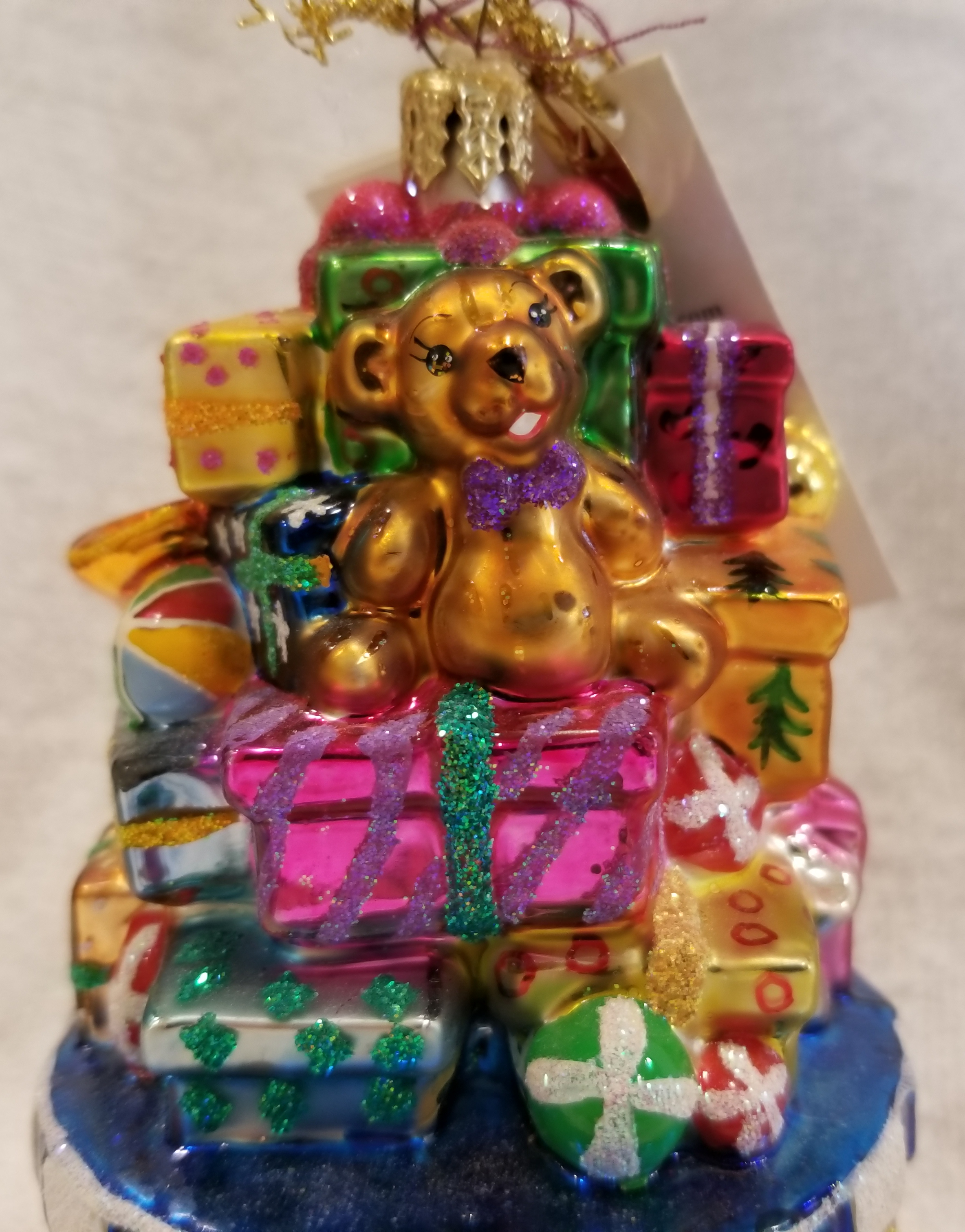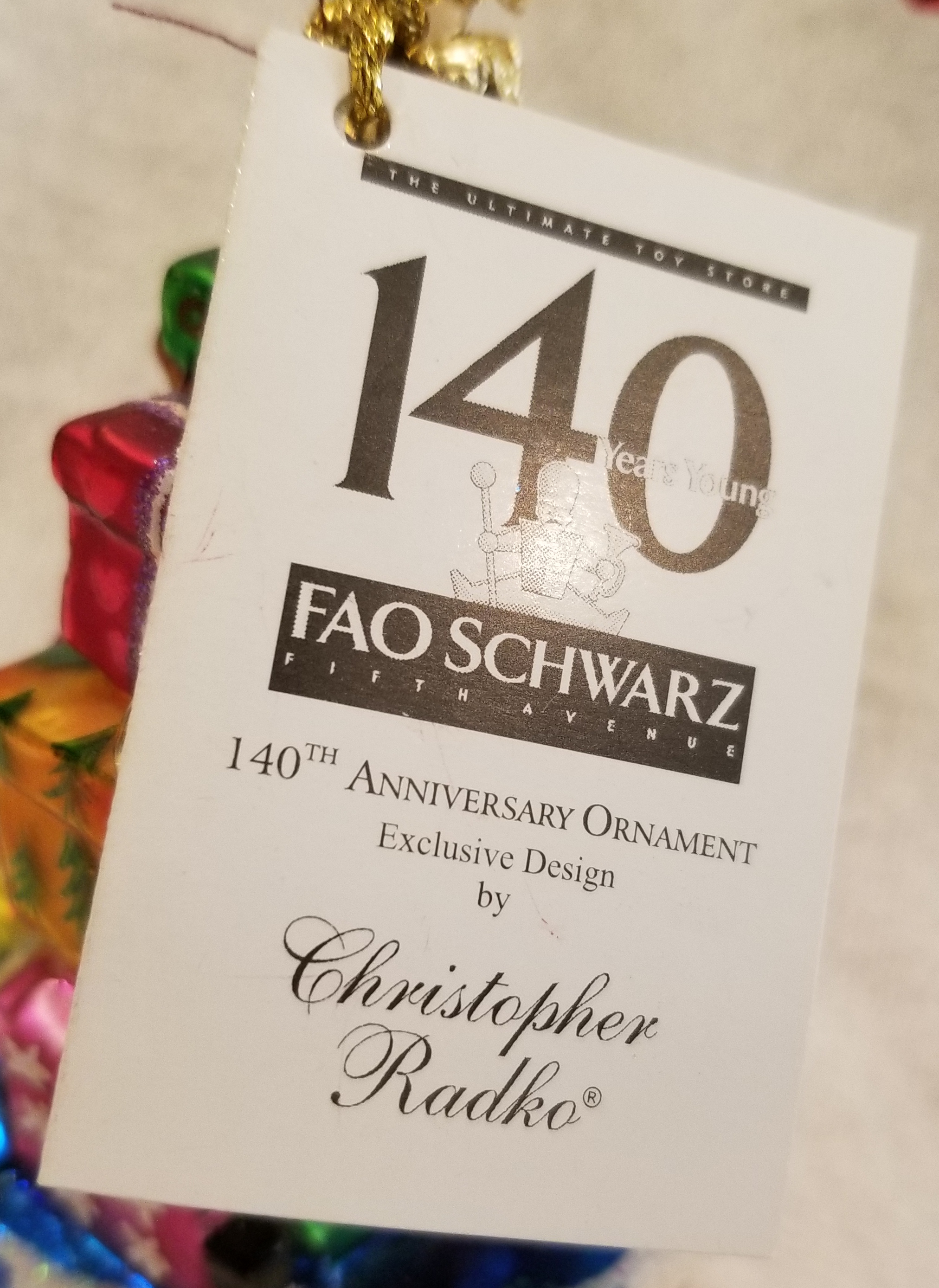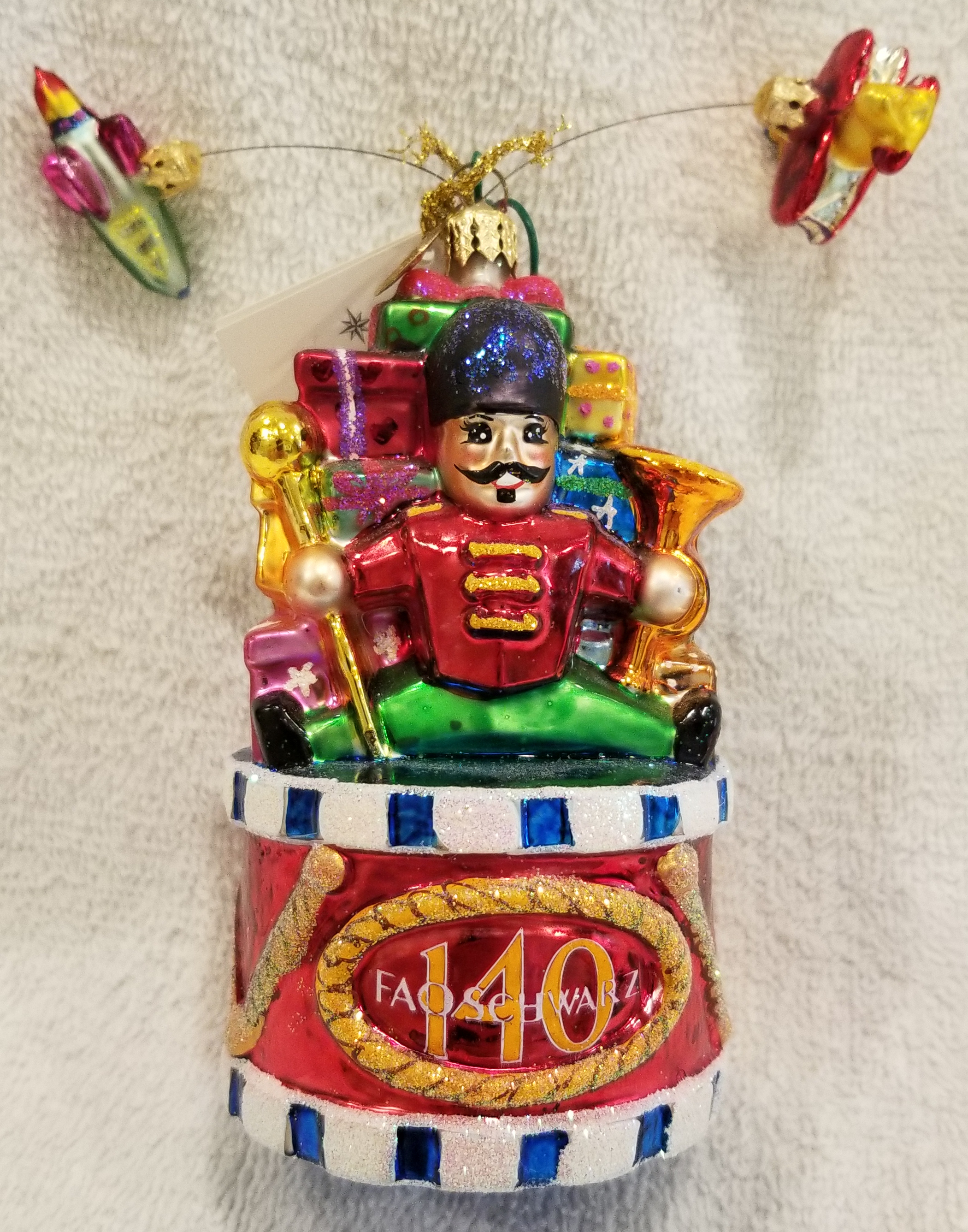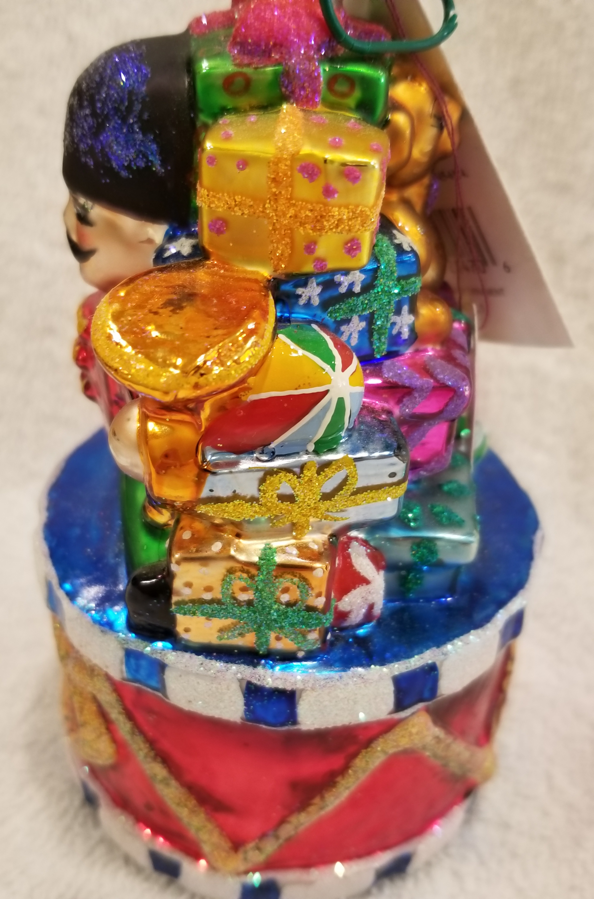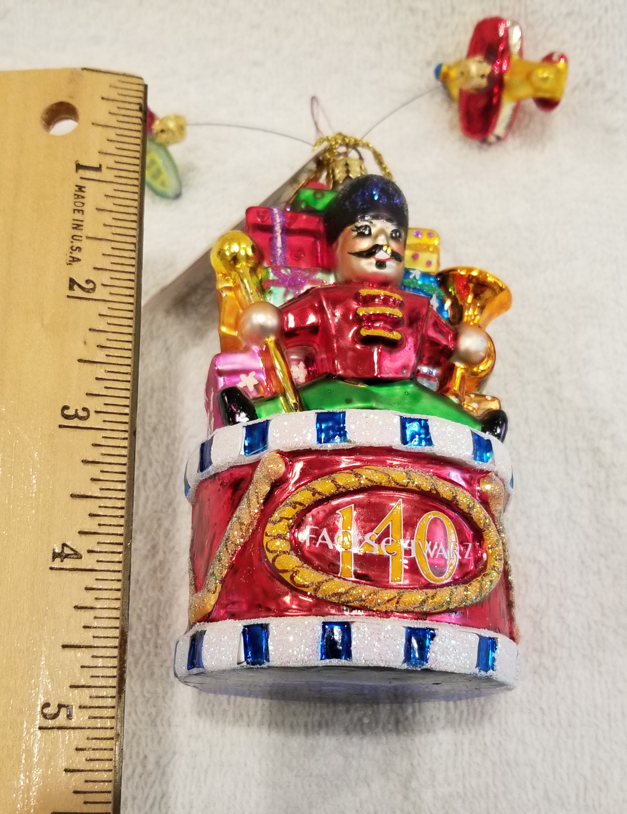 | I'm listing more FAO Schwarz exclusive ornaments. This is for a really special one! This is the 140th anniversary ornament. Radko number 01-FAO-01. The ornament features a nutcracker/soldier/bandmember sitting on a large drum. There are gifts stacked. Coming out of the presents is a rocket ship and airplane. Both are hanging on wire and bob around. The original metal charm and paper tag are attached. Be sure to take a look at all the great pics! I'm asking $50 plus shipping via Pirate Ship however you prefer. Please ask if there are any questions and thanks for taking a look! |